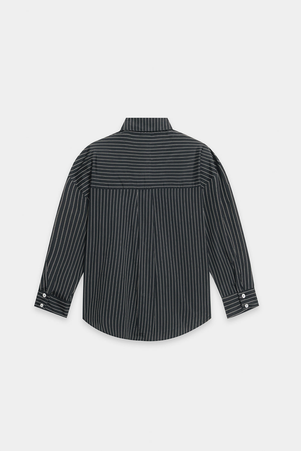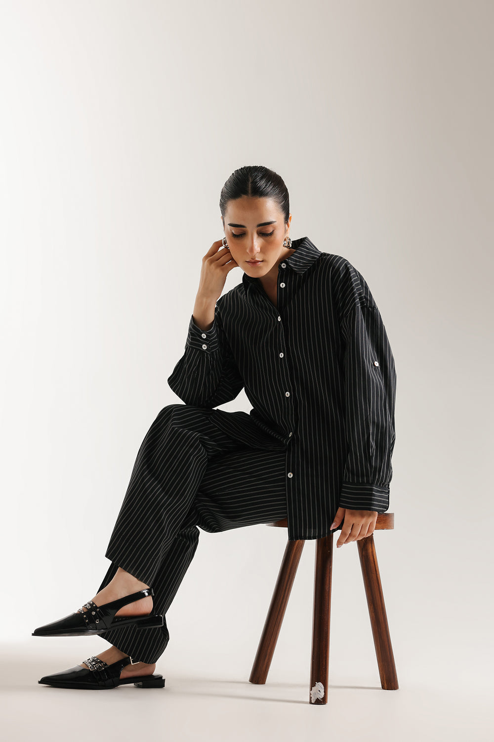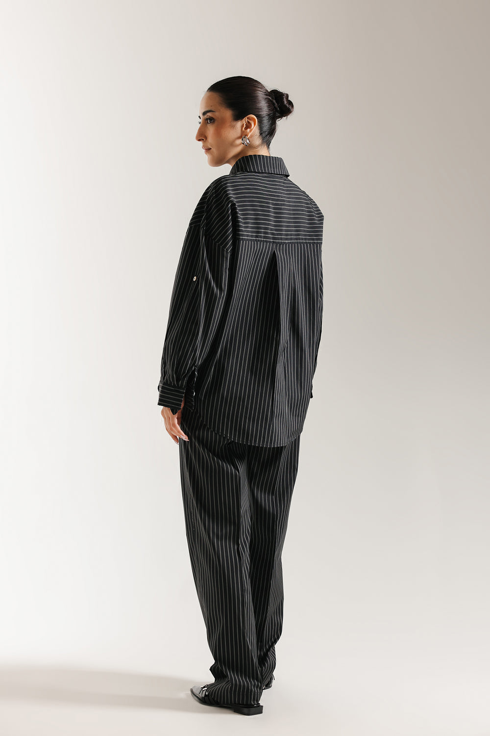 Command attention with the bold sophistication of this striped suit. This contemporary co-ord set features a relaxed-fit button-down shirt and matching trouser, both crafted in a striking black fabric with a subtle yet crisp white pinstripe pattern. The shirt maintains a classic collar and full-length sleeves in an easy, slightly relaxed silhouette, while the trouser offer a comfortable, high-waisted fit. This two-piece set is the epitome of modern tailoring, offering a timeless, monochromatic look with a hint of power dressing.
