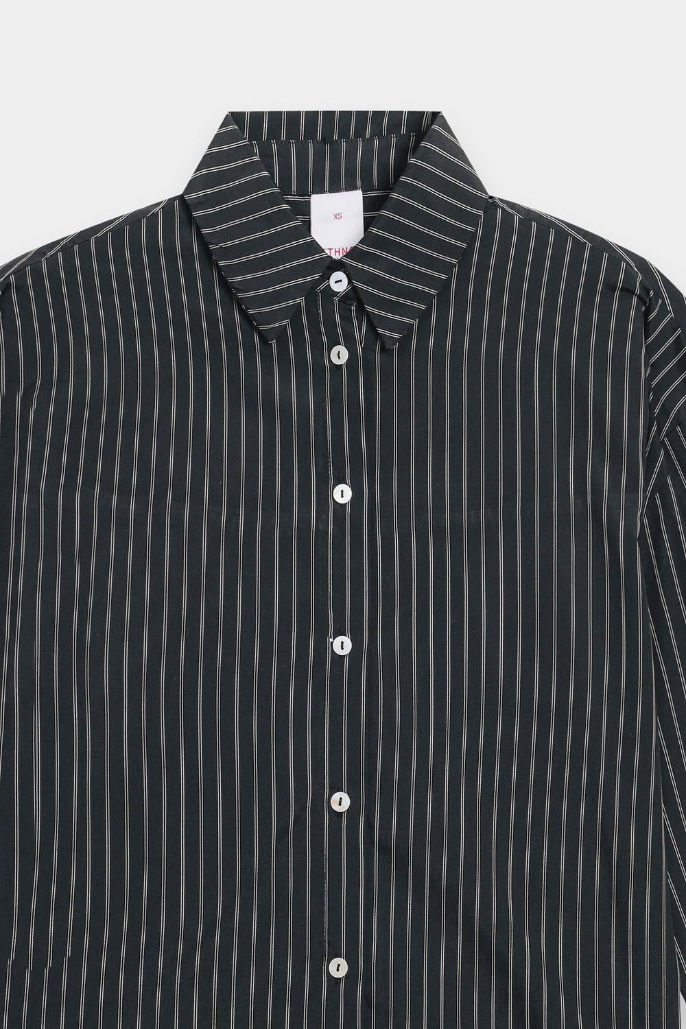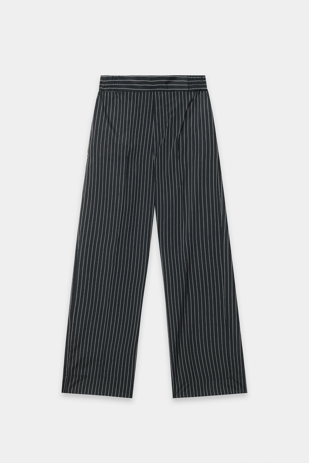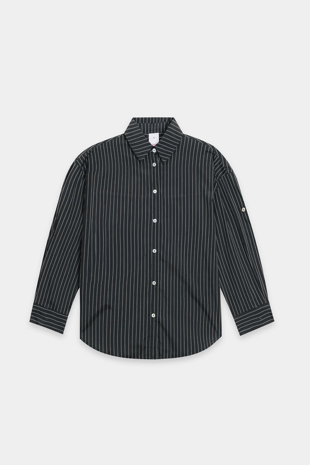 Command attention with the bold sophistication of this striped suit. This contemporary co-ord set features a relaxed-fit button-down shirt and matching trouser, both crafted in a striking black fabric with a subtle yet crisp white pinstripe pattern. The shirt maintains a classic collar and full-length sleeves in an easy, slightly relaxed silhouette, while the trouser offer a comfortable, high-waisted fit. This two-piece set is the epitome of modern tailoring, offering a timeless, monochromatic look with a hint of power dressing.
