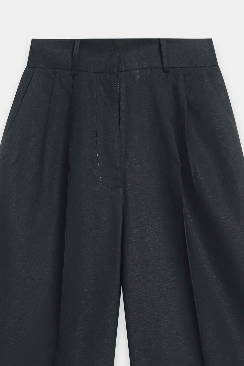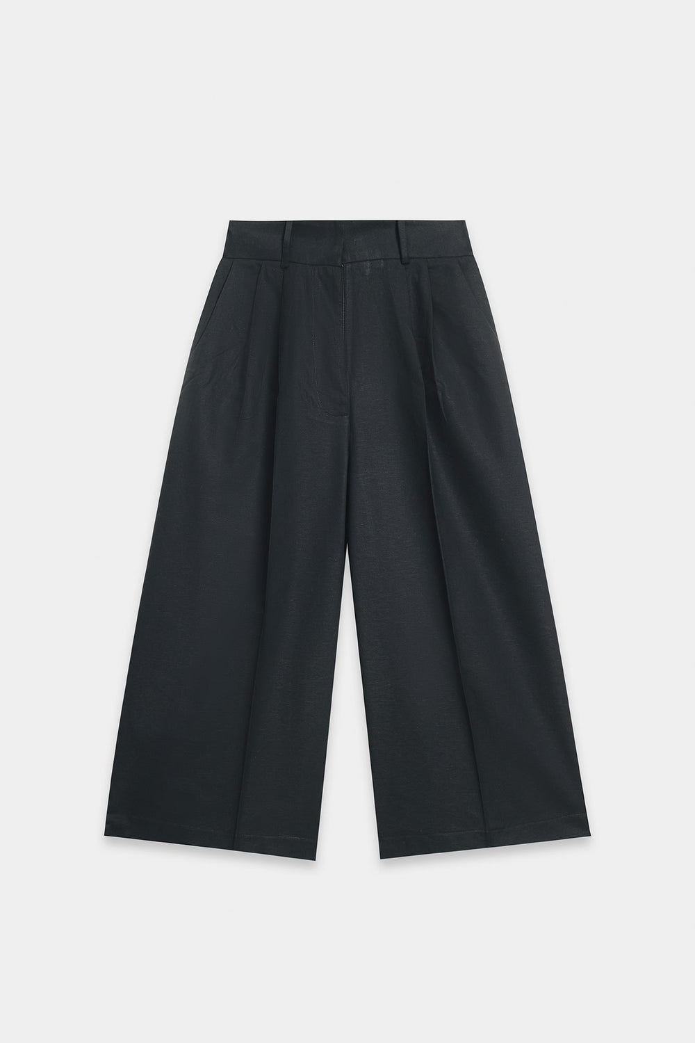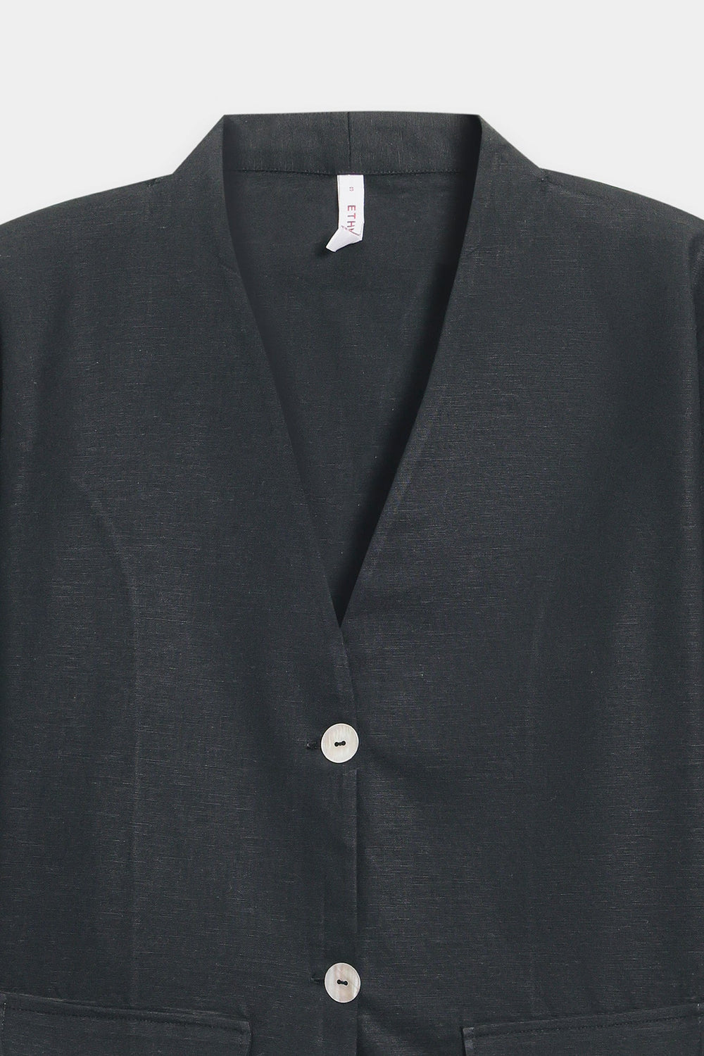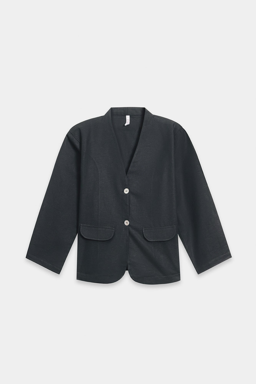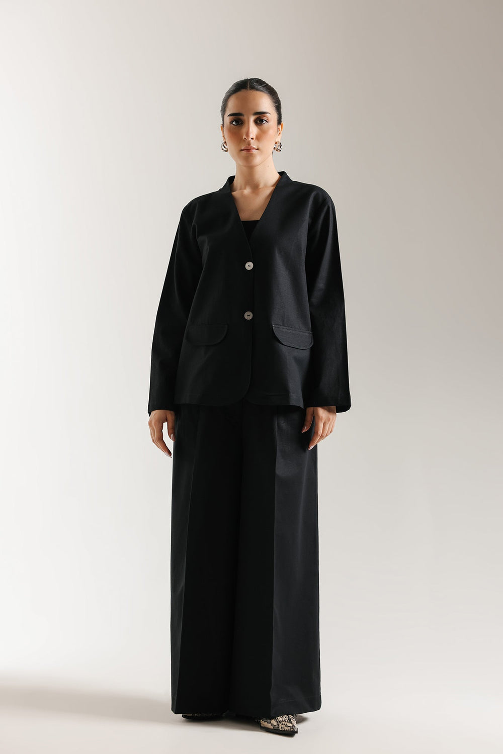 A loose-fit black jacket with a V-neckline and front button closure. It has long sleeves and two large front patch pockets, giving it a relaxed yet structured look. Wide-leg black trousers that fall straight and flowy to the floor, creating a clean, elongated silhouette. Overall, the look is modern, minimalistic, and elegant with a relaxed, tailored feel.