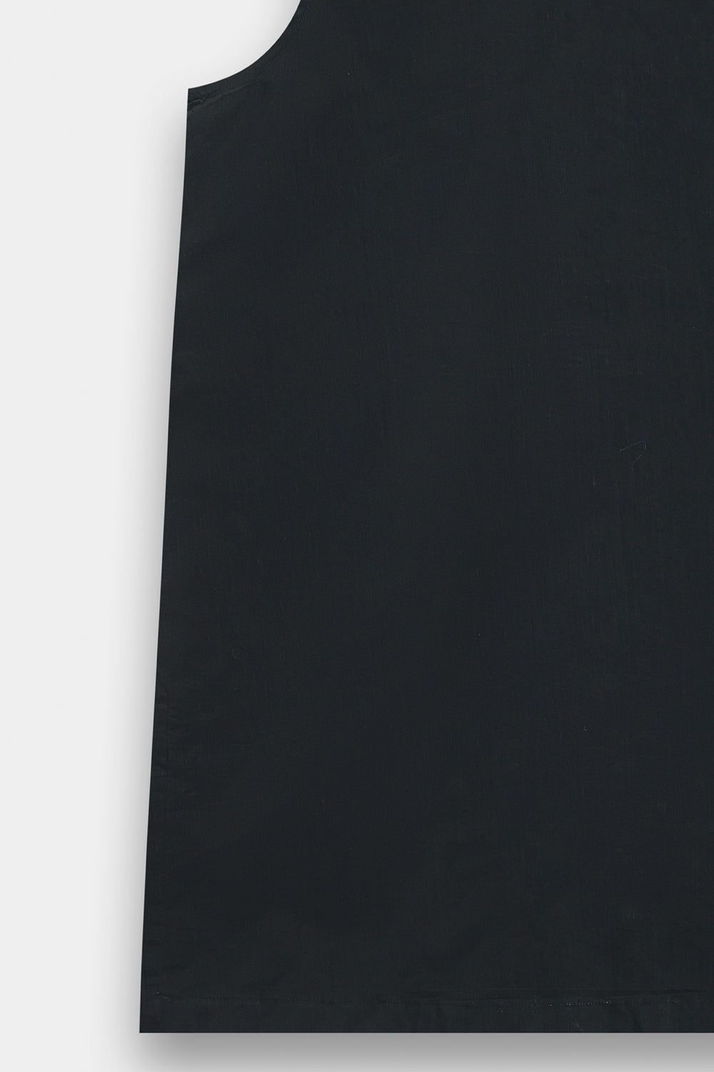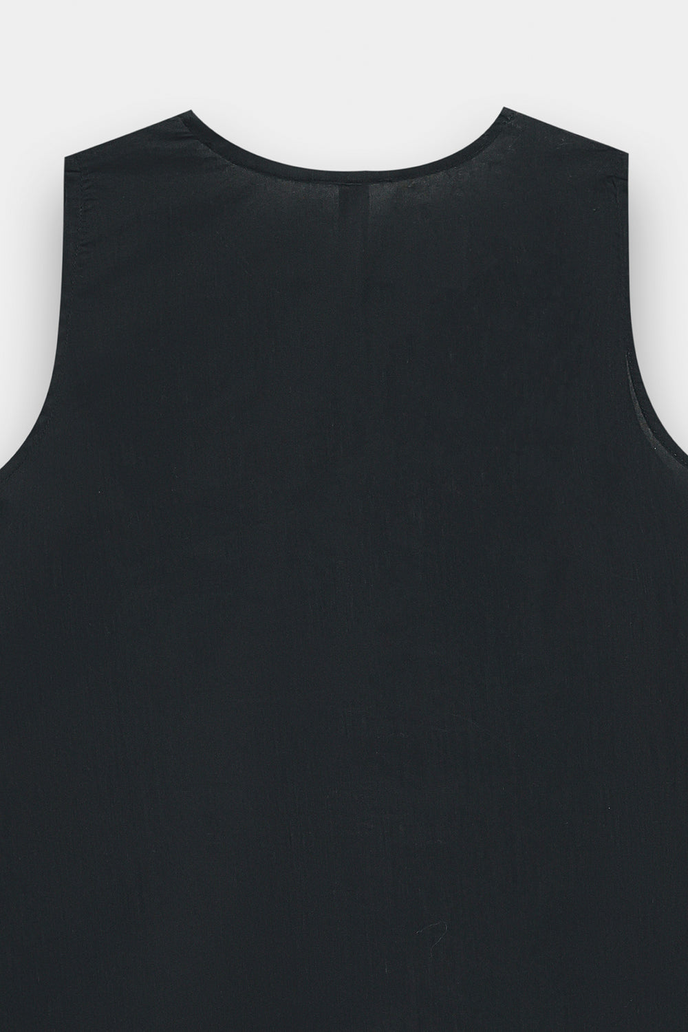Exude a sophisticated, dark-toned charm with this sleeveless black kurti, designed with a clean-cut straight silhouette. The kurti features a sharp split V-neckline, framed by tonal black-on-black beaded embroidery in a traditional scrolling vine pattern. This intricate hand-worked detailing continues across the lower hemline with elaborate floral medallions and botanical sprays, adding a subtle texture and shimmering finish to the solid black fabric.