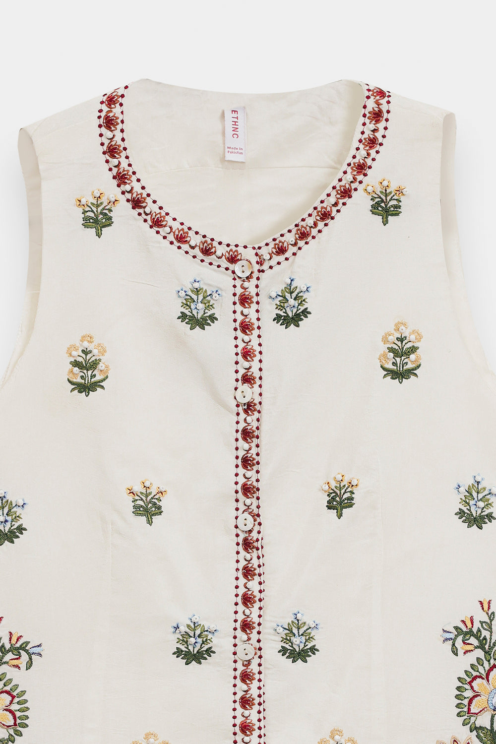 Add a layer of artisanal charm to your ensemble with this off-white waistcoat, a versatile piece that blends traditional craftsmanship with contemporary tailoring. Crafted from premium, textured fabric, this sleeveless top features a flattering V-neckline and a functional button-down front. The garment is intricately adorned with delicate floral and geometric embroidery in shades of rust, sage, and deep red, creating a balanced and refined aesthetic. The embroidery spans the bodice and culminates in a beautiful decorative border along the hem. Designed for a structured yet comfortable fit, this waistcoat can be worn as a standalone top or layered over tunics for a sophisticated, multifaceted look.