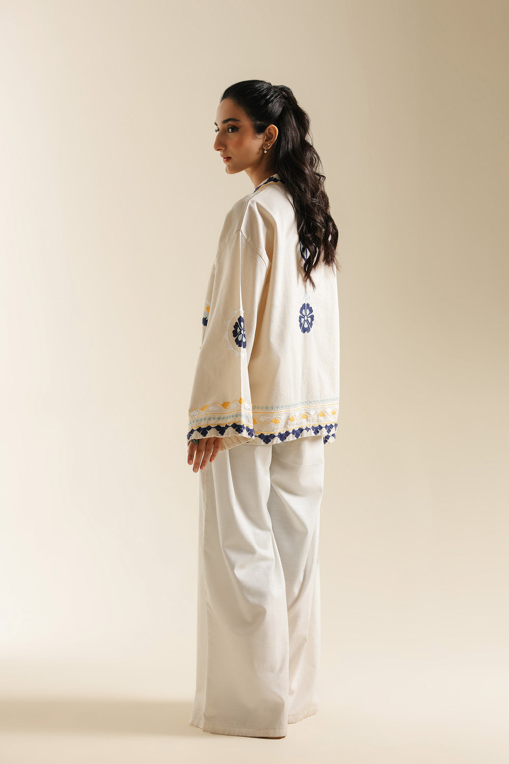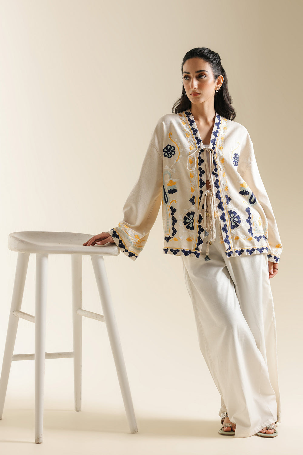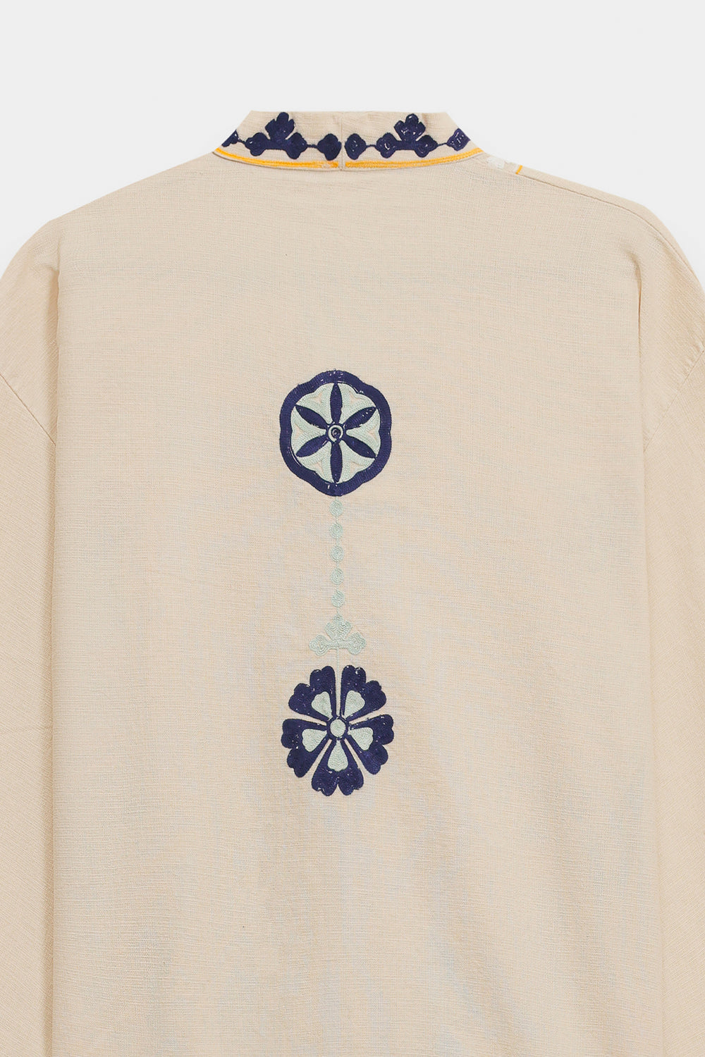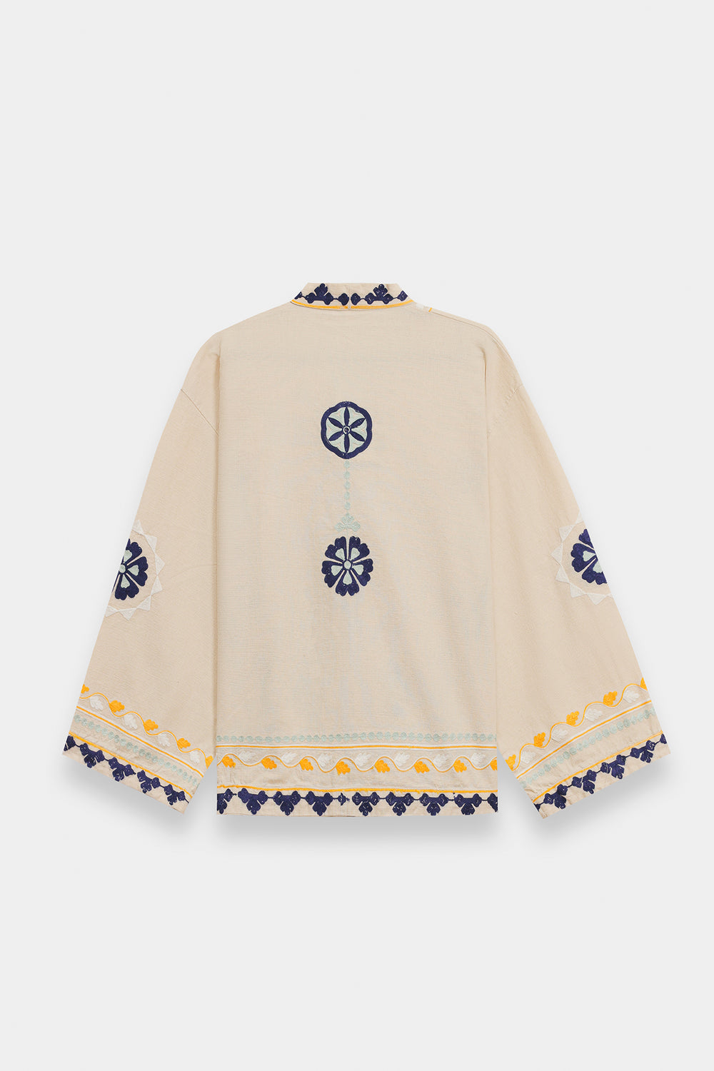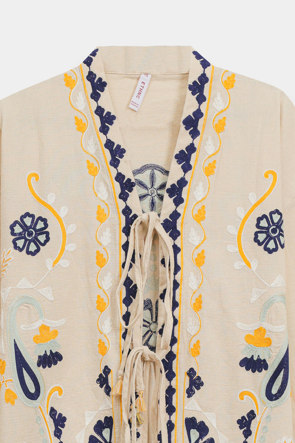 This ethereal cream kimono is a masterclass in relaxed luxury, blending a breezy, open-front silhouette with intricate artisanal embroidery. The serene ivory canvas is beautifully brought to life with vibrant navy and marigold threadwork, featuring traditional floral motifs and scrolled patterns that frame the neckline and cuffs. Designed with dramatic wide sleeves and a delicate tie-front tassel detail, this piece offers a sophisticated layering option that transitions effortlessly from a chic daytime look to an elegant evening ensemble. Its fluid drape and heritage-inspired craftsmanship make it a standout addition for those who value timeless style with a contemporary, bohemian edge.