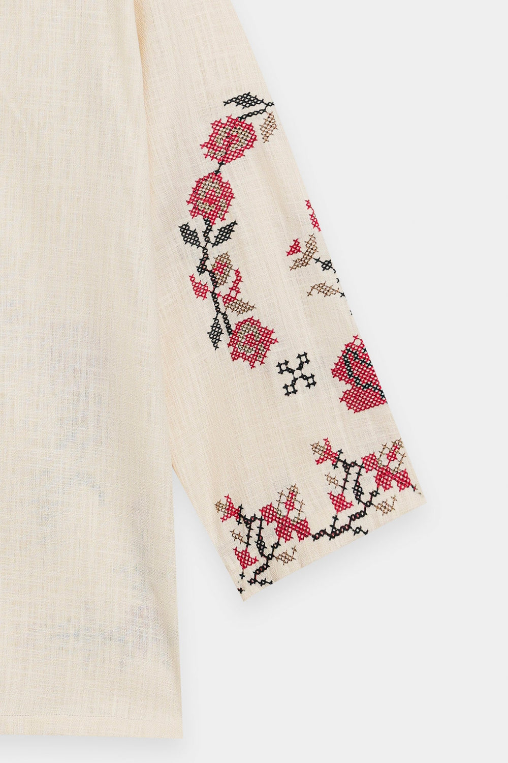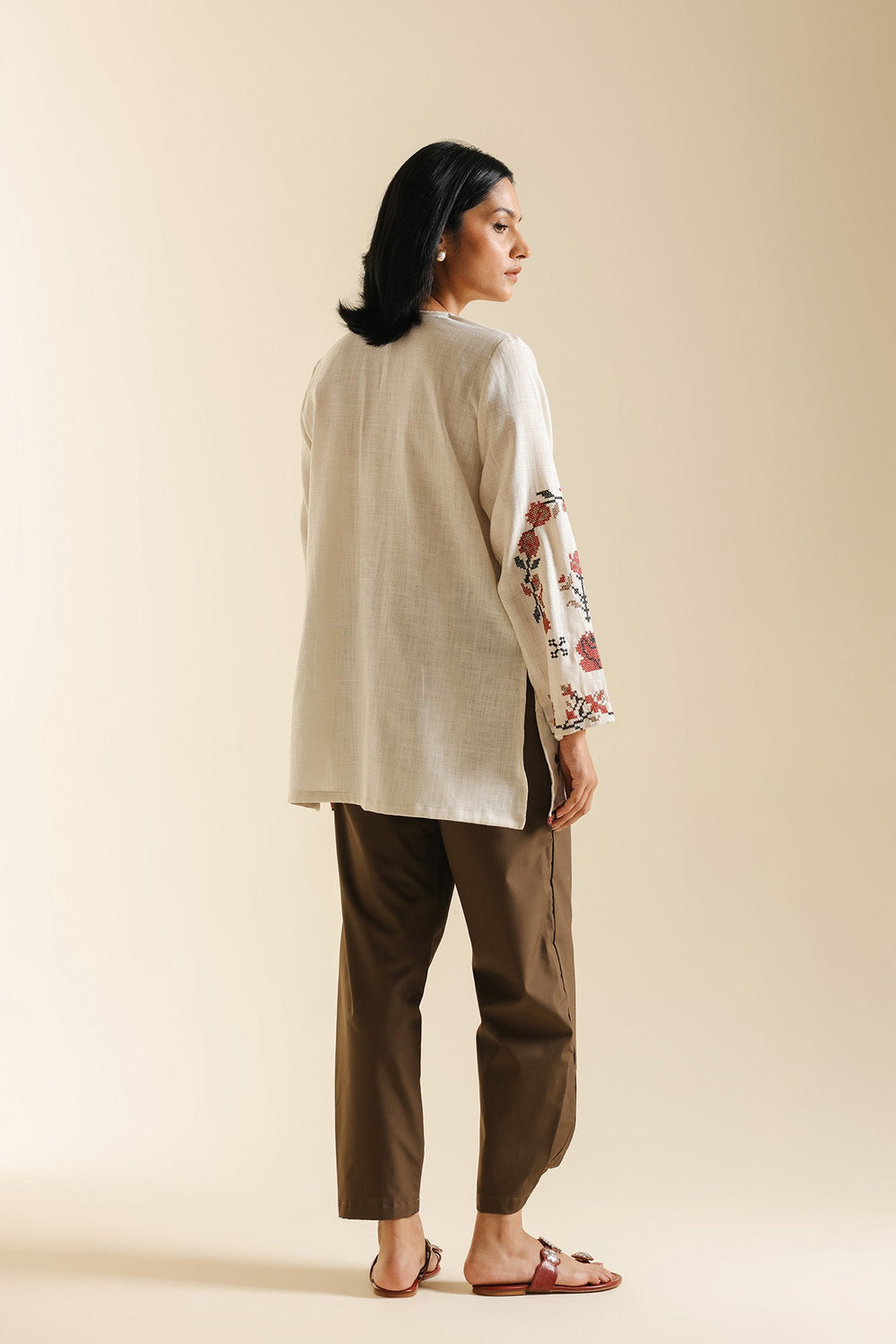 Adorn yourself in the timeless artistry of this sophisticated kurti. This short-length shirt is crafted from a crisp, off-white fabric and features striking black and reddish-brown thread embroidery concentrated beautifully across the yoke, creating a symmetrical, geometric, and floral design. It features a comfortable round neck with a subtle V-split and is finished with a delicate dark red-brown trim along the hemline. The kurti is pictured perfectly paired with loose, dark brown trousers that enhance the earthy, artisanal feel of the embroidery.