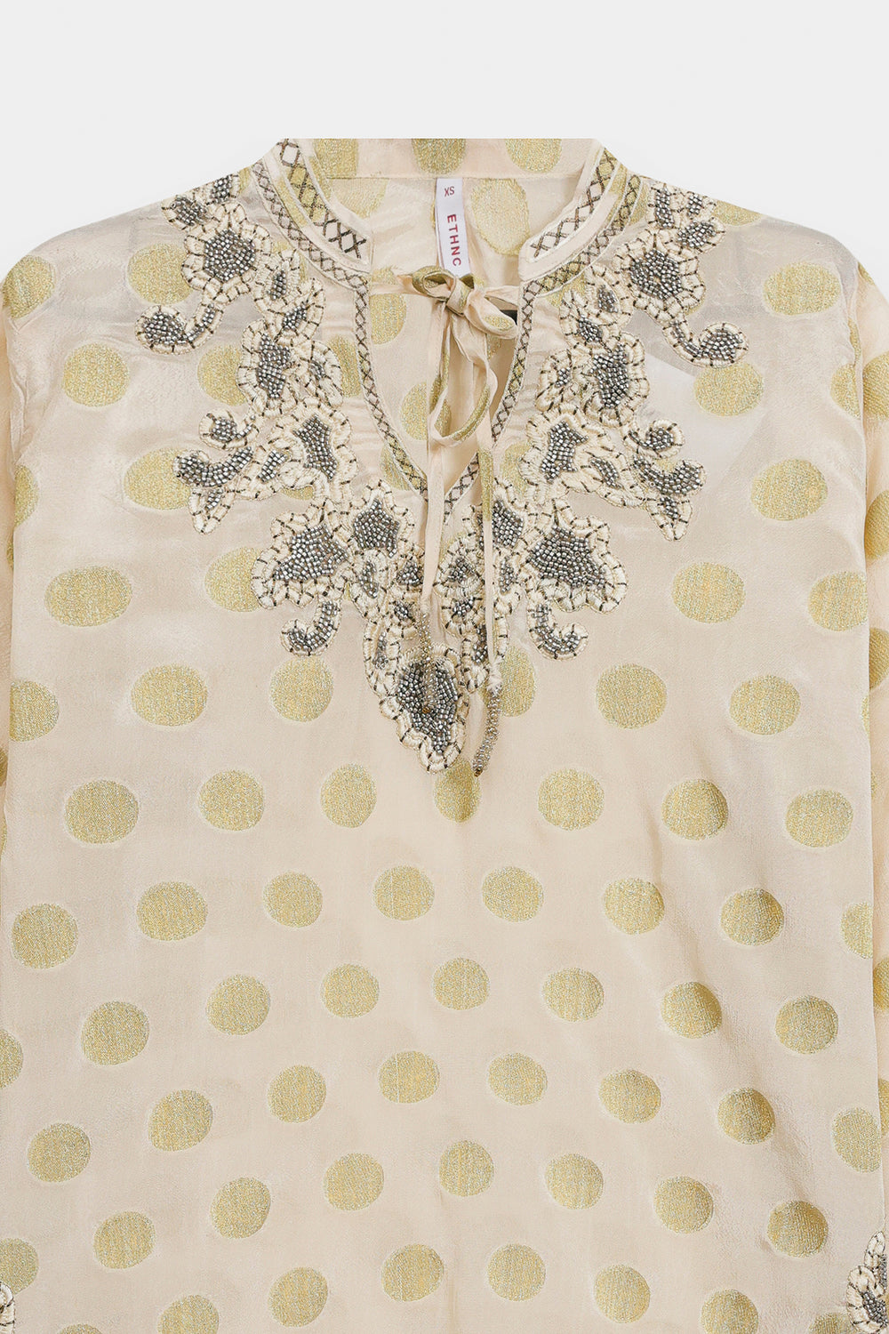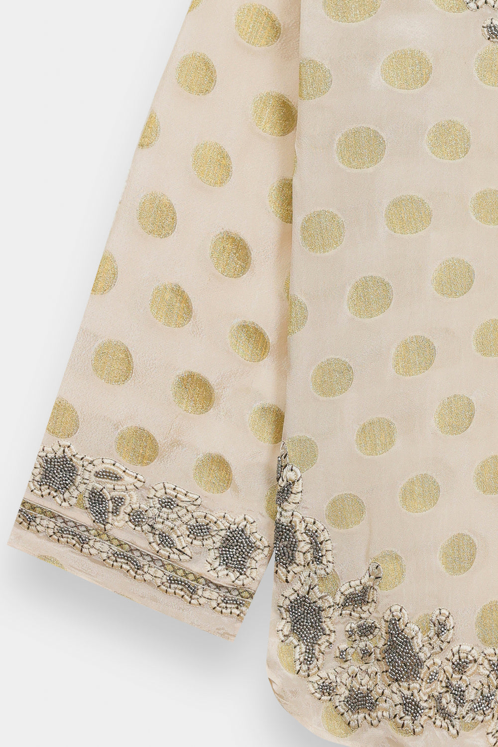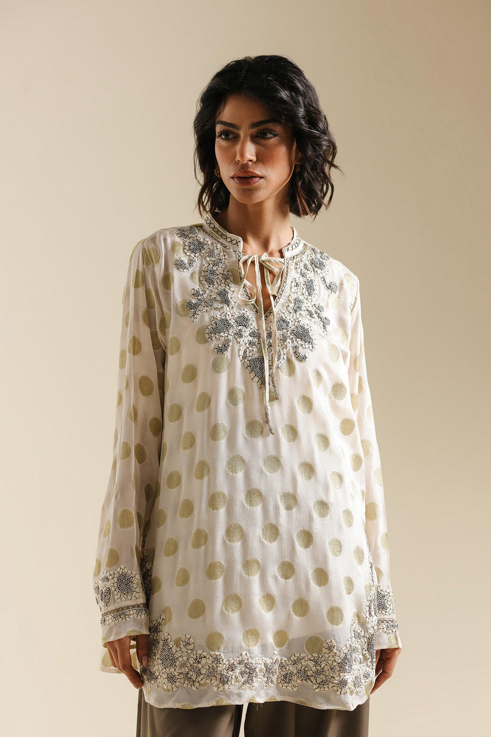 Make a luminous and artistic statement with this off-white kurti, featuring a relaxed silhouette and opulent hand-crafted embellishments. The design is characterized by a high, band-style neckline with a delicate tie-front detail, surrounded by a lavish yoke of silver and slate-grey beadwork and intricate embroidery in a flourishing botanical motif. The fabric itself is adorned with a shimmering gold polka-dot jacquard pattern that adds a playful yet sophisticated texture to the garment. This detailed ornamentation is echoed along the wide cuffs of the long sleeves and the gently curved hemline, creating a cohesive and festive look.
