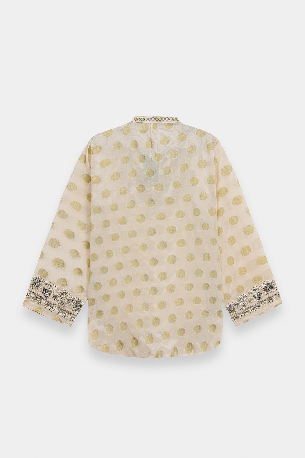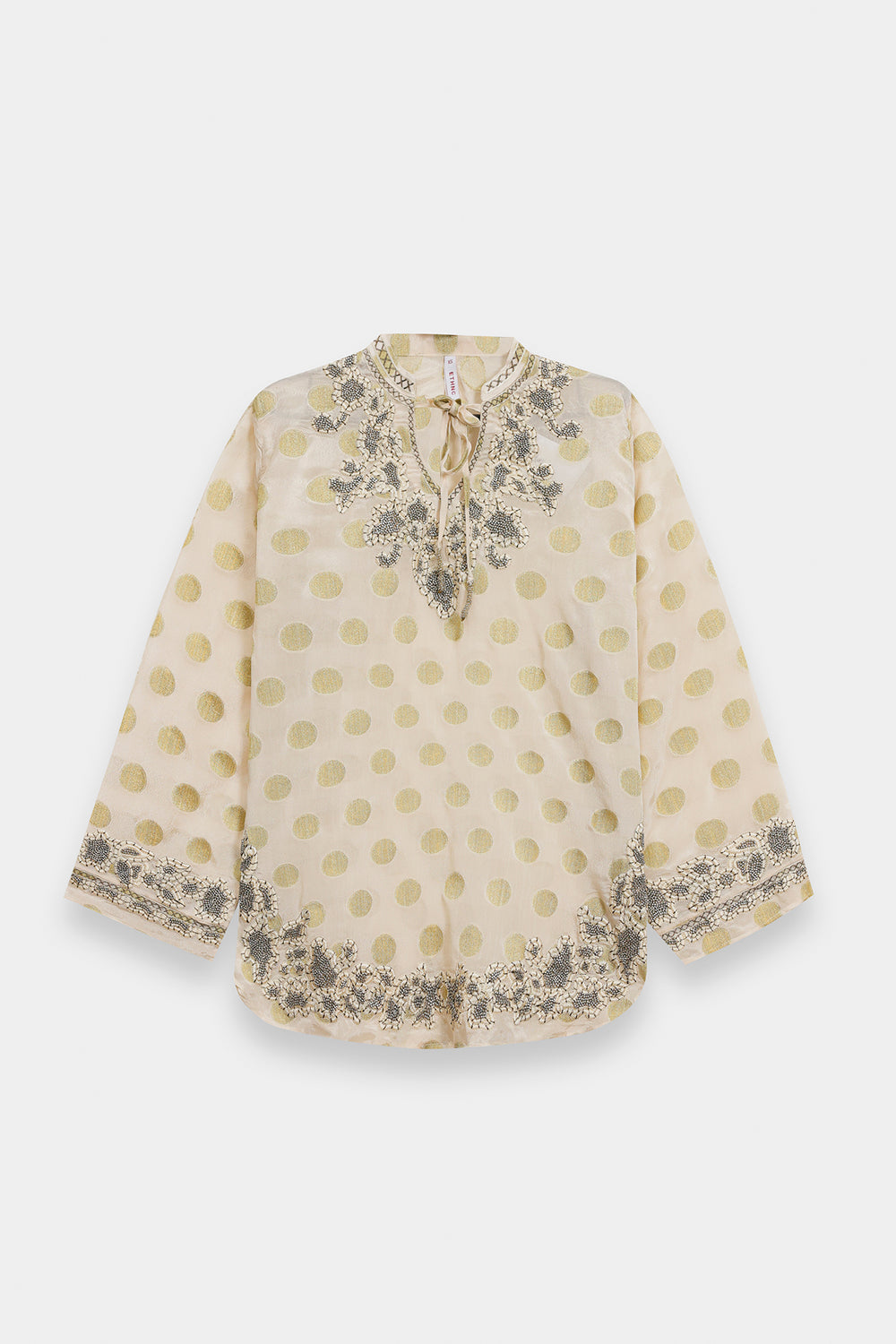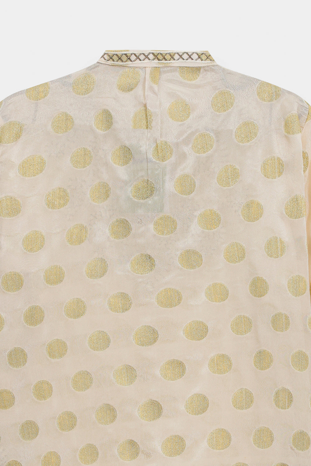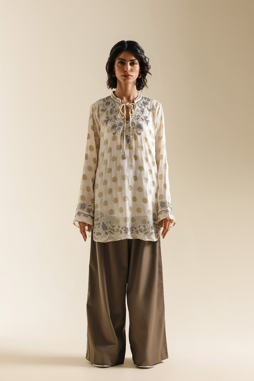 Make a luminous and artistic statement with this off-white kurti, featuring a relaxed silhouette and opulent hand-crafted embellishments. The design is characterized by a high, band-style neckline with a delicate tie-front detail, surrounded by a lavish yoke of silver and slate-grey beadwork and intricate embroidery in a flourishing botanical motif. The fabric itself is adorned with a shimmering gold polka-dot jacquard pattern that adds a playful yet sophisticated texture to the garment. This detailed ornamentation is echoed along the wide cuffs of the long sleeves and the gently curved hemline, creating a cohesive and festive look.