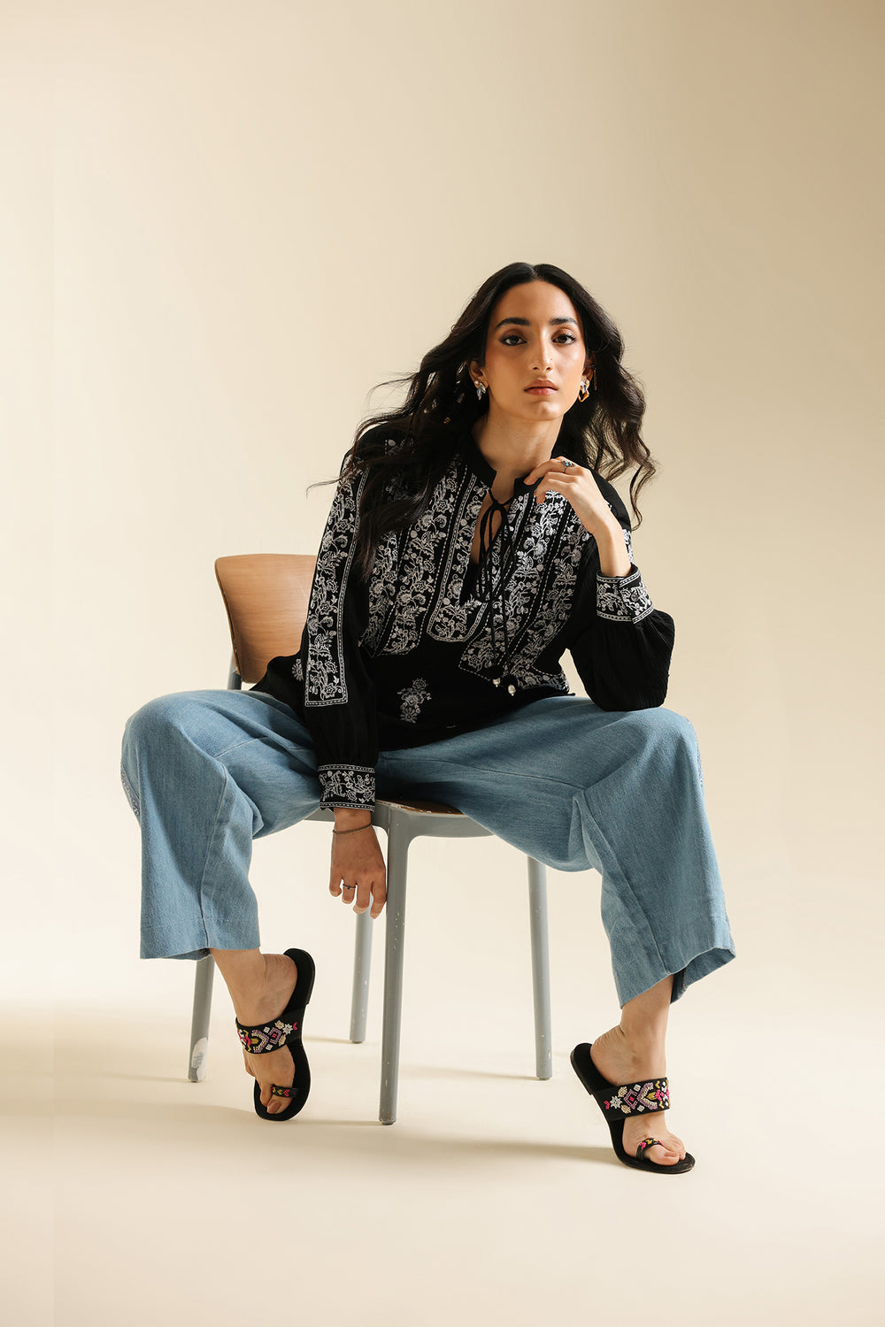 Wrap yourself in classic elegance with this sophisticated black and white embroidered kurti. This beautiful top features intricate white embroidery that creates a striking contrast against the dark fabric. The detailed floral patterns cover the chest and sleeves, and the tassel ties at the neckline add a touch of traditional charm. Perfect for a special occasion or a stylish day out, this kurti offers a blend of timeless style and modern comfort.