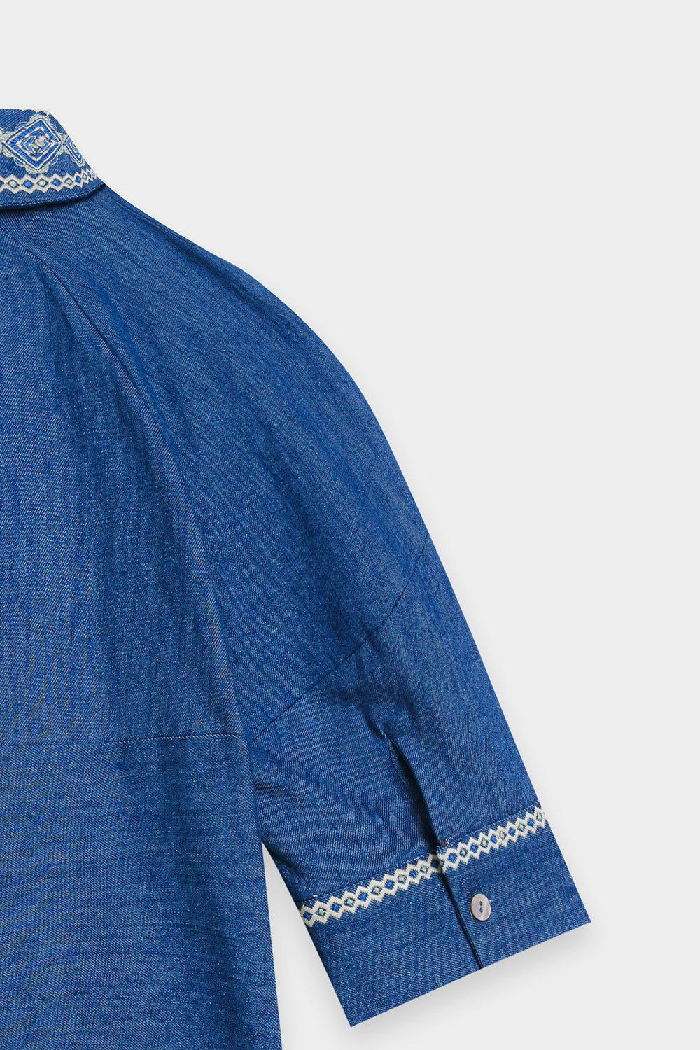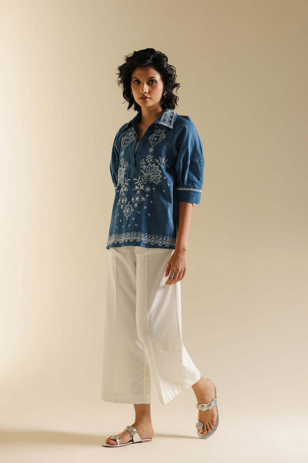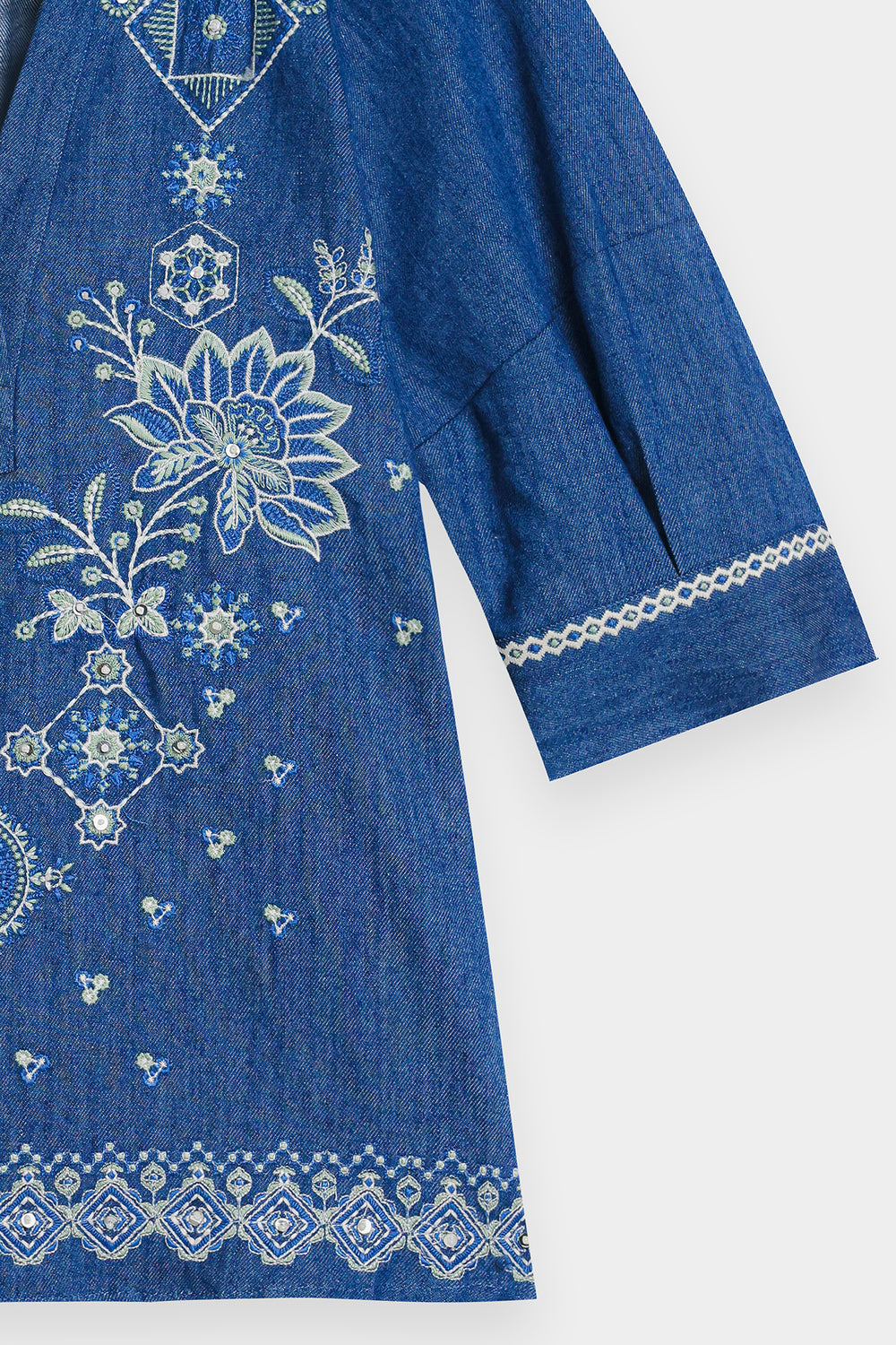 Make a statement in this chic blue denim kurti, featuring intricate white embroidery. The detailed floral patterns on the front and sleeves create a beautiful contrast, adding a touch of sophisticated artistry. With a straight fit and a unique design, this kurti is perfect for a casual outing or a festive gathering, blending modern style with traditional charm.
