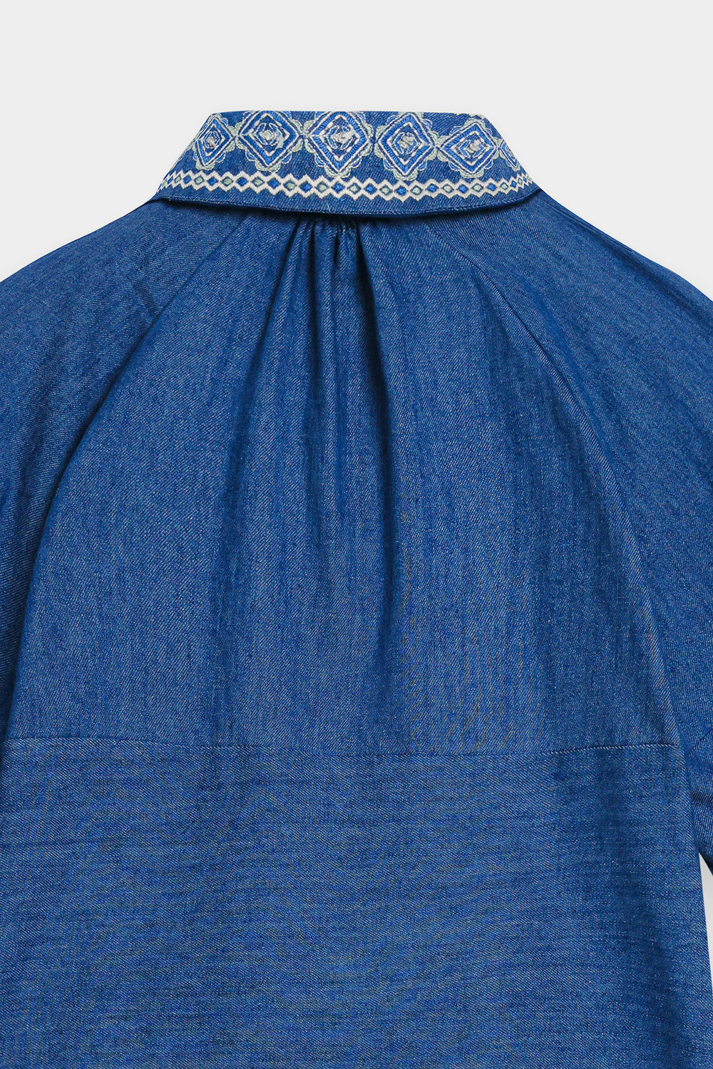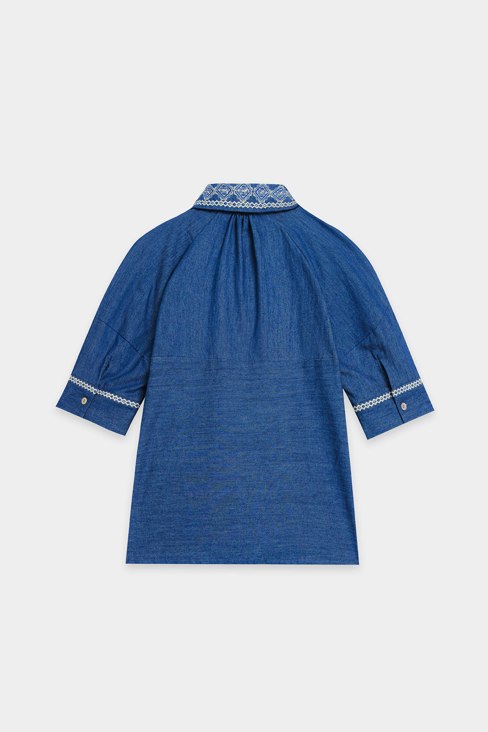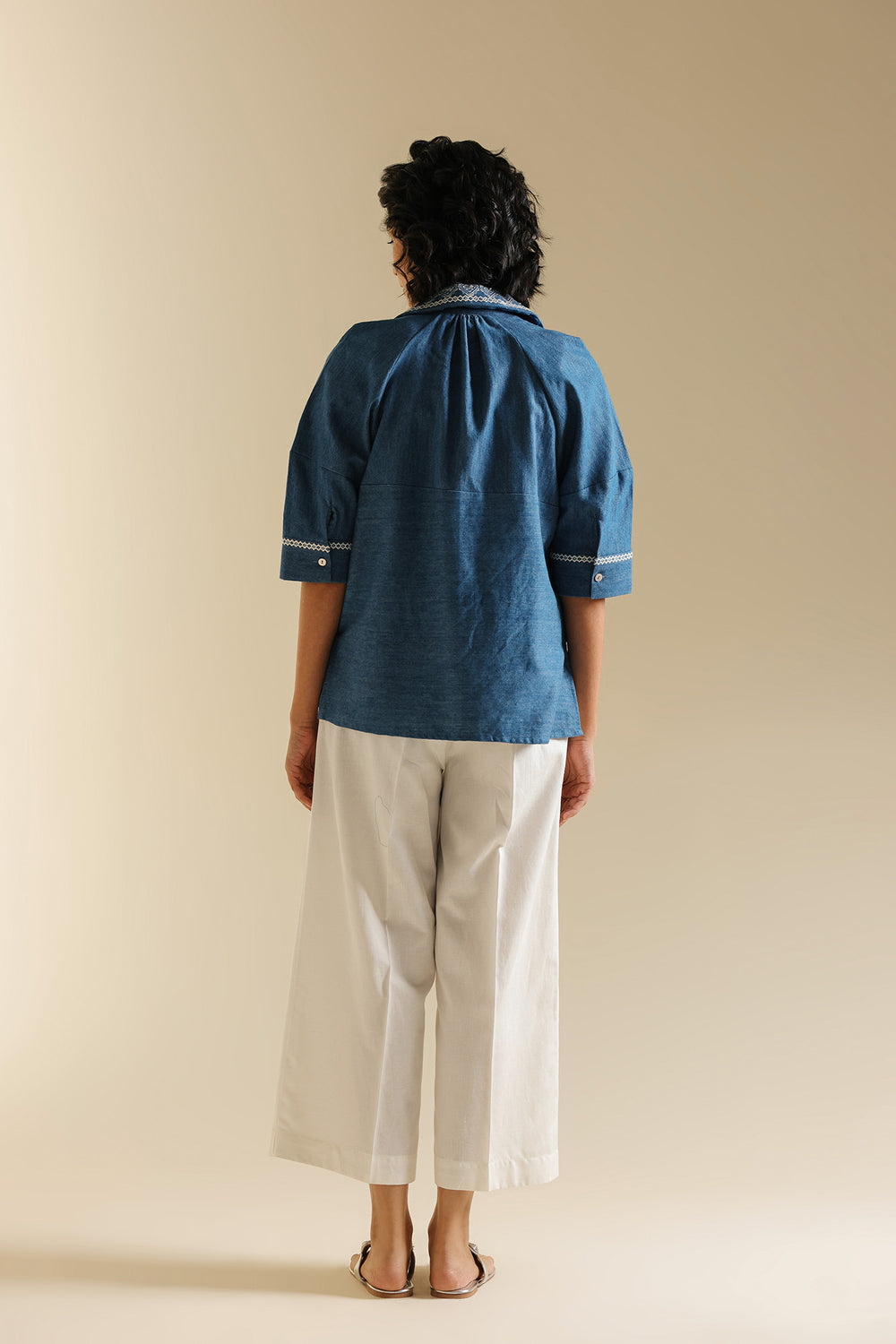 Make a statement in this chic blue denim kurti, featuring intricate white embroidery. The detailed floral patterns on the front and sleeves create a beautiful contrast, adding a touch of sophisticated artistry. With a straight fit and a unique design, this kurti is perfect for a casual outing or a festive gathering, blending modern style with traditional charm.
