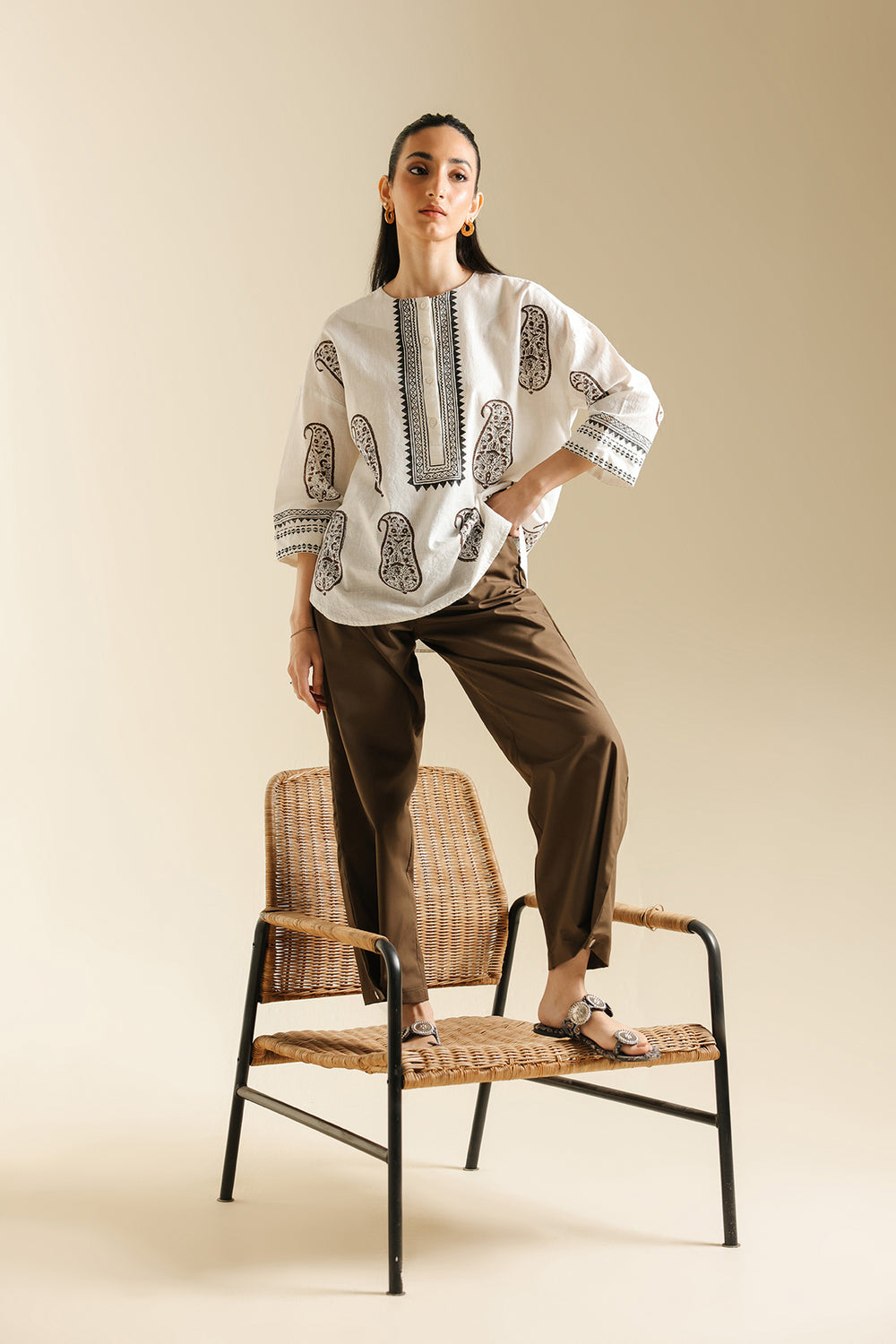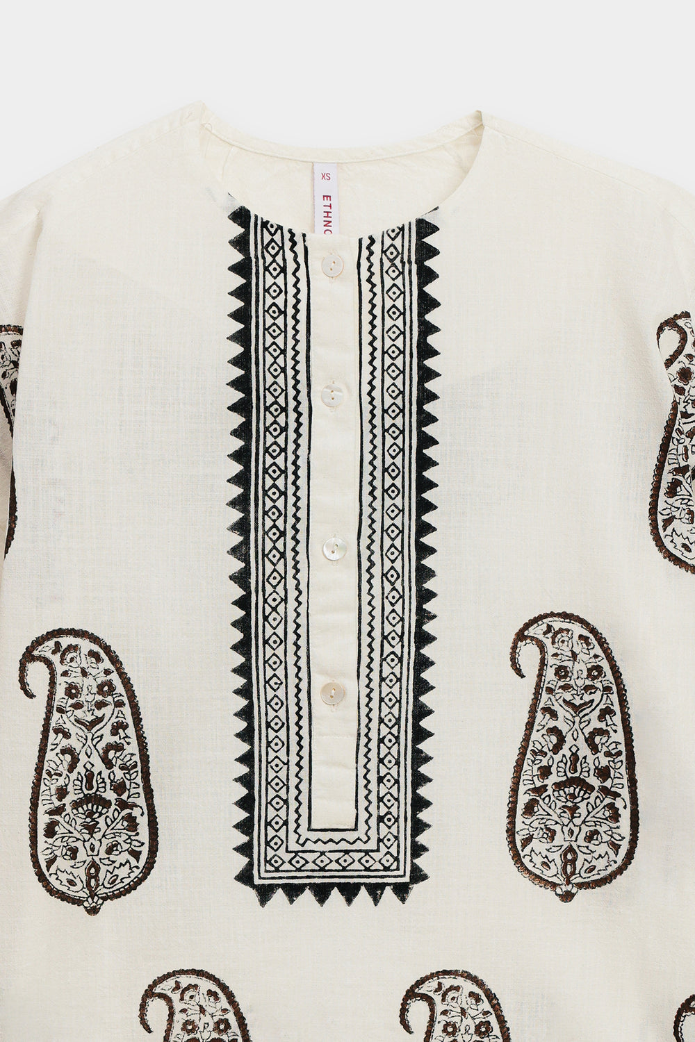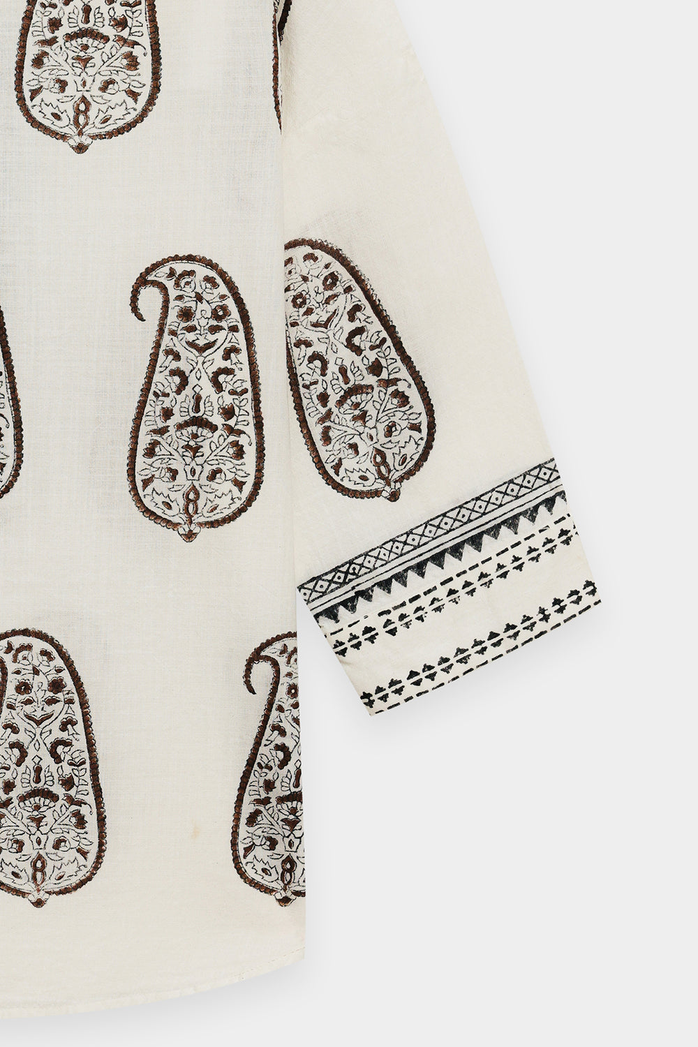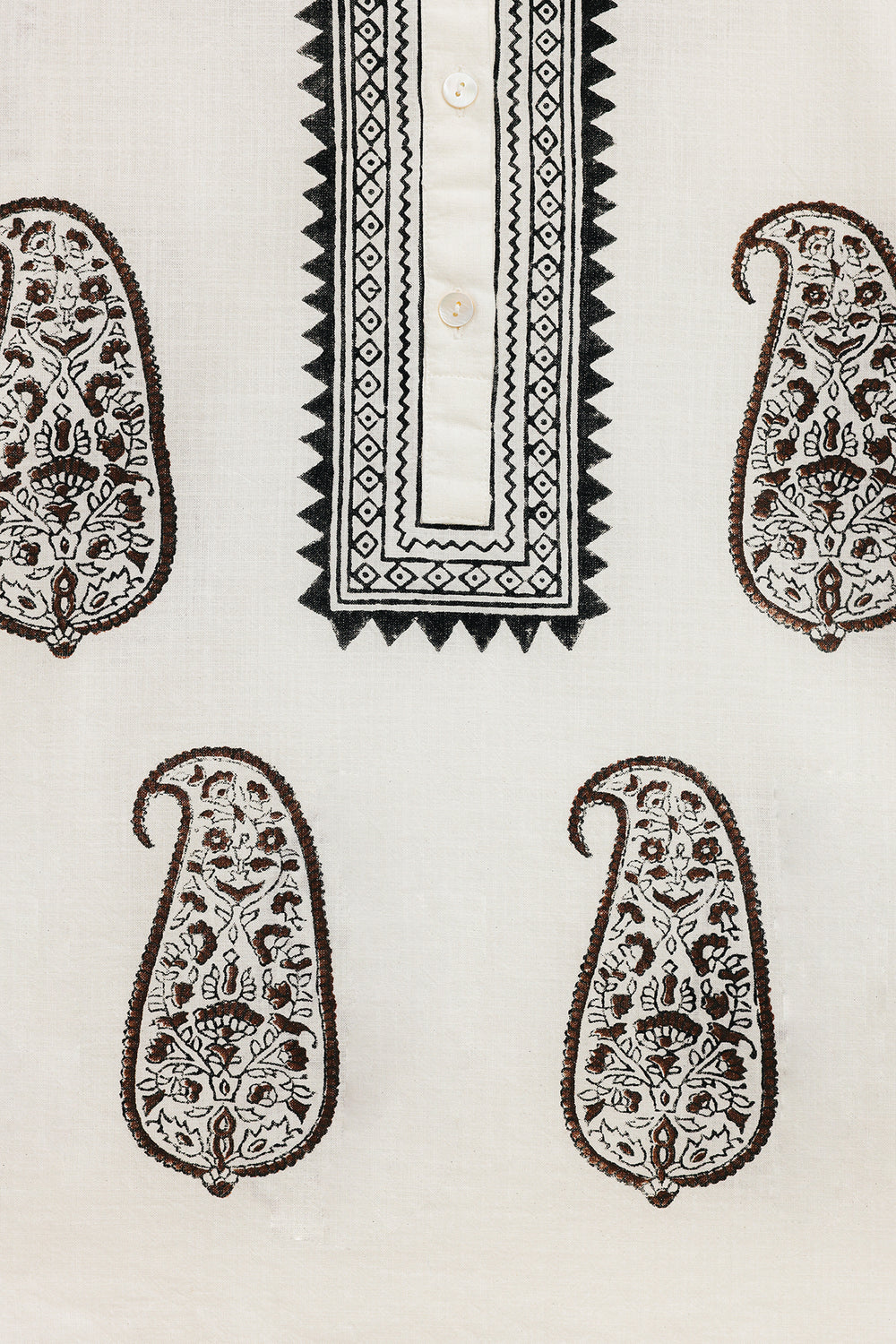 Make a confident, bohemian statement in this striking white kurti. This short, relaxed-fit kurti is crafted from a textured white fabric. It features a bold black-and-brown block-printed design, showcasing large stylized paisley motifs across the body and geometric patterns on the yoke and three-quarter length sleeves. The simple, round neckline is accented with a stitched design, drawing attention to the graphic prints.