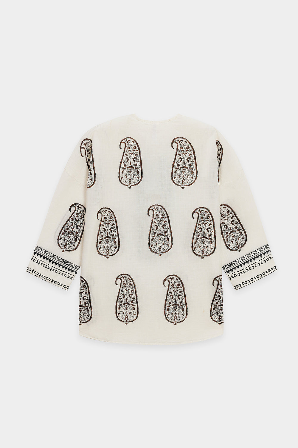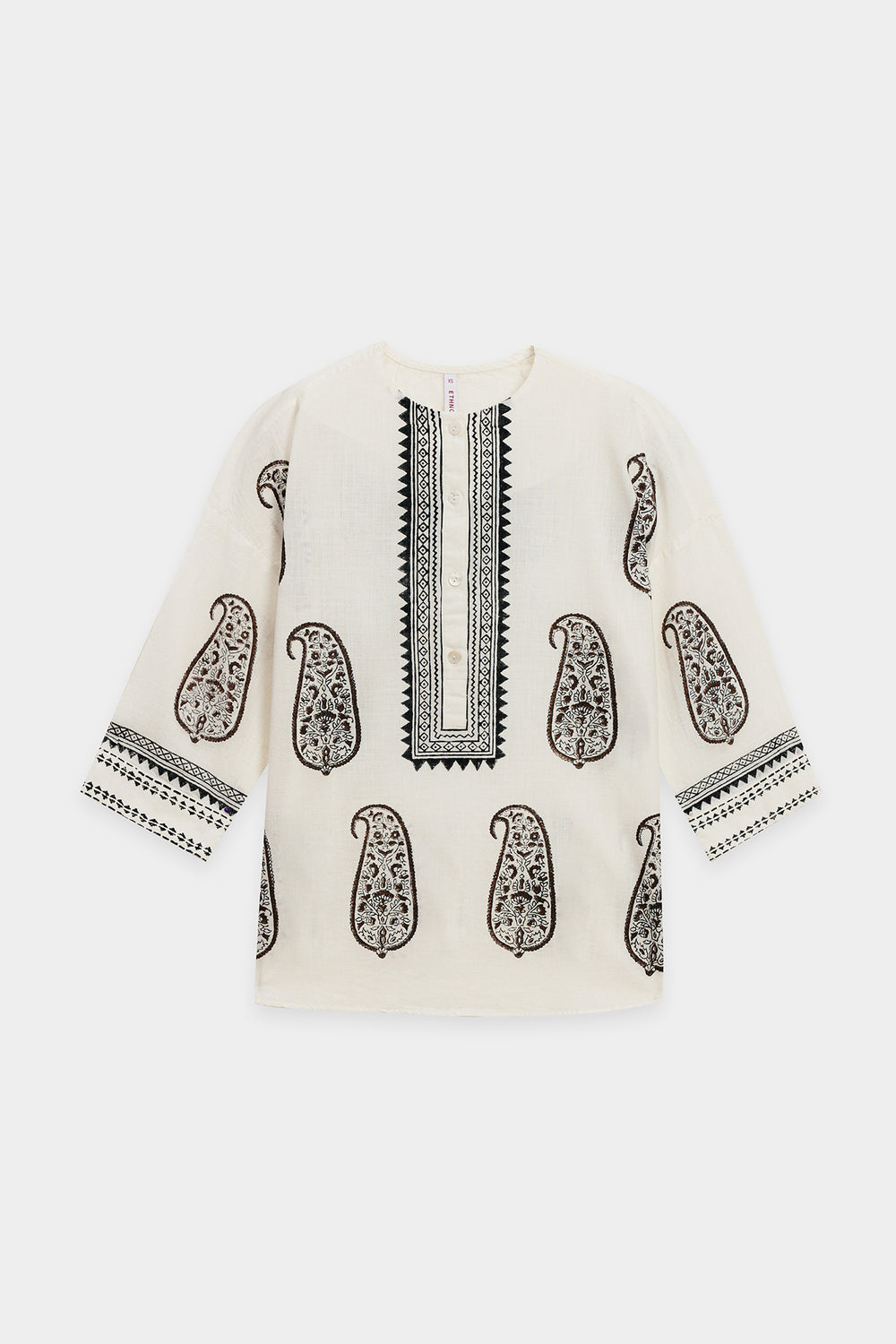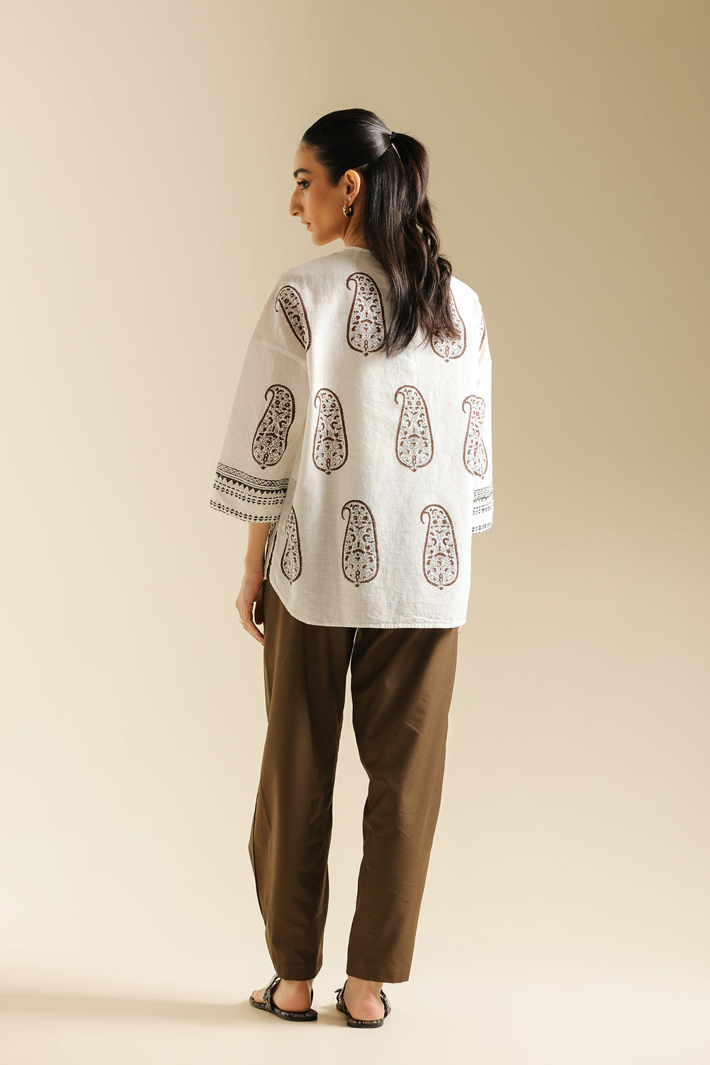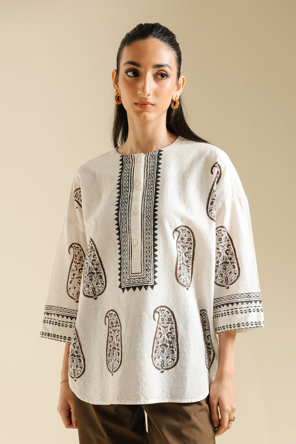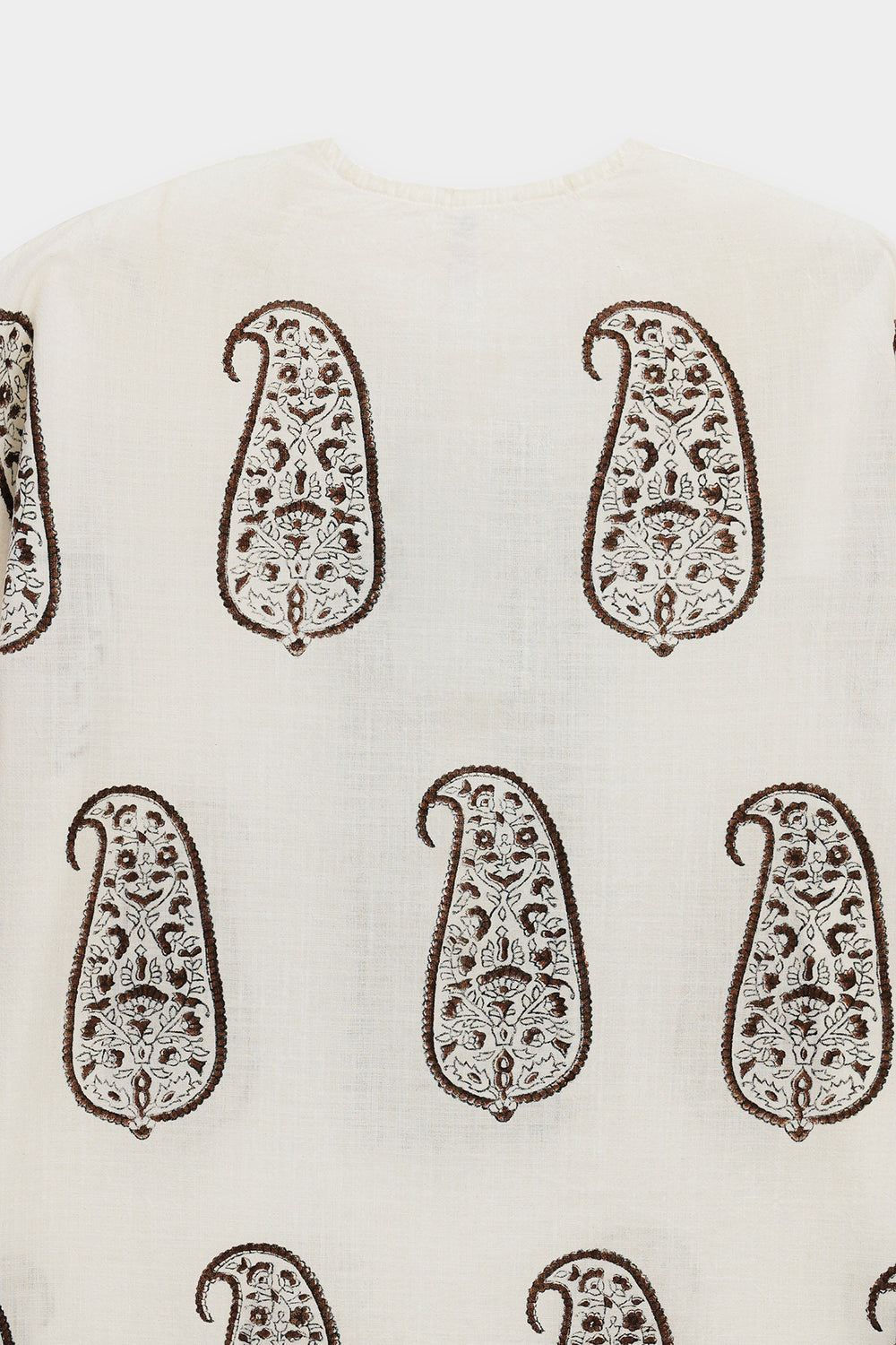 Make a confident, bohemian statement in this striking white kurti. This short, relaxed-fit kurti is crafted from a textured white fabric. It features a bold black-and-brown block-printed design, showcasing large stylized paisley motifs across the body and geometric patterns on the yoke and three-quarter length sleeves. The simple, round neckline is accented with a stitched design, drawing attention to the graphic prints.