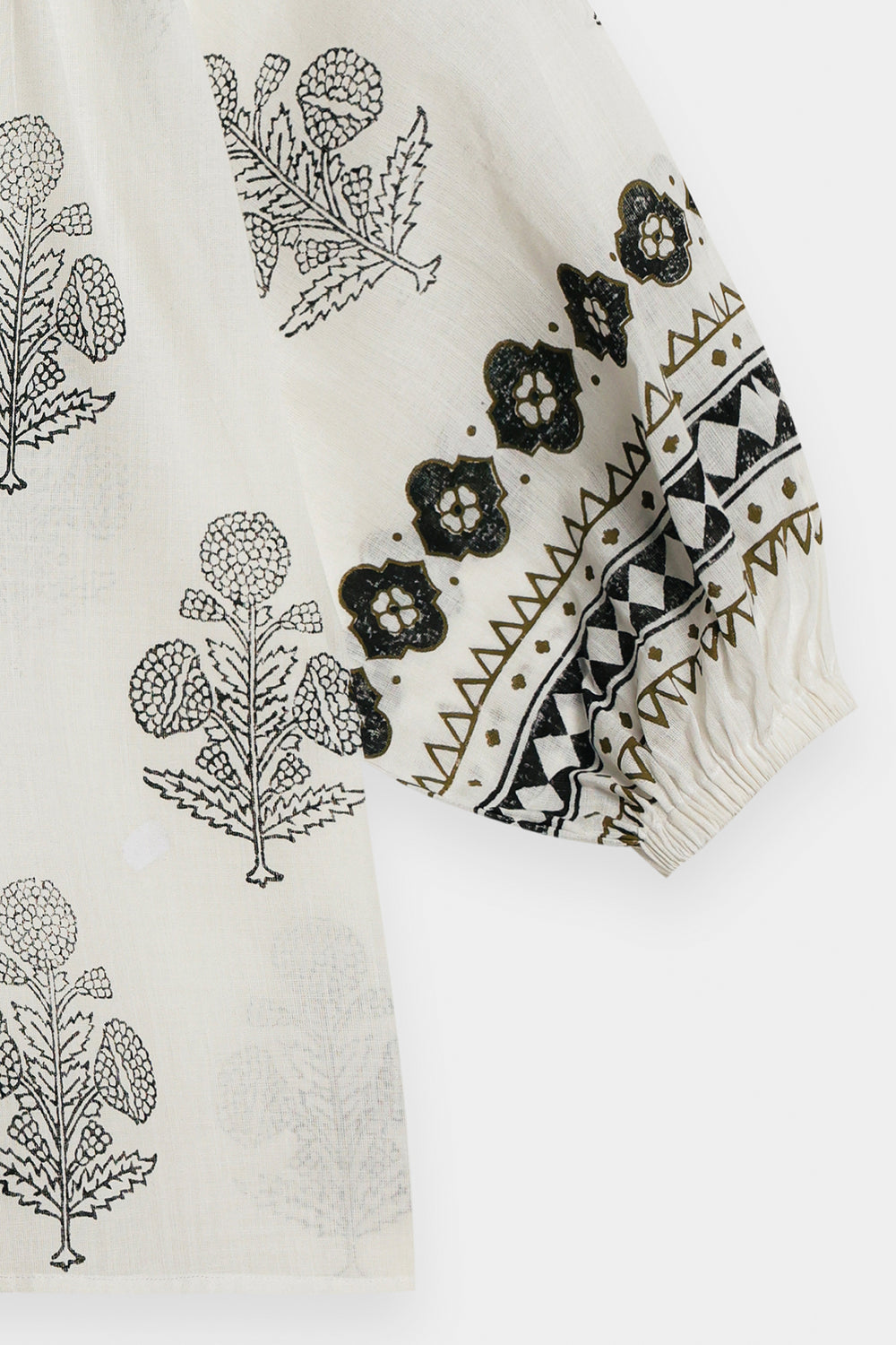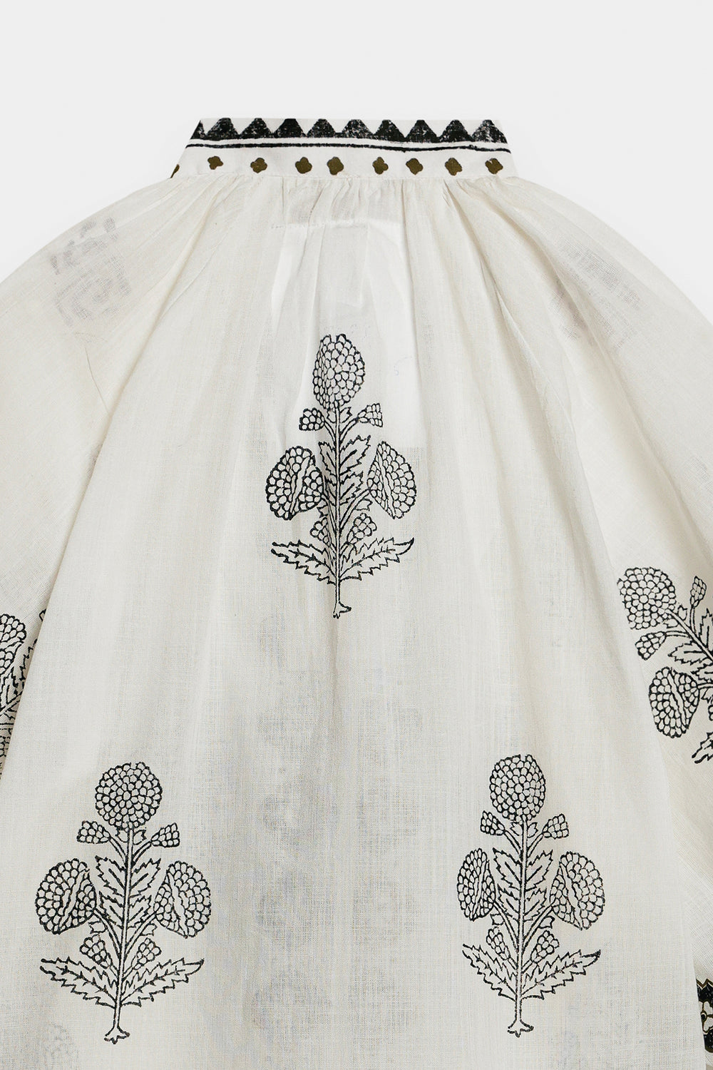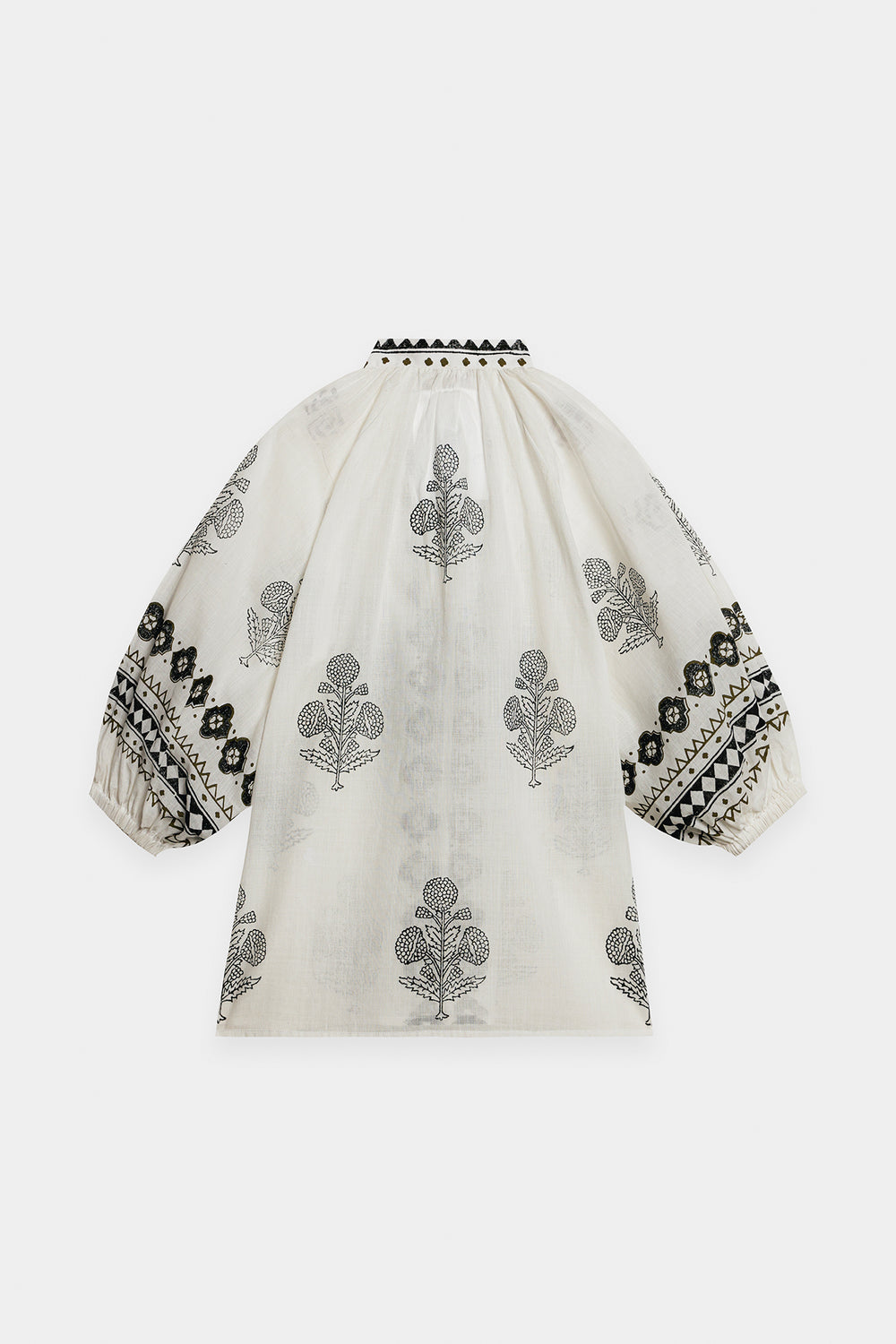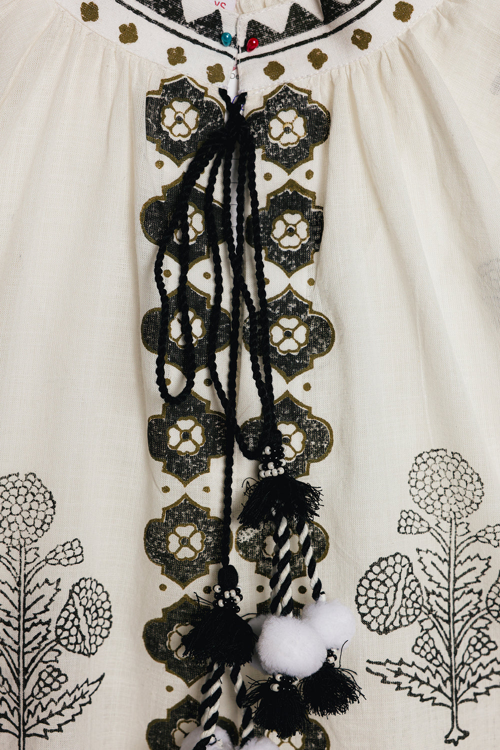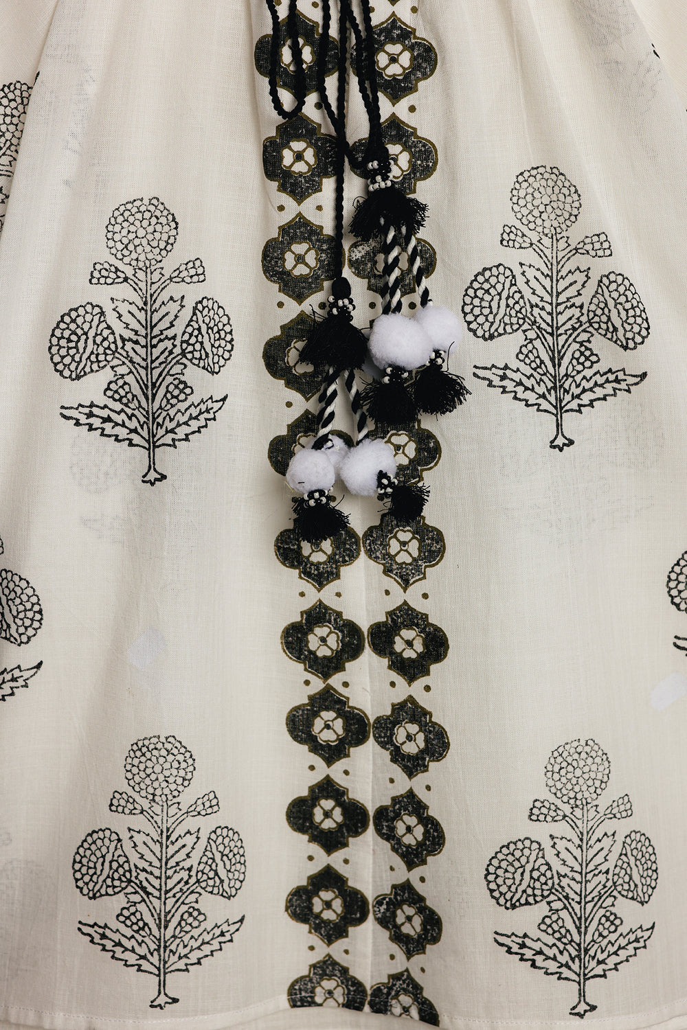 Embrace an effortlessly chic look with this stunning white embroidered kurti. This stylish top features intricate black floral and geometric embroidery that creates a beautiful, eye-catching contrast. The high neckline with playful tassel ties and the relaxed, three-quarter sleeves add a touch of modern bohemian flair. This kurti is a versatile piece that's perfect for a day out or a special occasion.