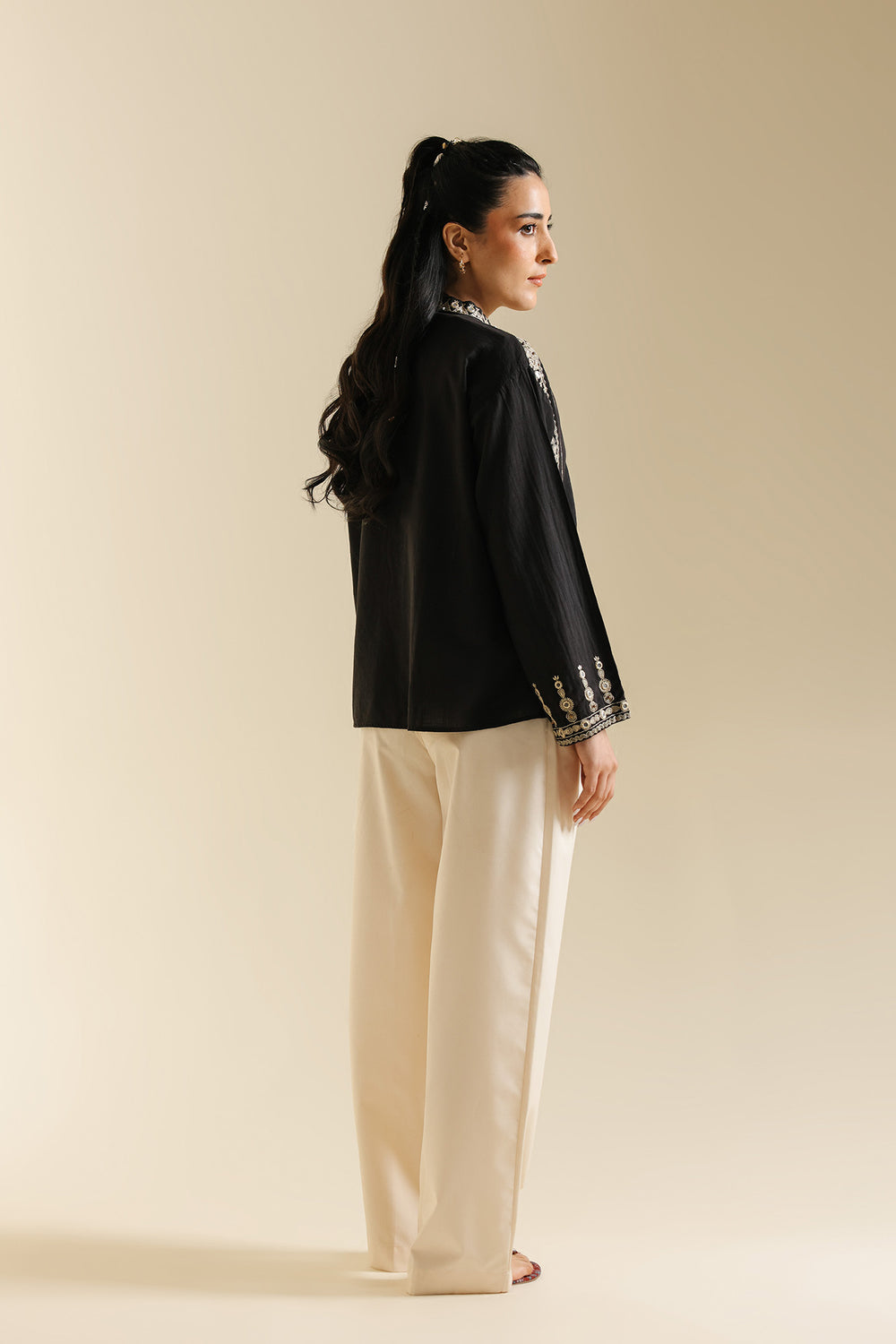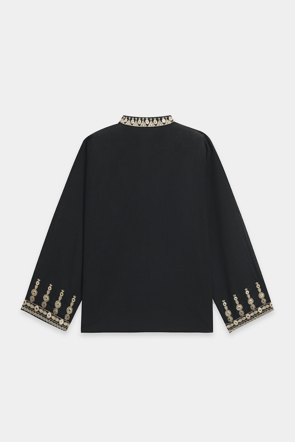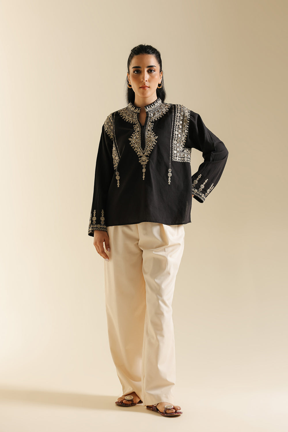 Exude understated chic in this black embroidered kurti. This short-length, long-sleeved kurti is crafted from a comfortable black fabric and features a band collar with a slit neckline. The silver and white thread embroidery forms beautiful traditional motifs across the yoke, neckline, and cuffs. The monochrome color scheme offers a versatile and sophisticated look. Pair this striking top with wide-leg beige or white trousers for a balanced and contemporary silhouette.