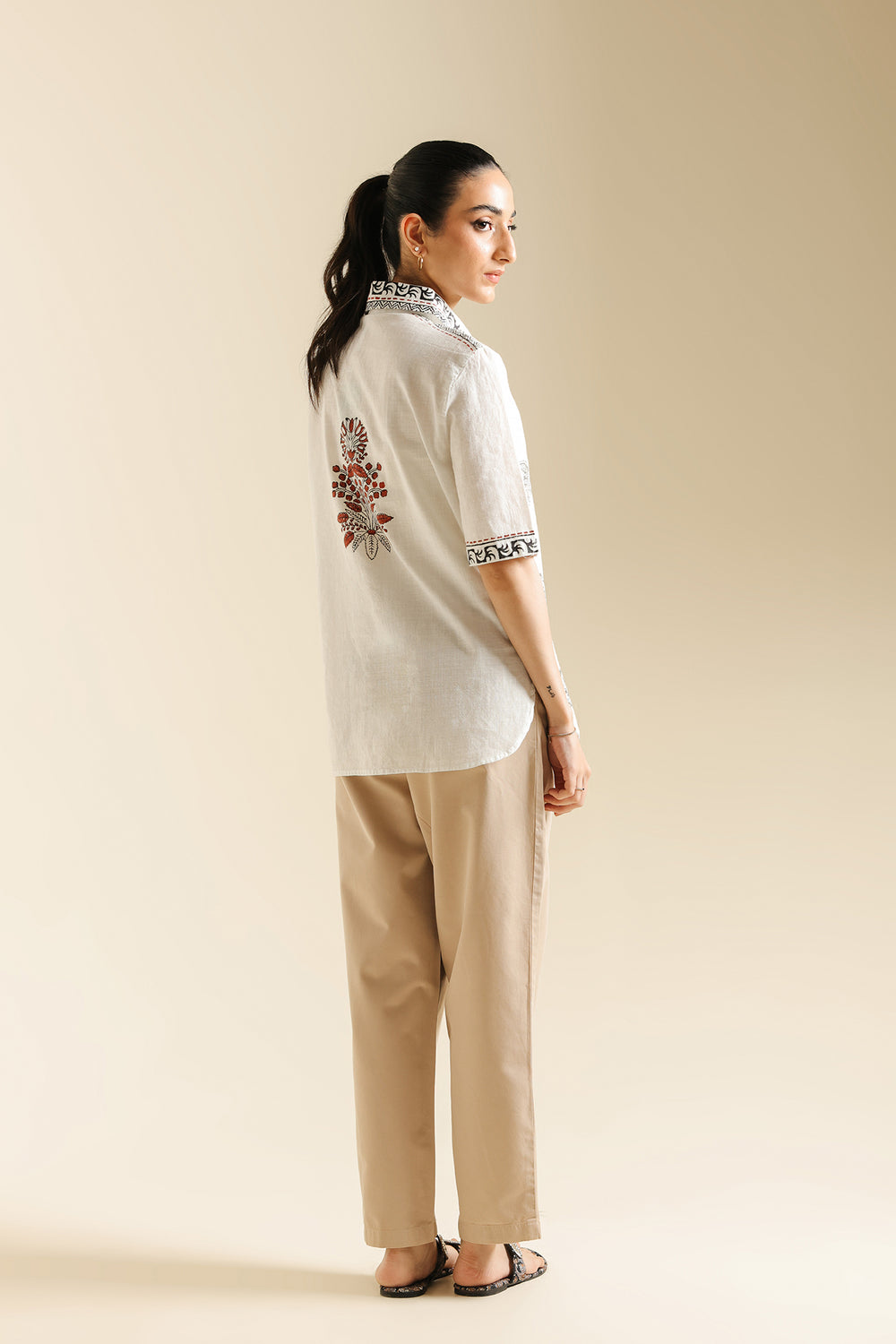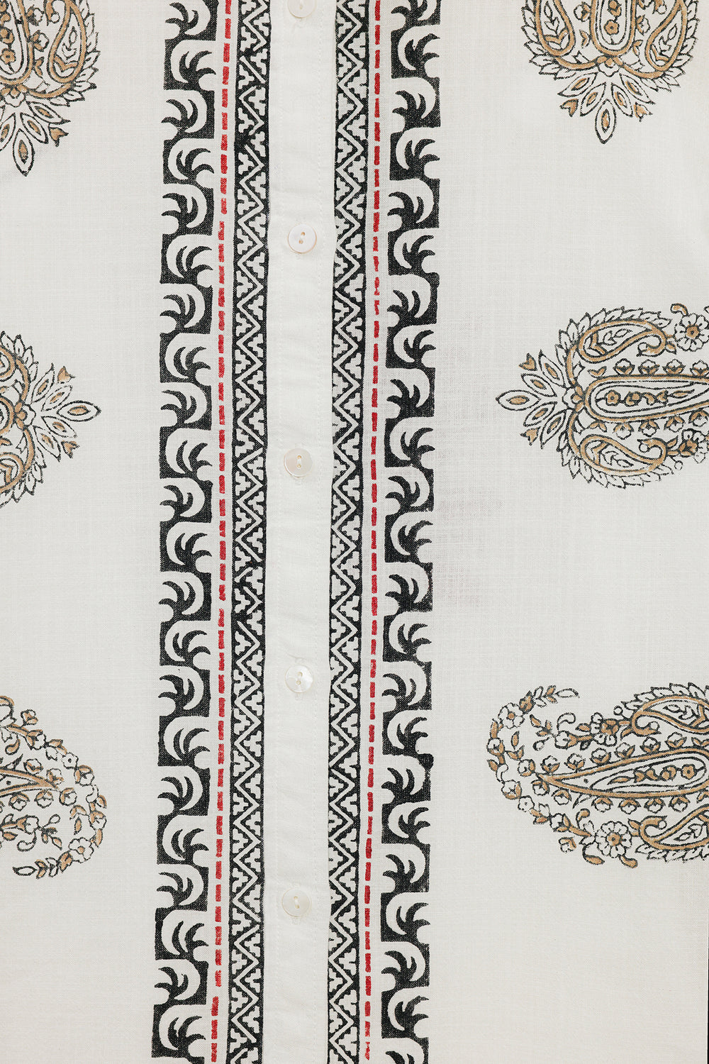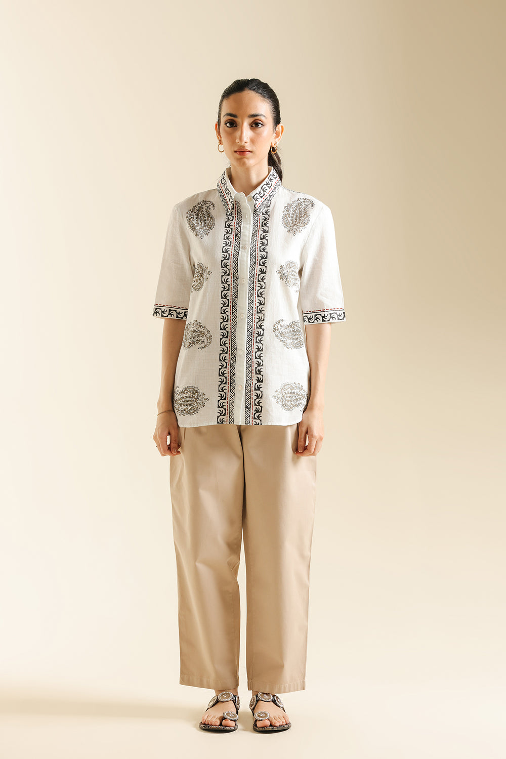 Elevate your casual wardrobe with the classic charm of this white printed kurti. This short-sleeved, straight-cut kurti is crafted from a crisp white fabric and features a classic collar with a button-down placket. It is beautifully adorned with intricate black and brown print, showcasing vertical panels of paisley and geometric patterns. This versatile kurti is shown paired with relaxed-fit, khaki-colored trousers, making it perfect for a polished, day-to-day look.