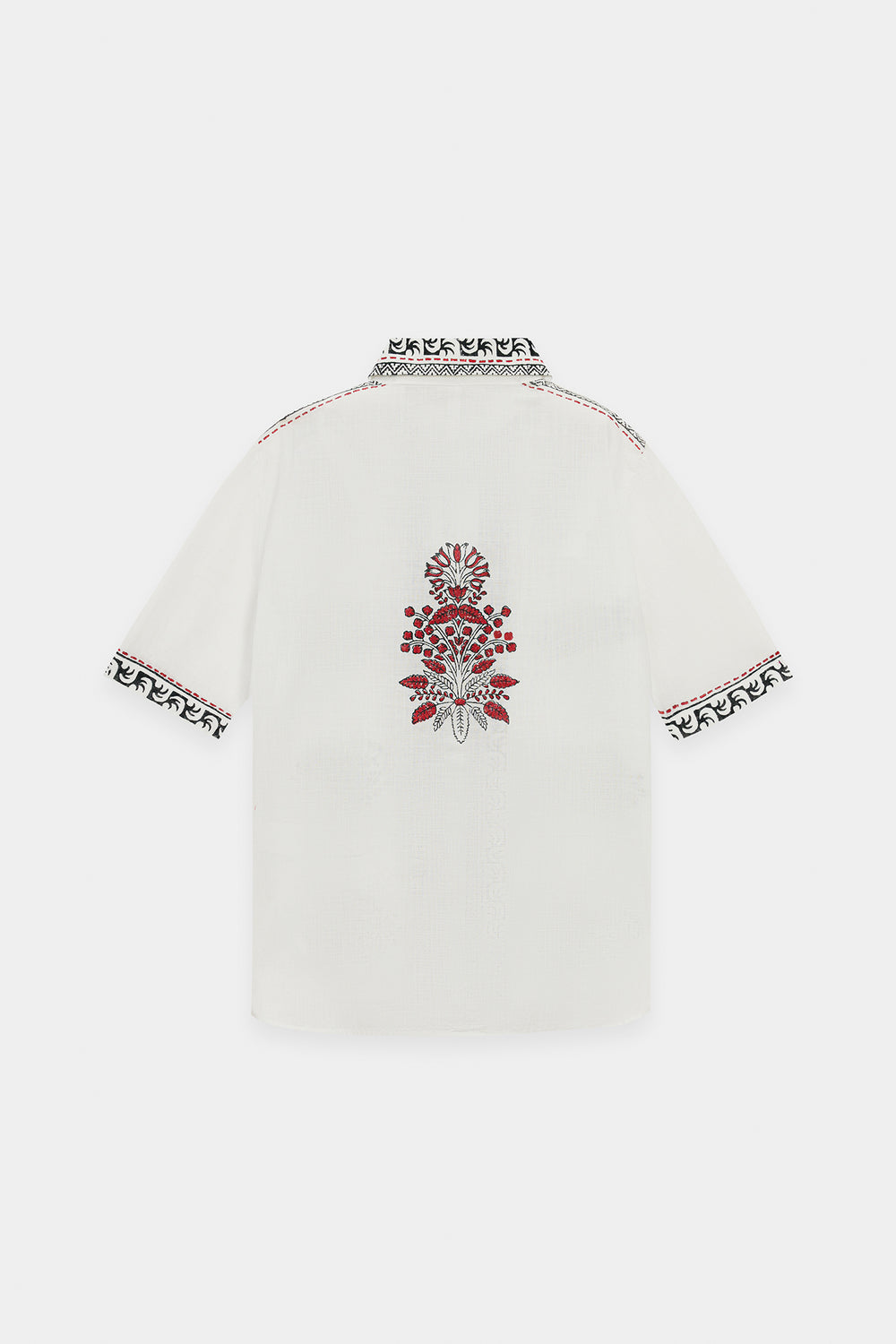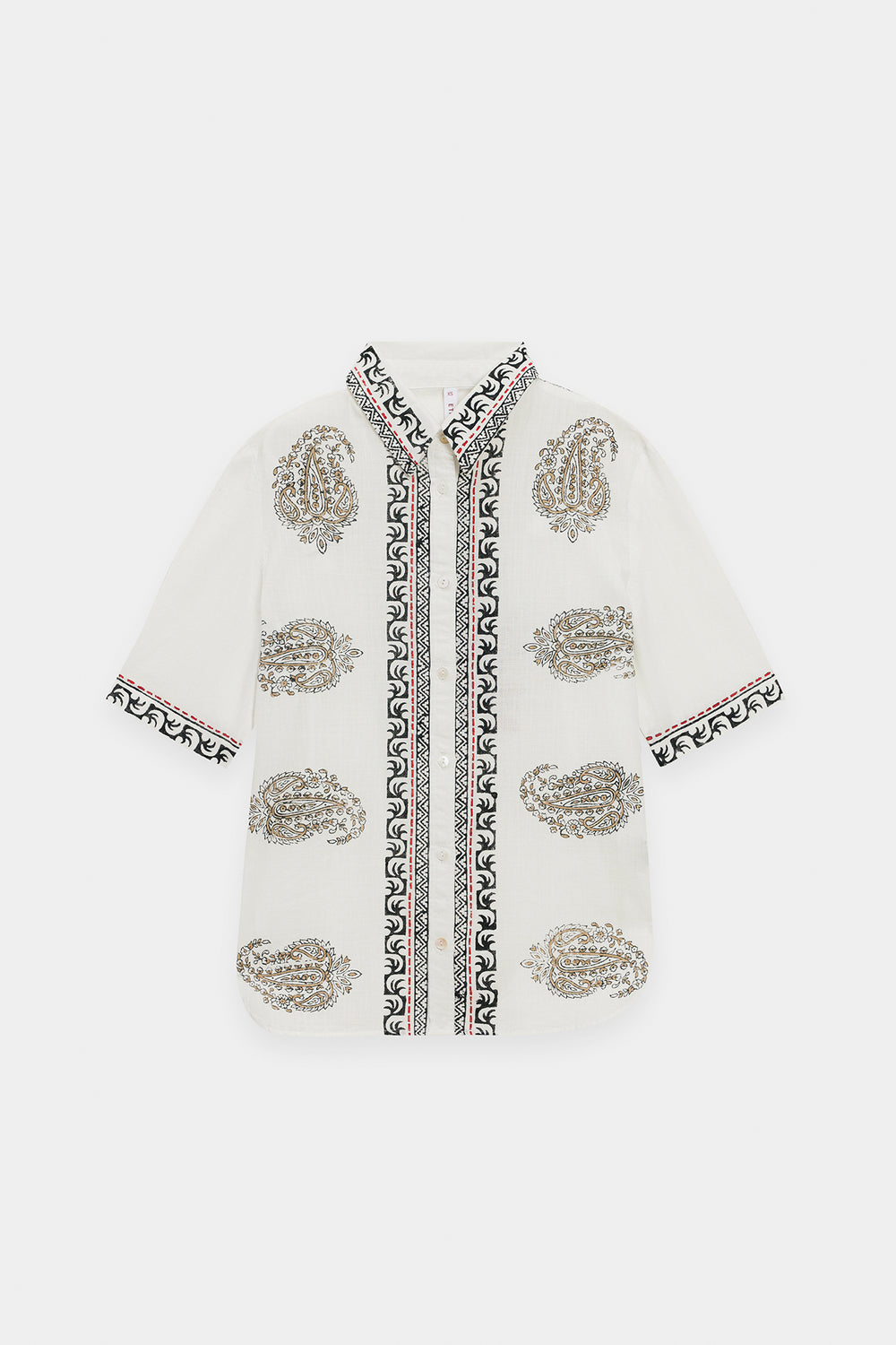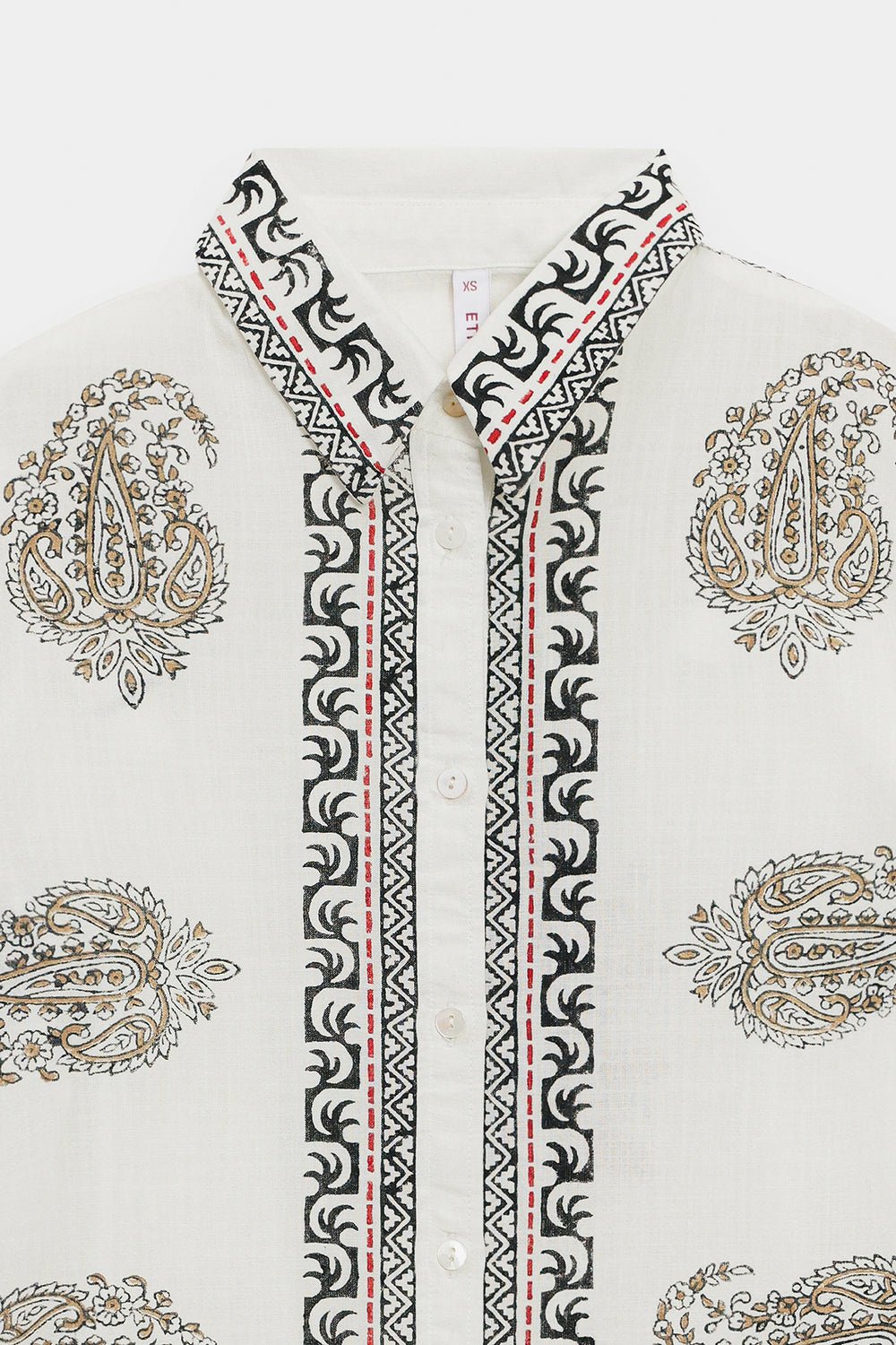 Elevate your casual wardrobe with the classic charm of this white printed kurti. This short-sleeved, straight-cut kurti is crafted from a crisp white fabric and features a classic collar with a button-down placket. It is beautifully adorned with intricate black and brown print, showcasing vertical panels of paisley and geometric patterns. This versatile kurti is shown paired with relaxed-fit, khaki-colored trousers, making it perfect for a polished, day-to-day look.