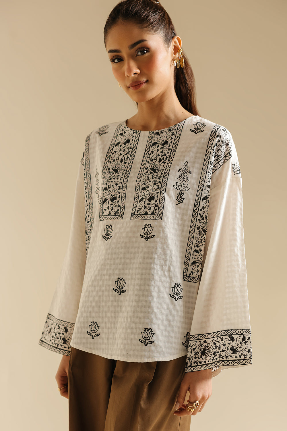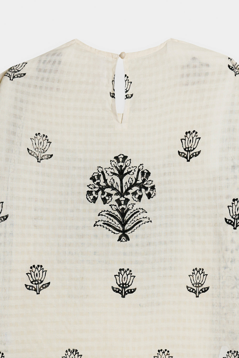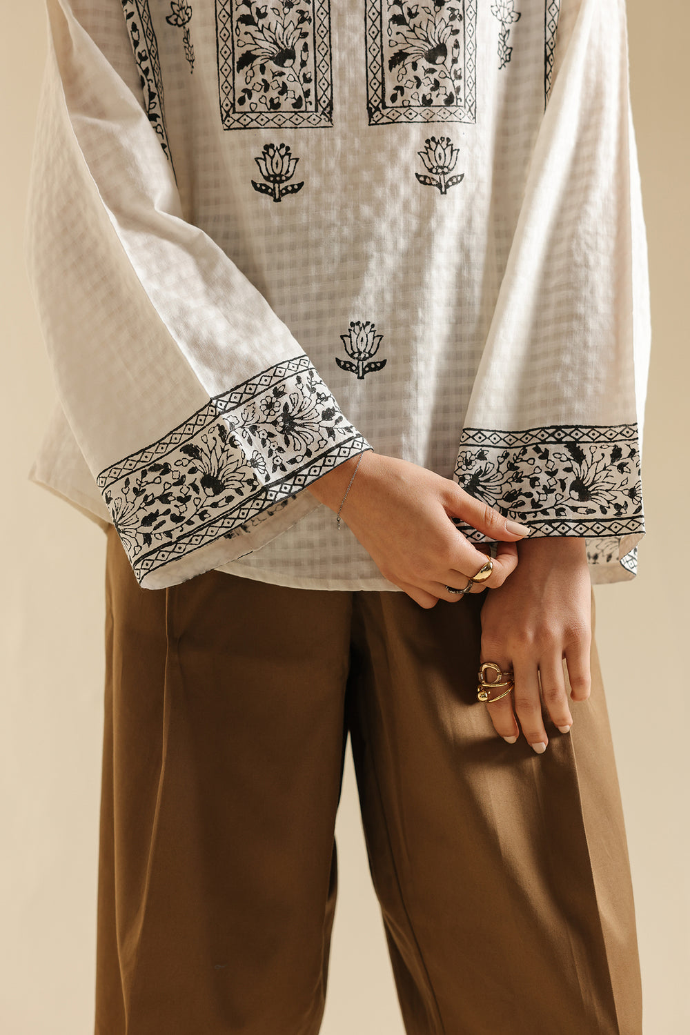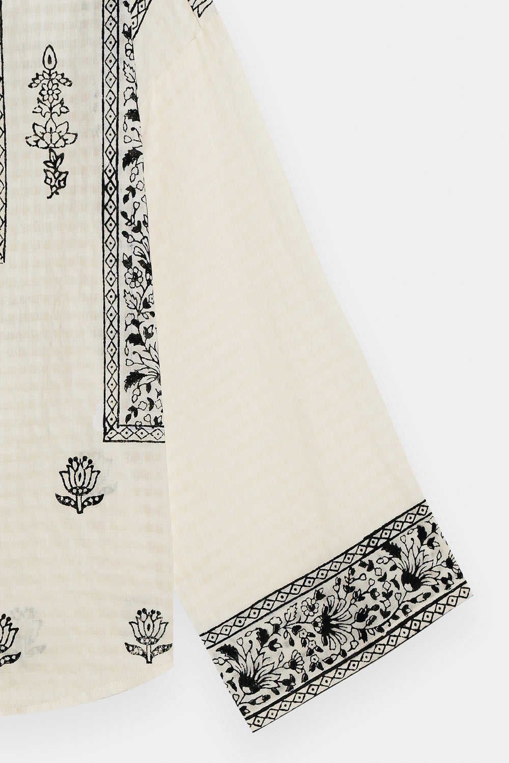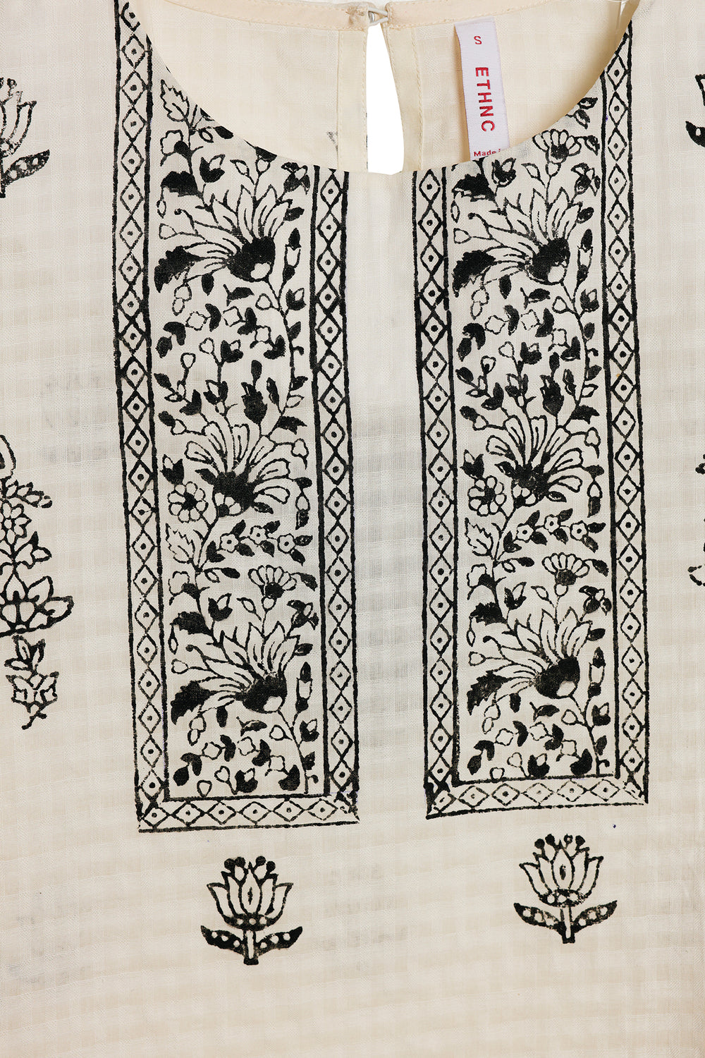 Add a touch of elegant charm to your wardrobe with this beautiful white printed kurti. This top features intricate black print in classic floral and geometric patterns, creating a sophisticated and striking look. The relaxed fit and flowy sleeves ensure both comfort and style, making it a perfect choice for a special occasion or a chic day out.