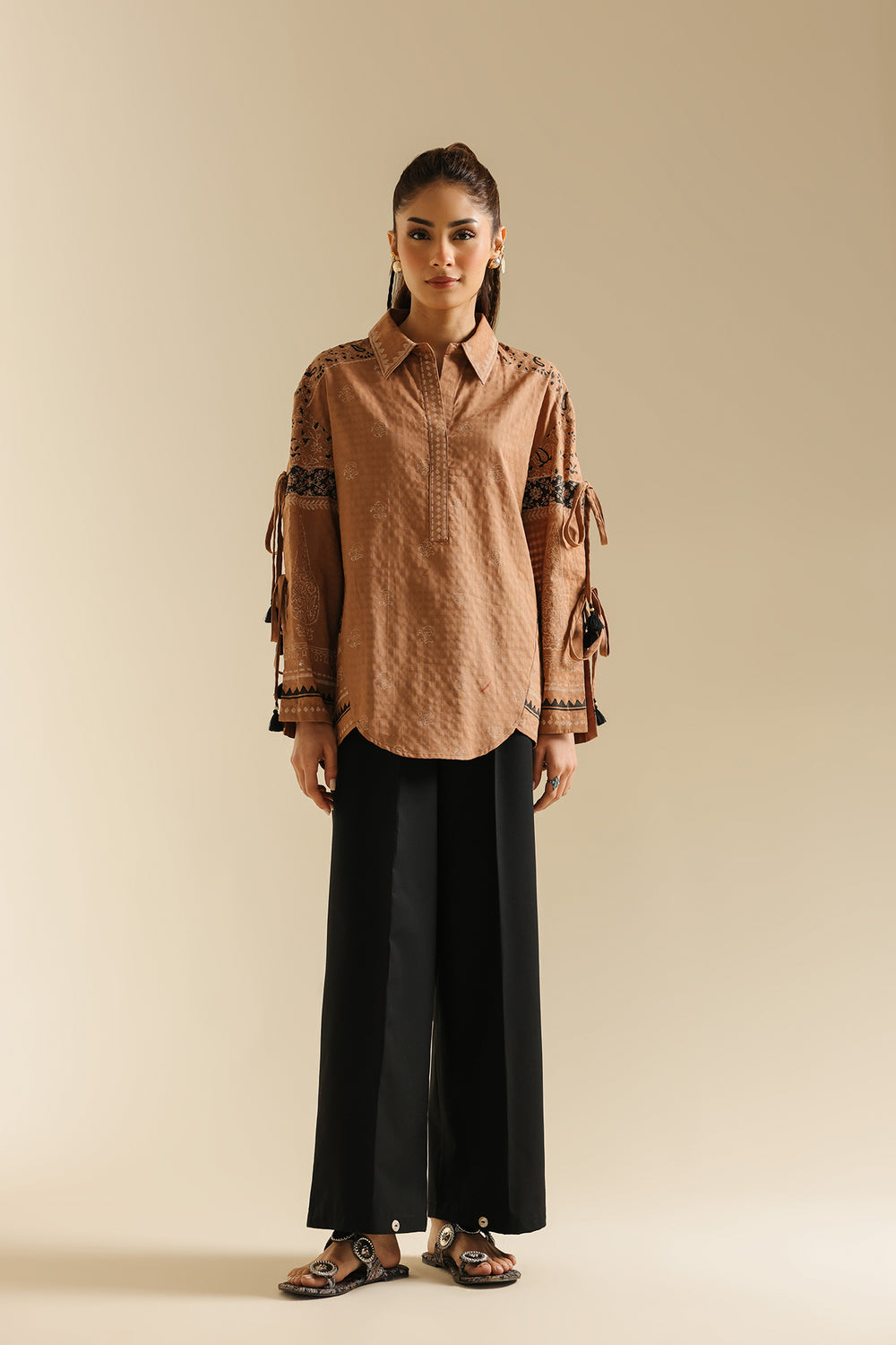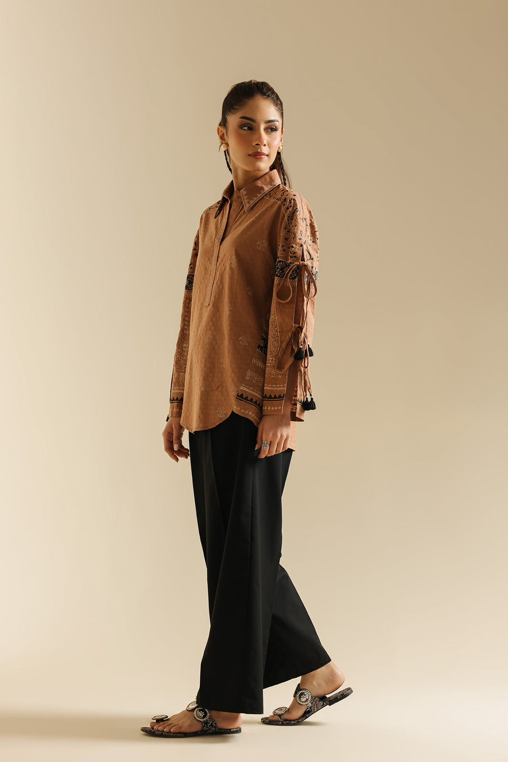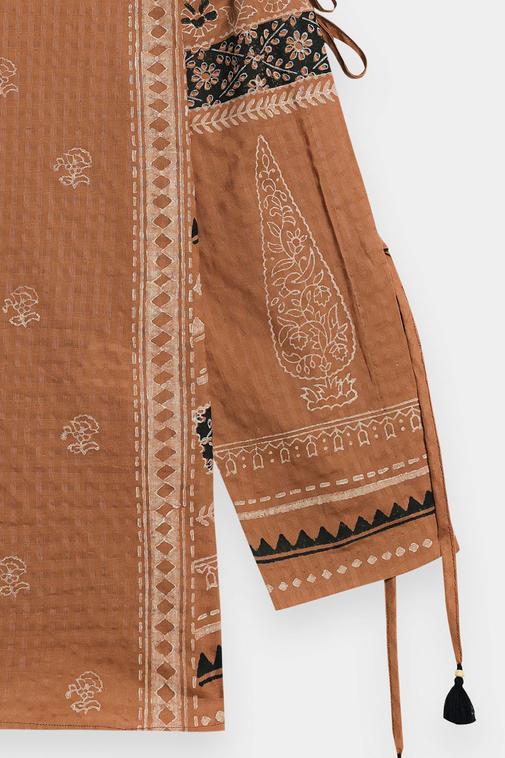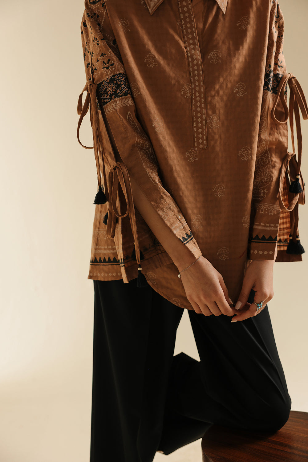 Make a unique style statement with this sophisticated brown kurti. This top features intricate print on the front and on the full sleeves, creating a beautiful and artistic contrast. The relaxed fit and elegant detailing make it perfect for both casual and semi-formal occasions.