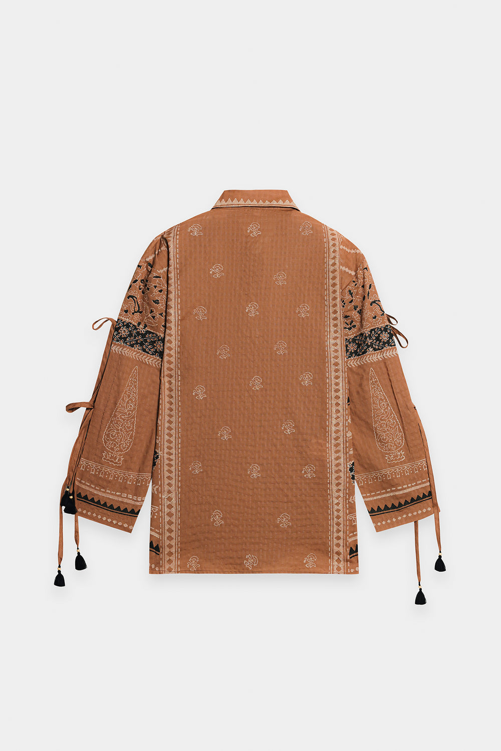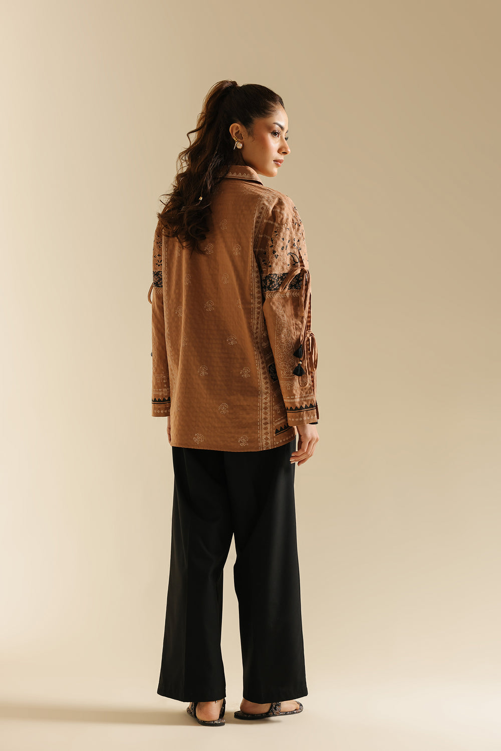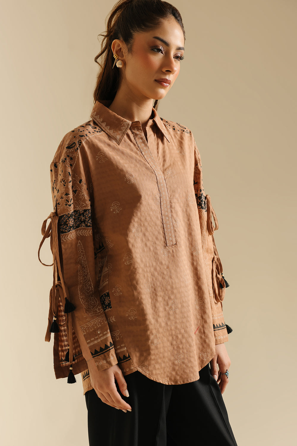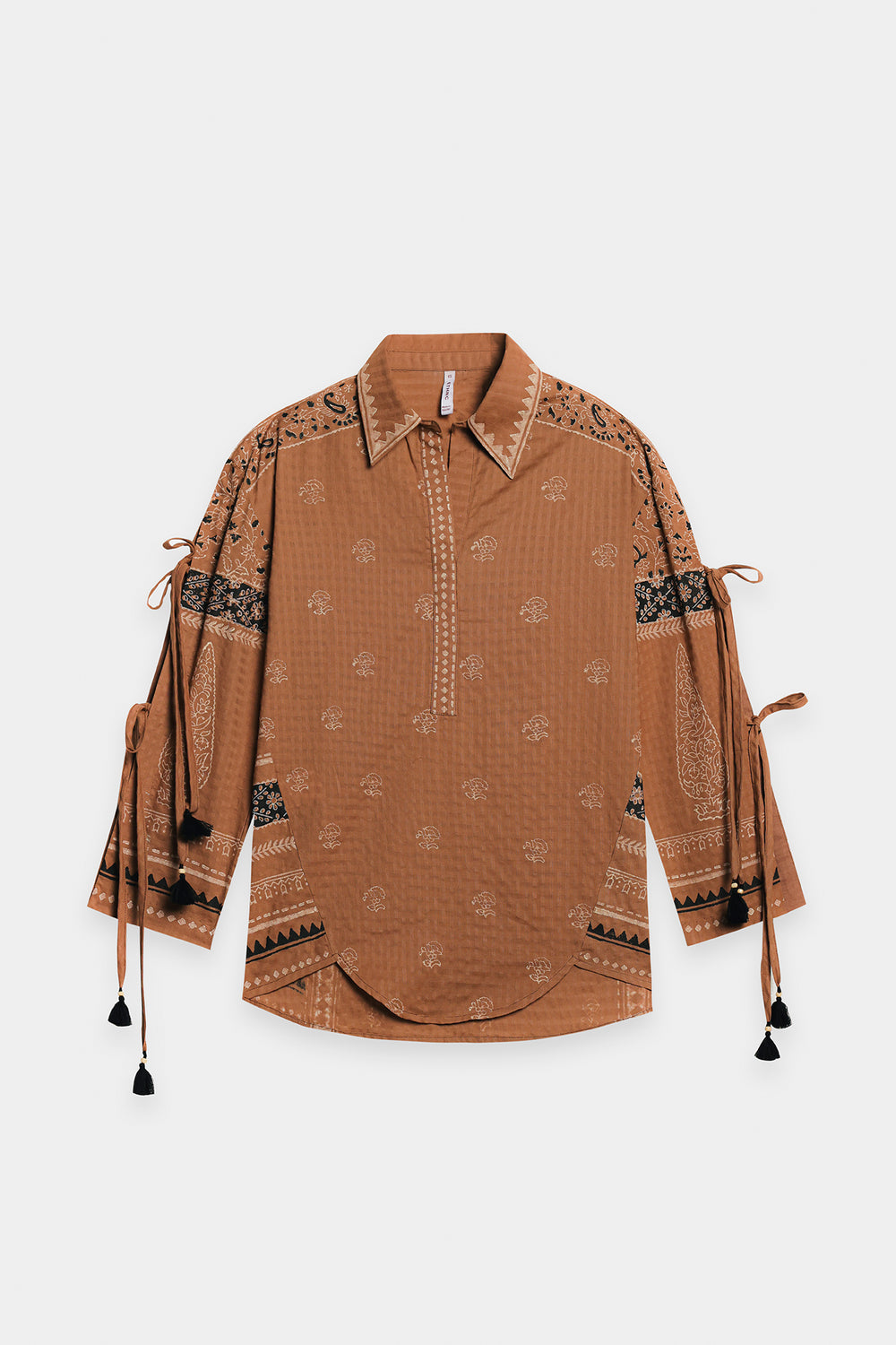 Make a unique style statement with this sophisticated brown kurti. This top features intricate print on the front and on the full sleeves, creating a beautiful and artistic contrast. The relaxed fit and elegant detailing make it perfect for both casual and semi-formal occasions.