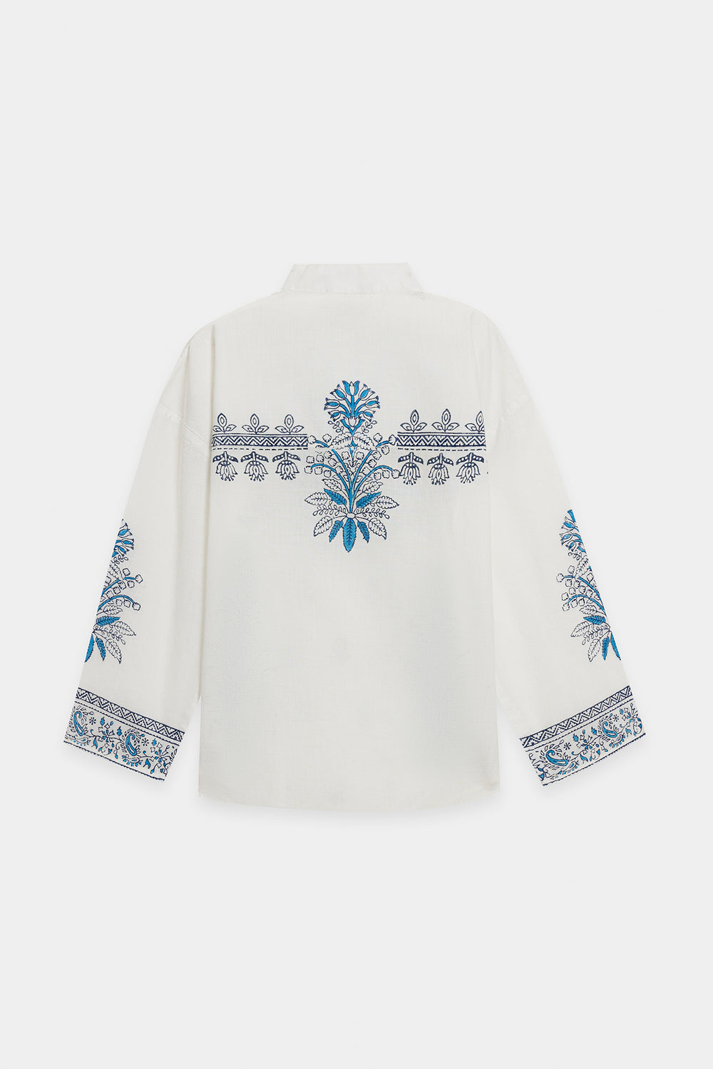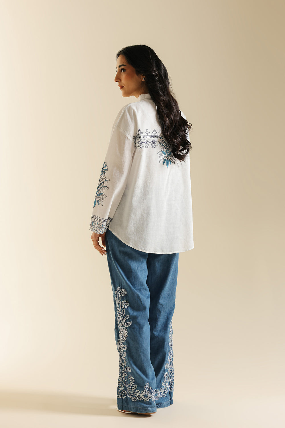 Add a fresh, breezy feel to your wardrobe with this stylish white printed kurti. This relax fit shirt is made from a crisp white fabric and features a band collar with a slit neckline. The entire top is adorned with beautiful, contrasting indigo blue print in traditional floral and botanical motifs. The print is concentrated around the yoke, shoulders, and the long sleeves. This elegant kurti offers a contemporary take on classic folk patterns, perfect for pairing with denim or embroidered trousers.