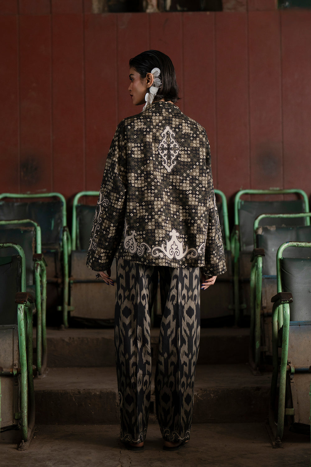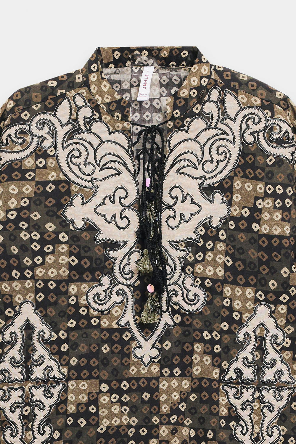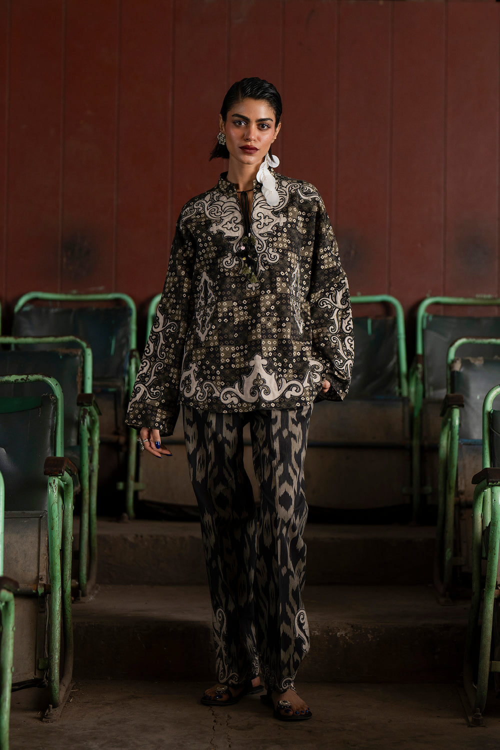 Command attention in this striking monotone ensemble featuring a relaxed-fit shirt and matching straight trouser. The fabric is entirely covered in a mesmerizing, complex digital print combining black, dark brown, and off-white in an intricate blend of ornamental, ikat, and geometric patterns. The shirt features subtle, contrasting white embroidery around the V-neckline, adding textural detail to the already rich pattern. With its full sleeves and dramatic all-over pattern, this suit offers a sophisticated, contemporary silhouette with a deep, earthy color palette.