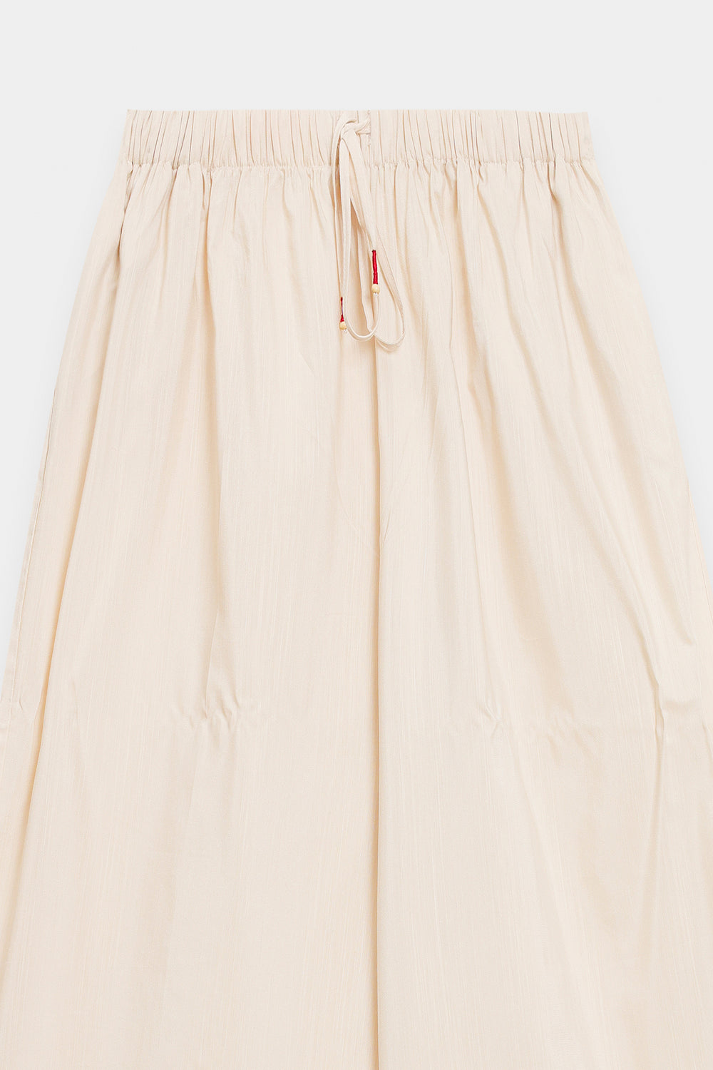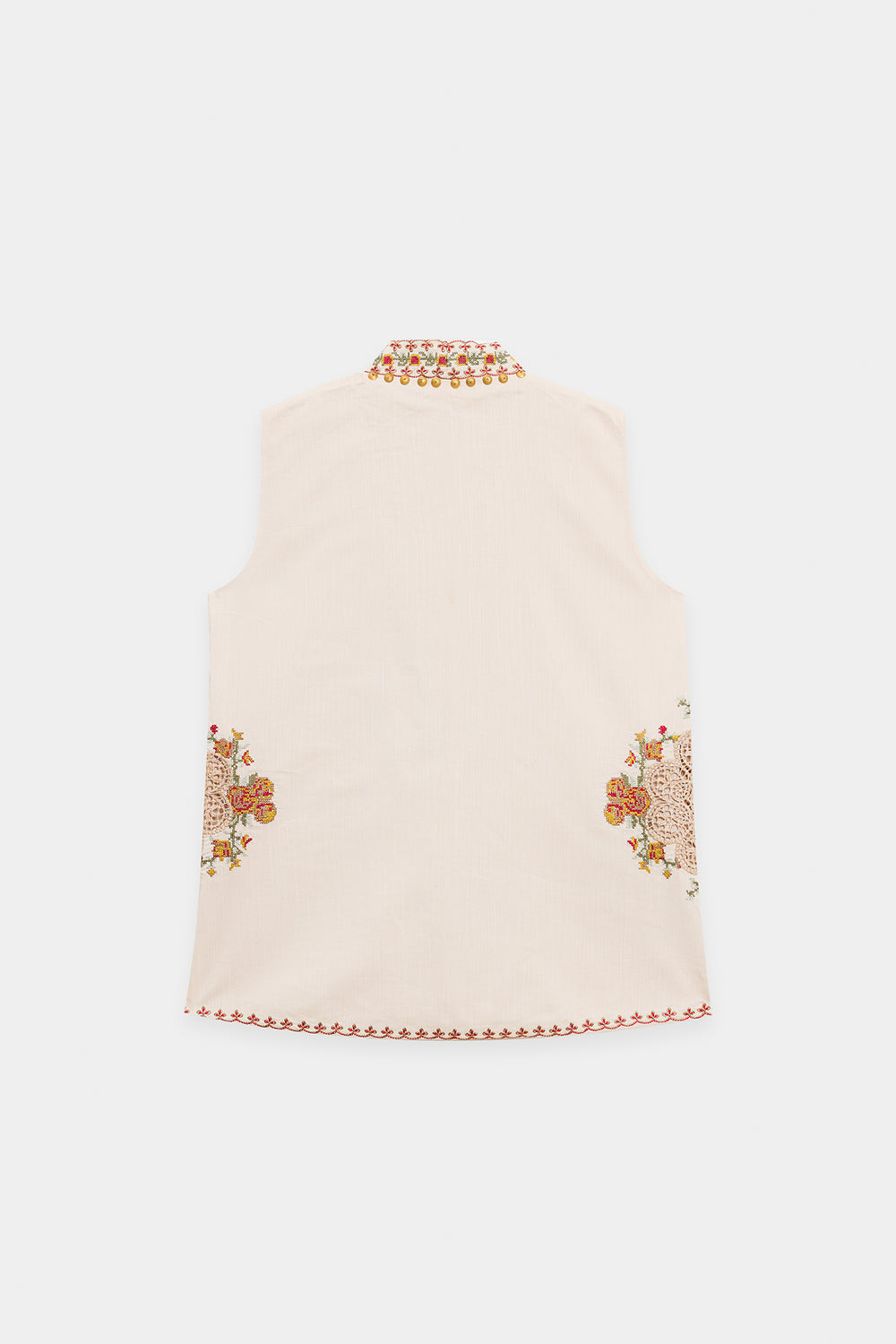 Capture timeless grace in this stunning embroidered suit. This distinctive two-piece ensemble features a sleeveless, wrap-style shirt and matching relaxed-fit shalwar, both crafted in a light, comfortable off-white fabric. The top is beautifully adorned with intricate, multicoloured floral embroidery. Rich red thread work traces the edges and frames the V-neckline, while delicate floral motifs in shades of red, green, and mustard yellow trail across the front and bottom hem. The accompanying shalwar feature a comfortable, billowy fit, creating an elegant, layered look that beautifully showcases the detailed artistry of the embroidery.