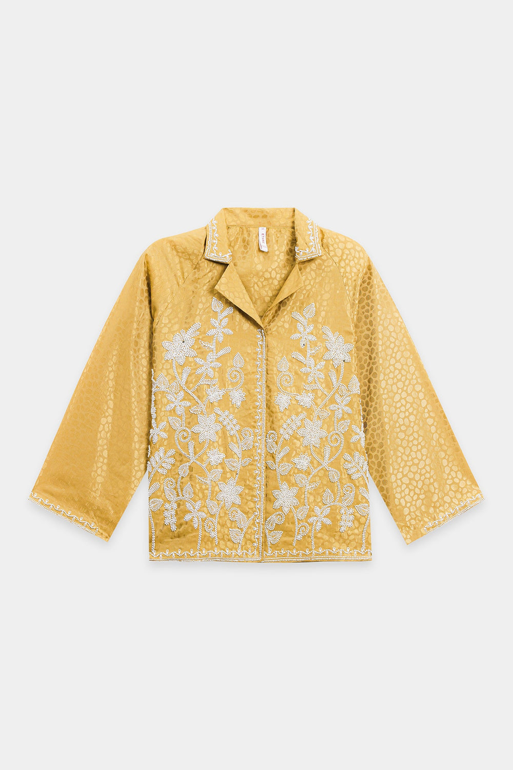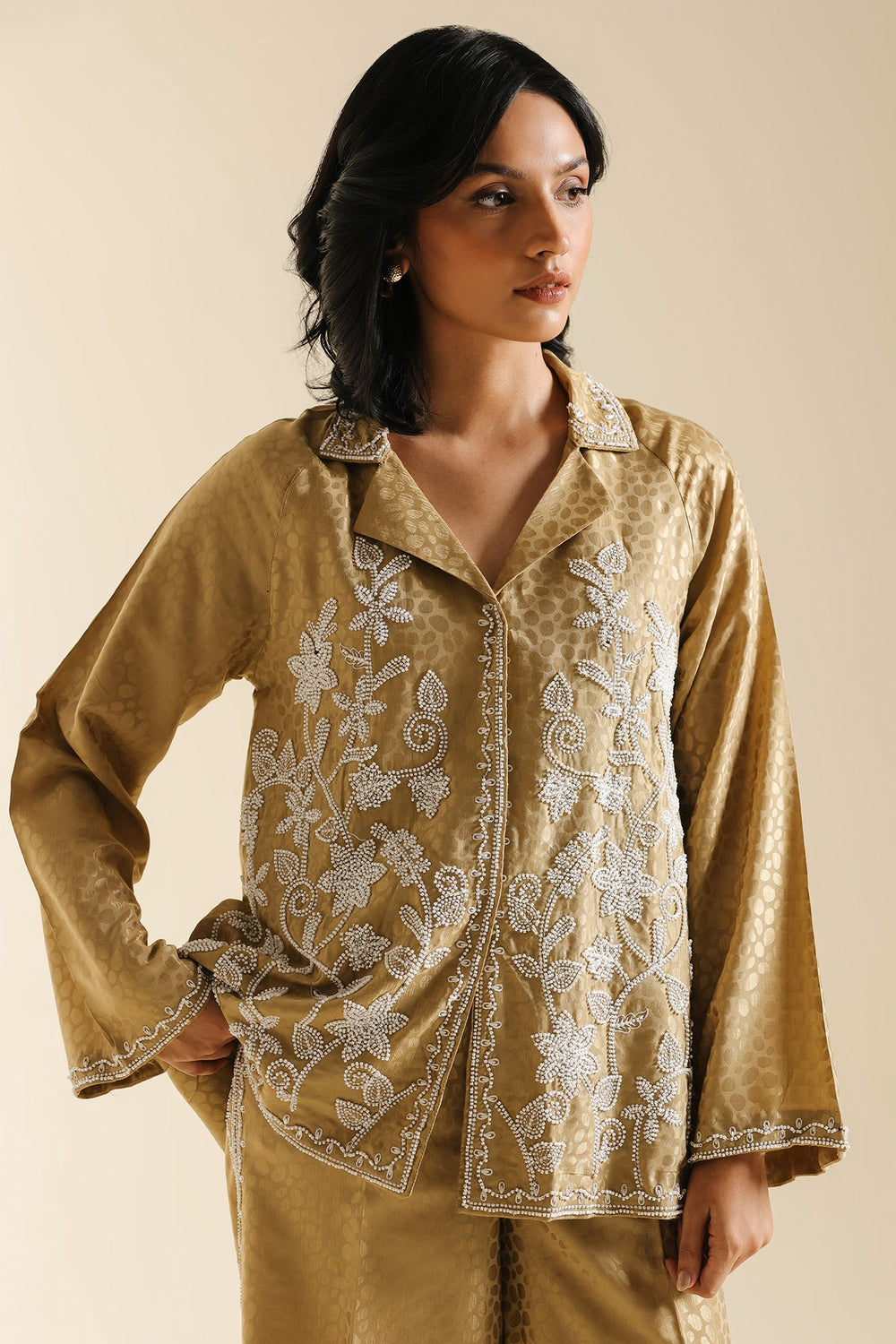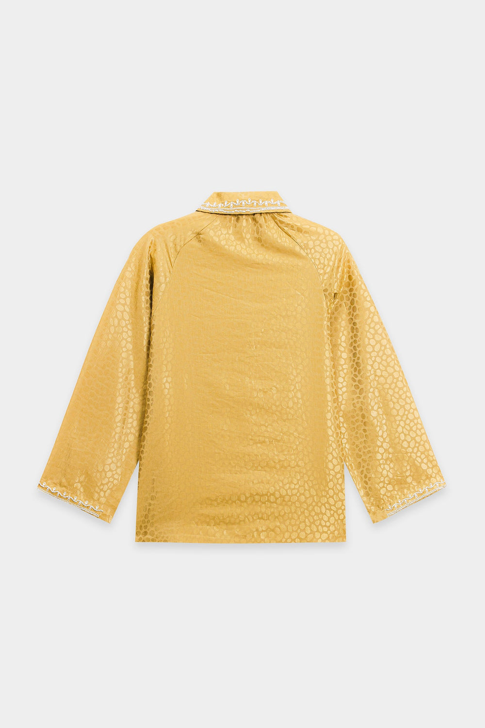 Indulge in pure luxury with this magnificent embroidered suit. This spectacular two-piece ensemble is crafted from a rich, shimmering gold fabric that features a subtle, all-over circular jacquard pattern. The shirt features a classic collared design and is beautifully embellished with elaborate silver floral beadwork that cascades down the front. The suit is completed by matching bell bottom trouser, ensuring this stunning ensemble is perfect for formal events, offering a modern, opulent interpretation of traditional wear.