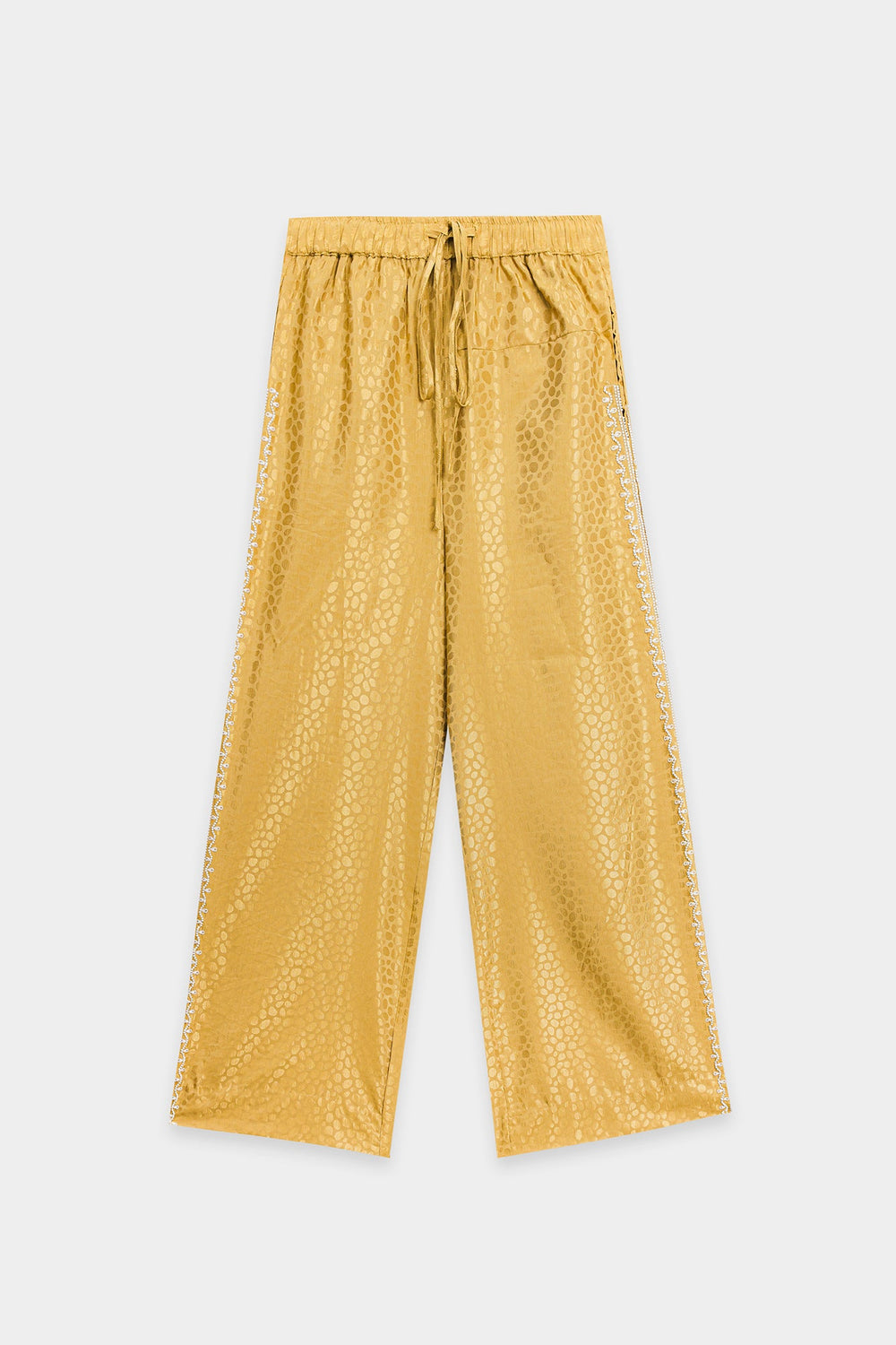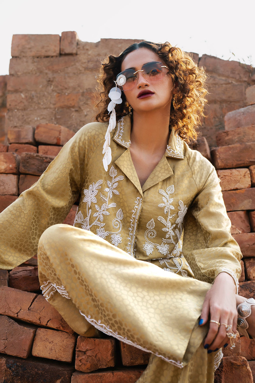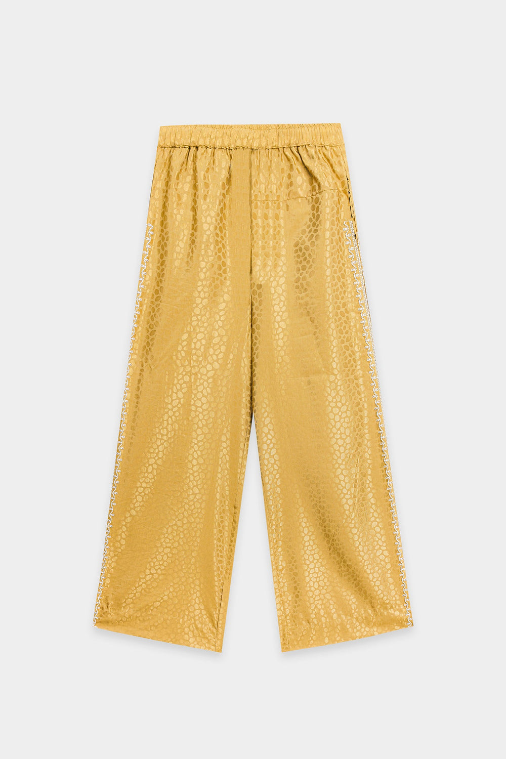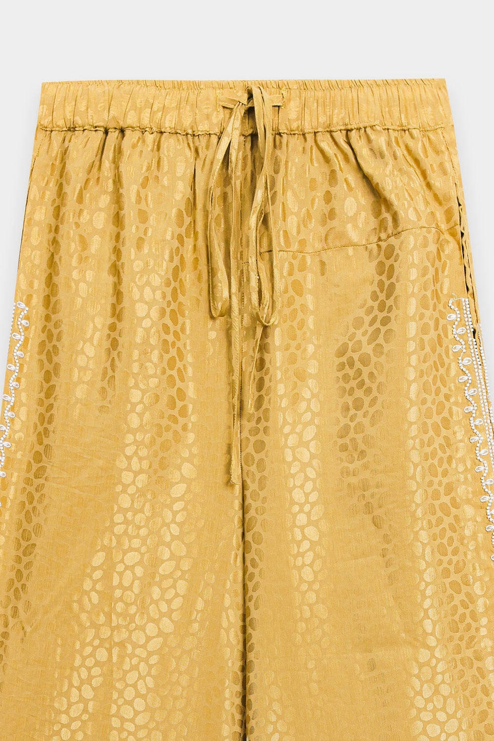 Indulge in pure luxury with this magnificent embroidered suit. This spectacular two-piece ensemble is crafted from a rich, shimmering gold fabric that features a subtle, all-over circular jacquard pattern. The shirt features a classic collared design and is beautifully embellished with elaborate silver floral beadwork that cascades down the front. The suit is completed by matching bell bottom trouser, ensuring this stunning ensemble is perfect for formal events, offering a modern, opulent interpretation of traditional wear.