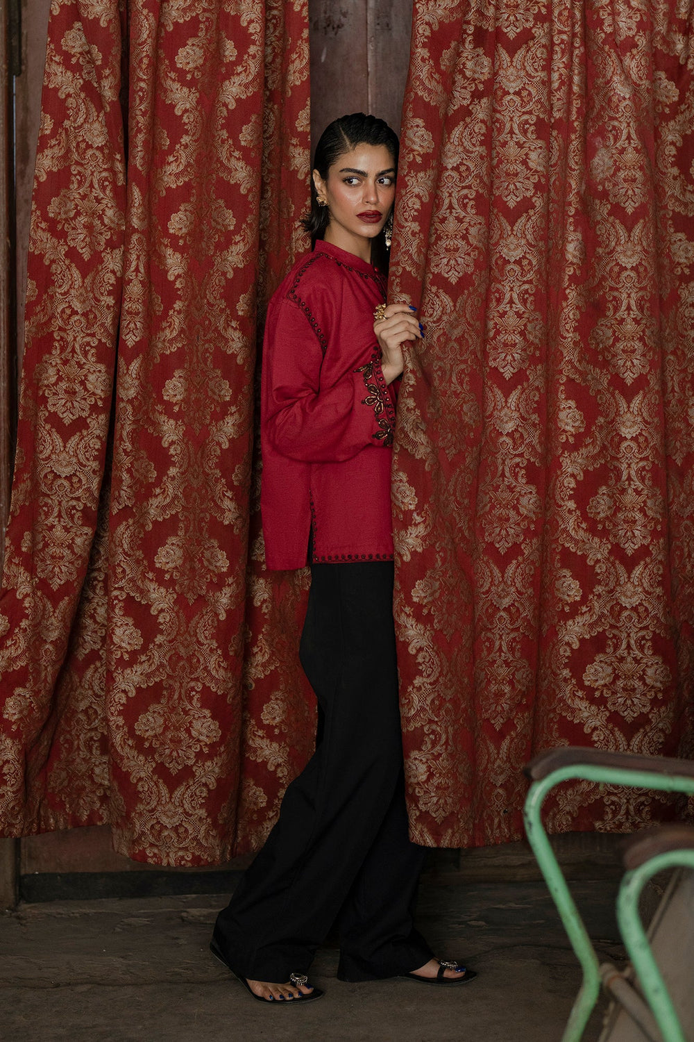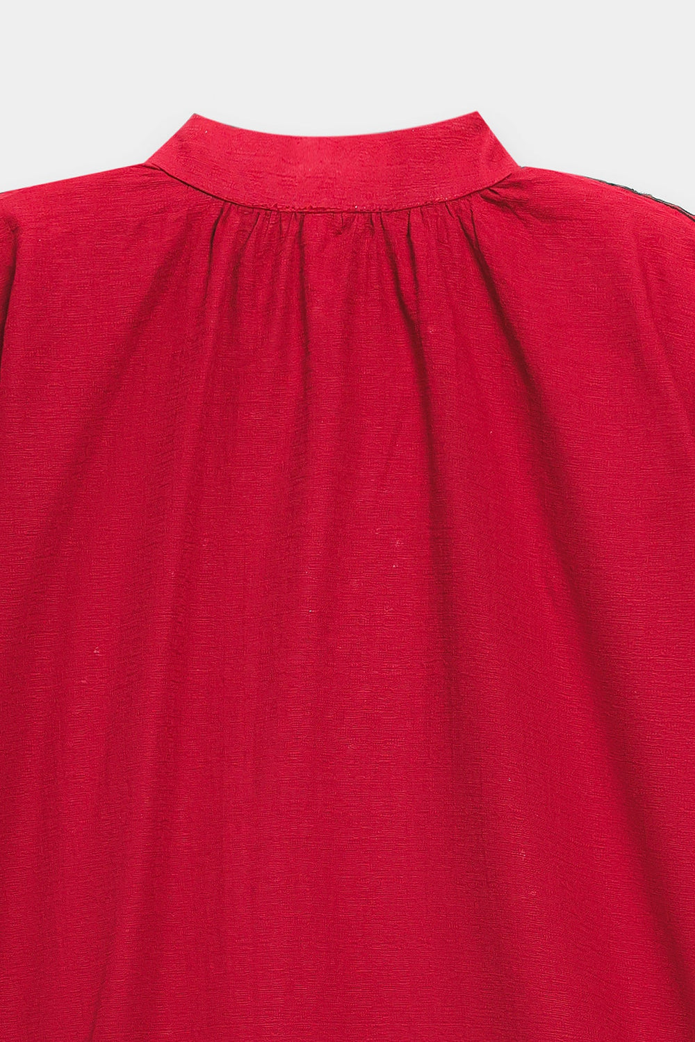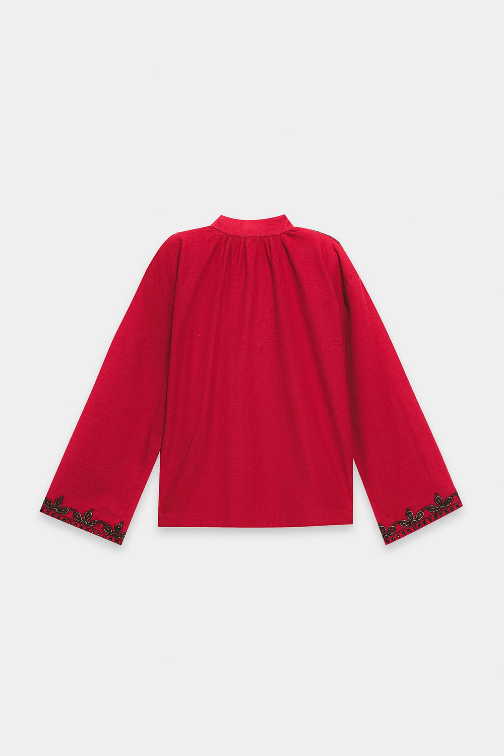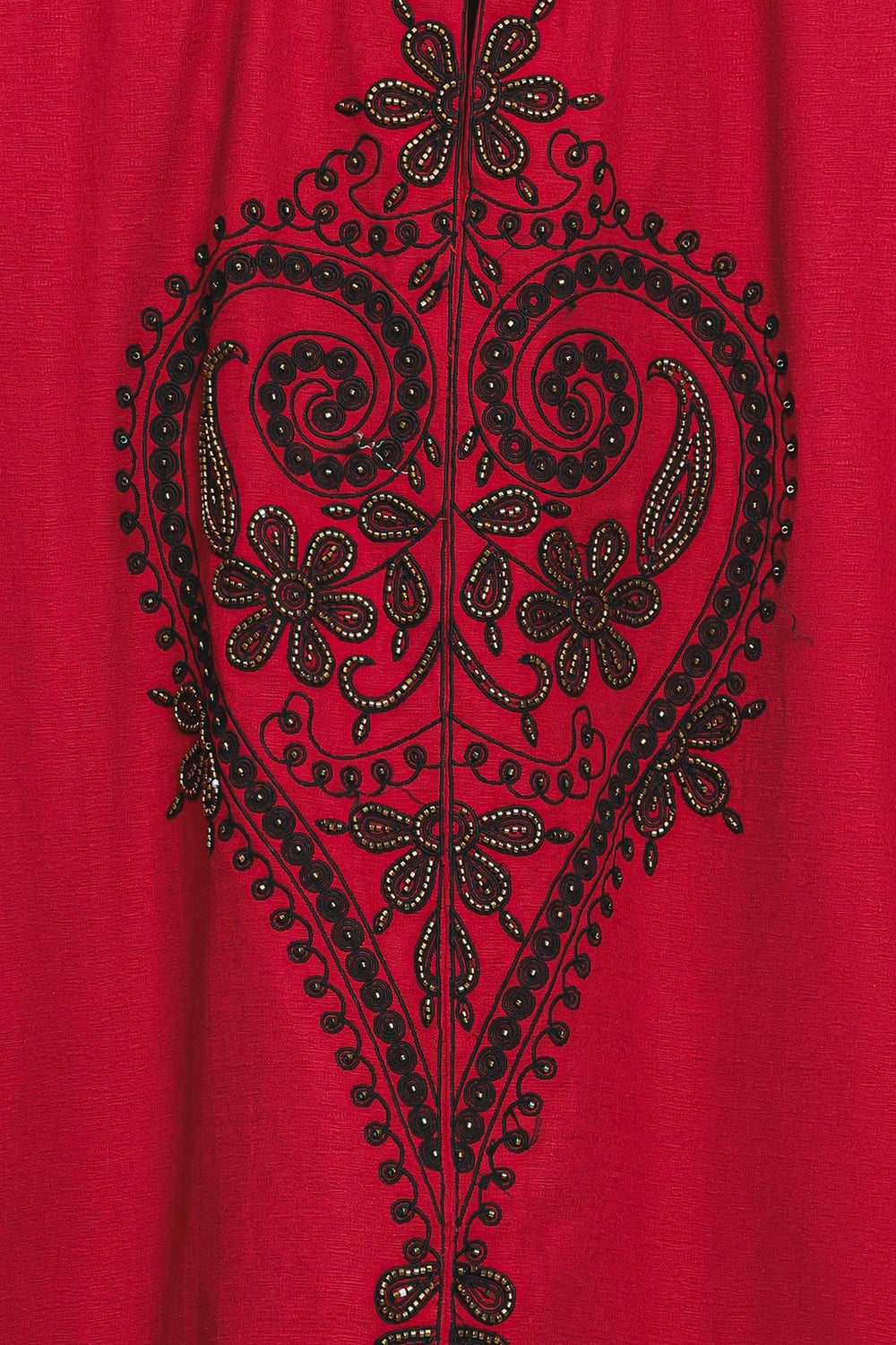 Make a bold and vibrant statement with this striking crimson red top, featuring intricate black ethnic embroidery. The design is centred around a large, heart-shaped medallion on the front, composed of delicate floral swirls and traditional patterns. This detailed craftsmanship extends to the hem and sleeve cuffs, which are adorned with a matching scalloped border. A small standing collar leads into a clean, split neckline with a single button closure, adding a refined structure to the relaxed, boxy silhouette. With its wide, long sleeves and lightweight fabric, this top offers a perfect fusion of cultural artistry and modern style.