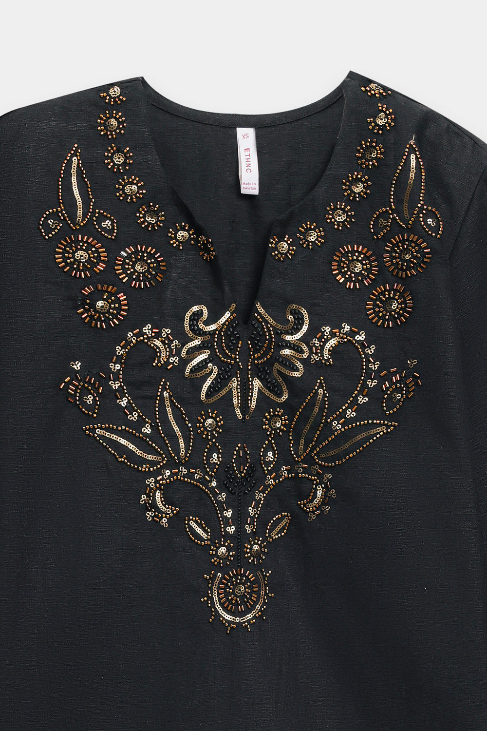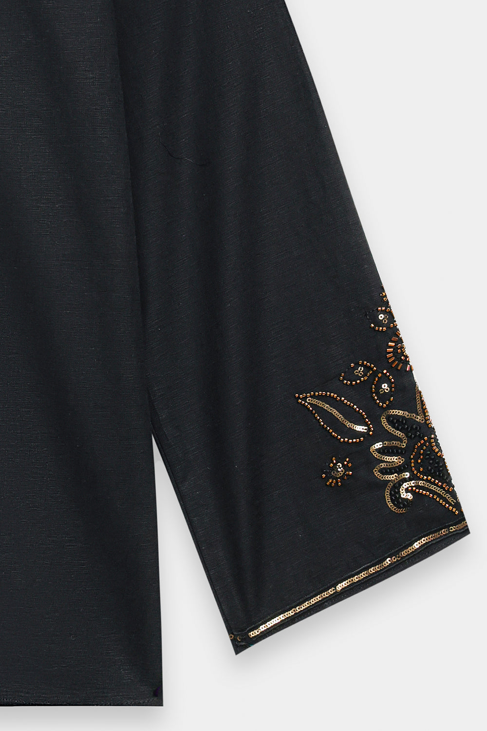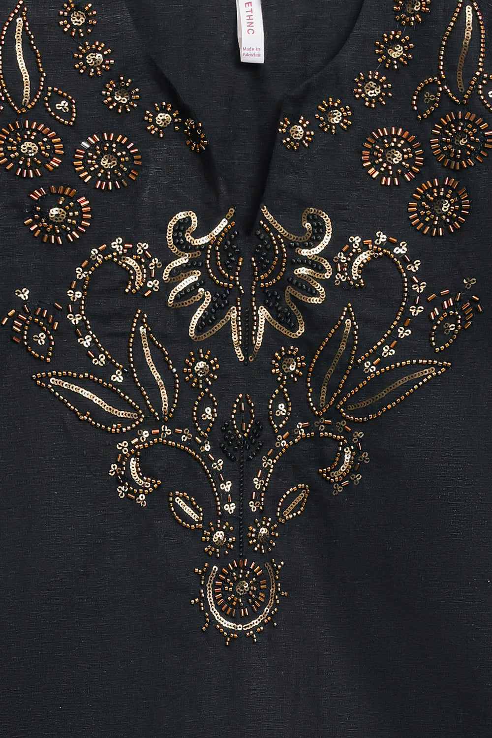 Make a statement in timeless black with this beautifully detailed embroidered top. This comfortable, relaxed-fit ensemble features a kurti-style top, crafted from a rich, solid black fabric. The top is elegantly adorned with intricate bronze or gold metallic embroidery around the V-neckline, extending across the yoke in delicate ornamental patterns. The long, loose sleeves are finished with a broad band of matching embroidery at the cuffs. This top is a sophisticated piece that pairs the drama of a classic black palette with the subtle luxury of metallic threadwork.