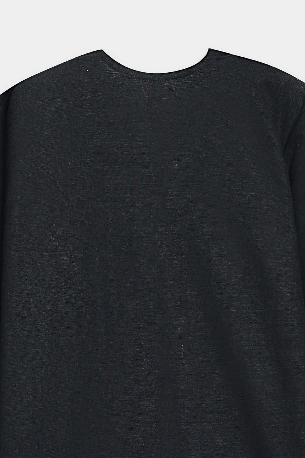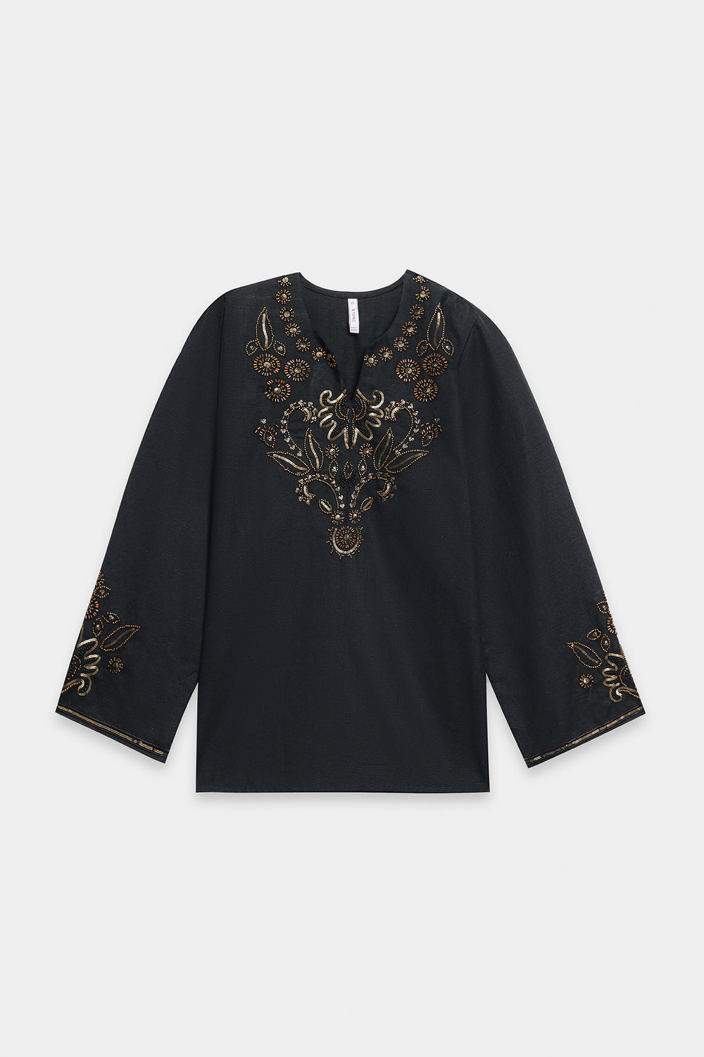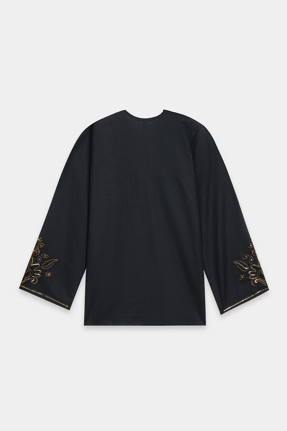 Make a statement in timeless black with this beautifully detailed embroidered top. This comfortable, relaxed-fit ensemble features a kurti-style top, crafted from a rich, solid black fabric. The top is elegantly adorned with intricate bronze or gold metallic embroidery around the V-neckline, extending across the yoke in delicate ornamental patterns. The long, loose sleeves are finished with a broad band of matching embroidery at the cuffs. This top is a sophisticated piece that pairs the drama of a classic black palette with the subtle luxury of metallic threadwork.