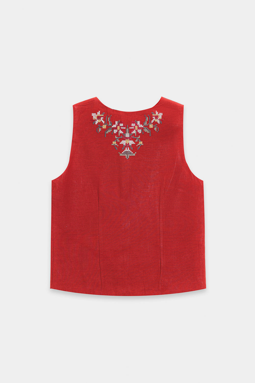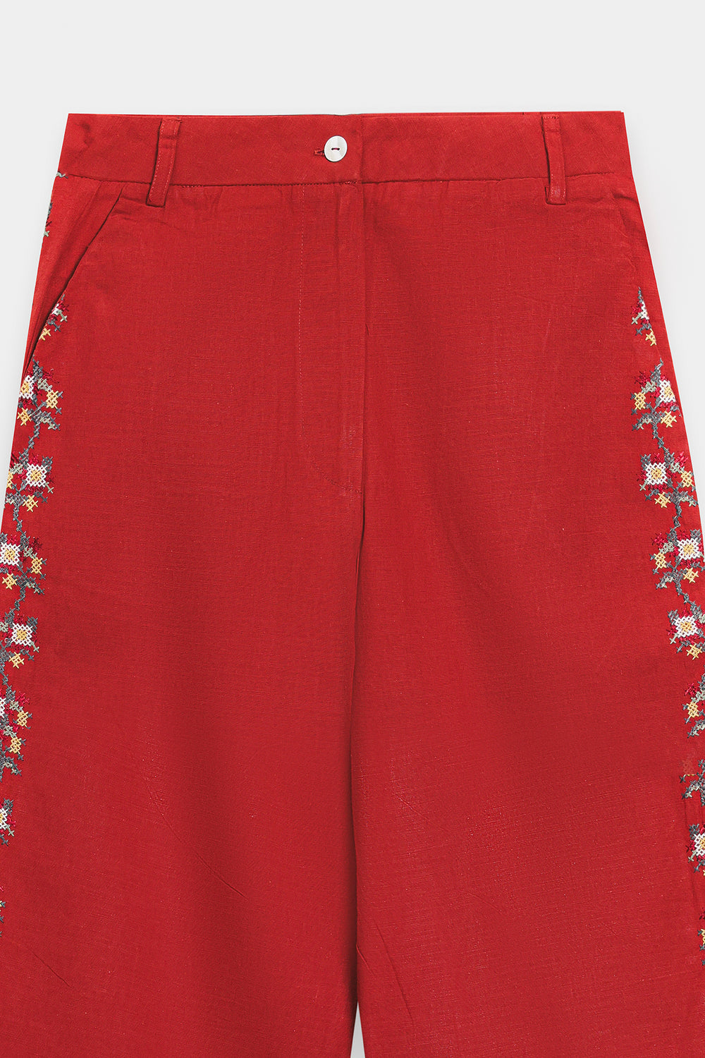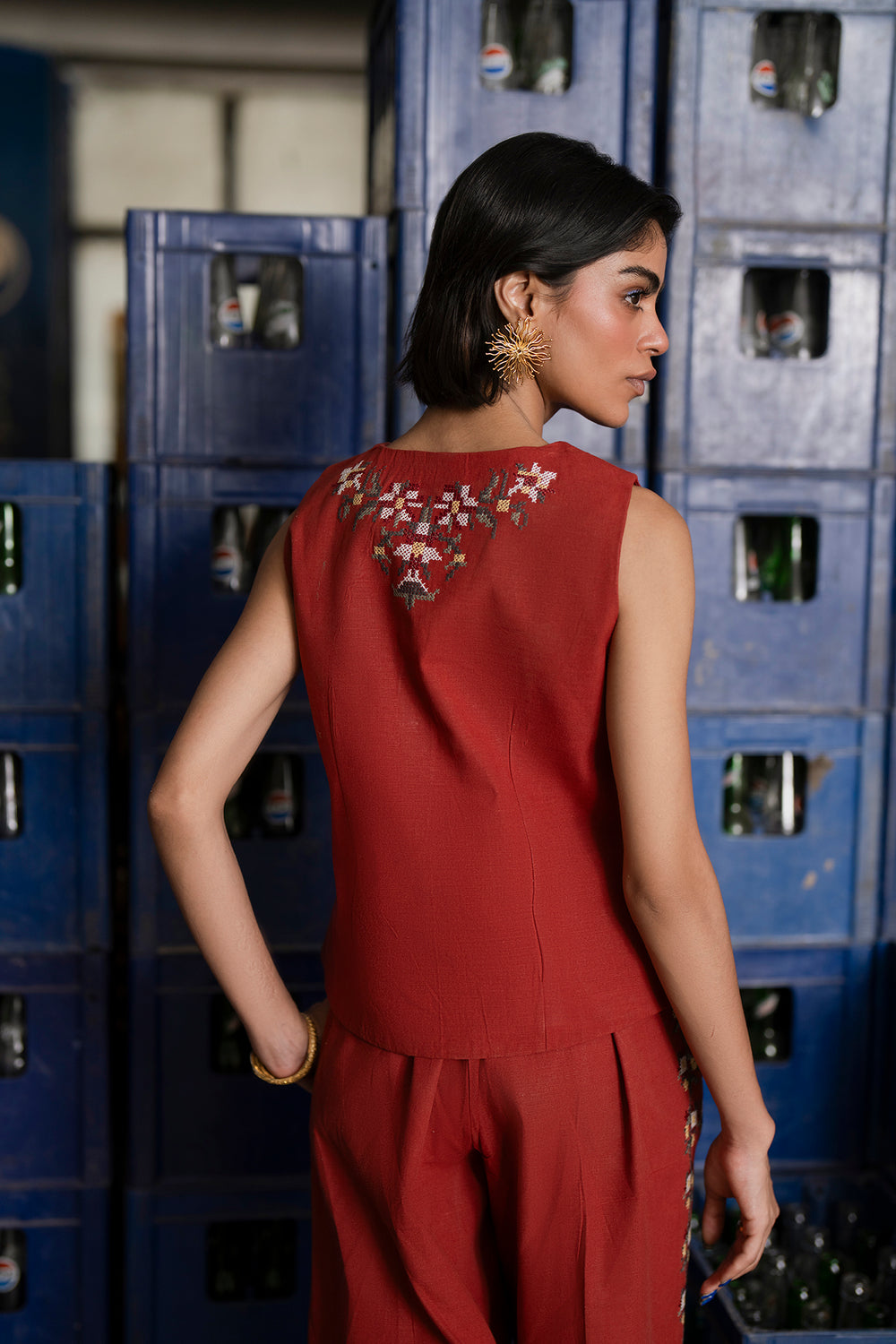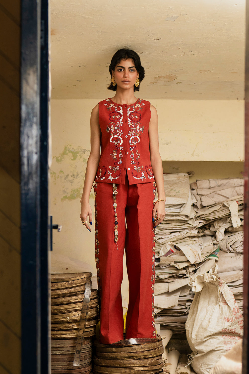 Radiate fiery elegance in this striking embroidered suit. This distinctive two-piece ensemble features a sleeveless waistcoat-style top and matching wide-leg trouser, both crafted from a rich, textured terra cotta fabric. The short top is beautifully detailed with ornate white, black, and red thread embroidery across the yoke and front panels. The wide-leg trouser feature coordinating embroidery and subtle metallic embellishments down the outer seams. This suit is a bold and sophisticated statement, showcasing rich color and intricate craftsmanship in a contemporary silhouette.
