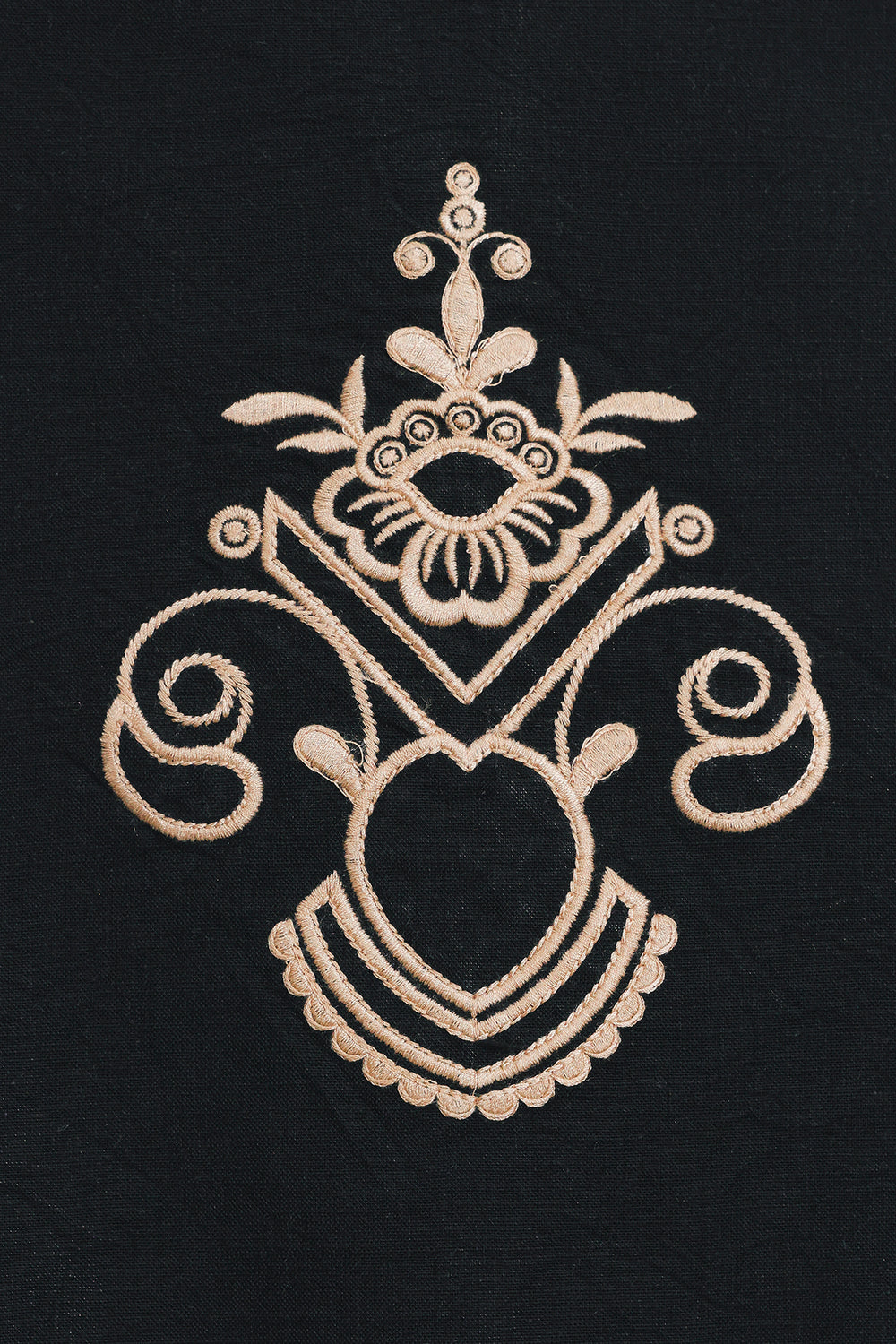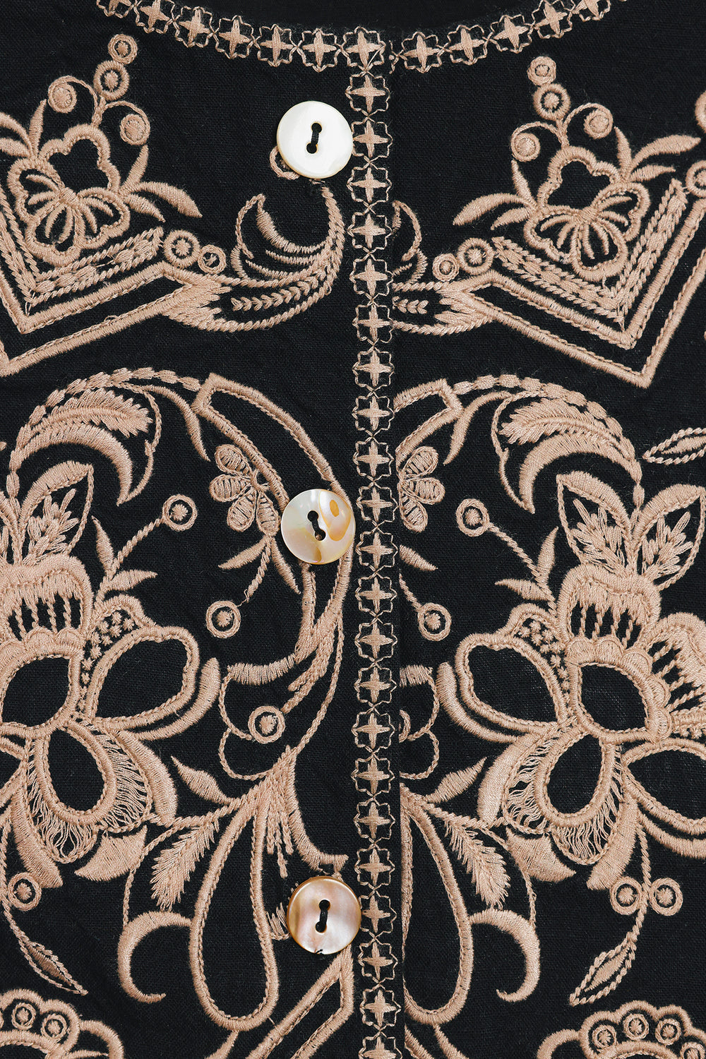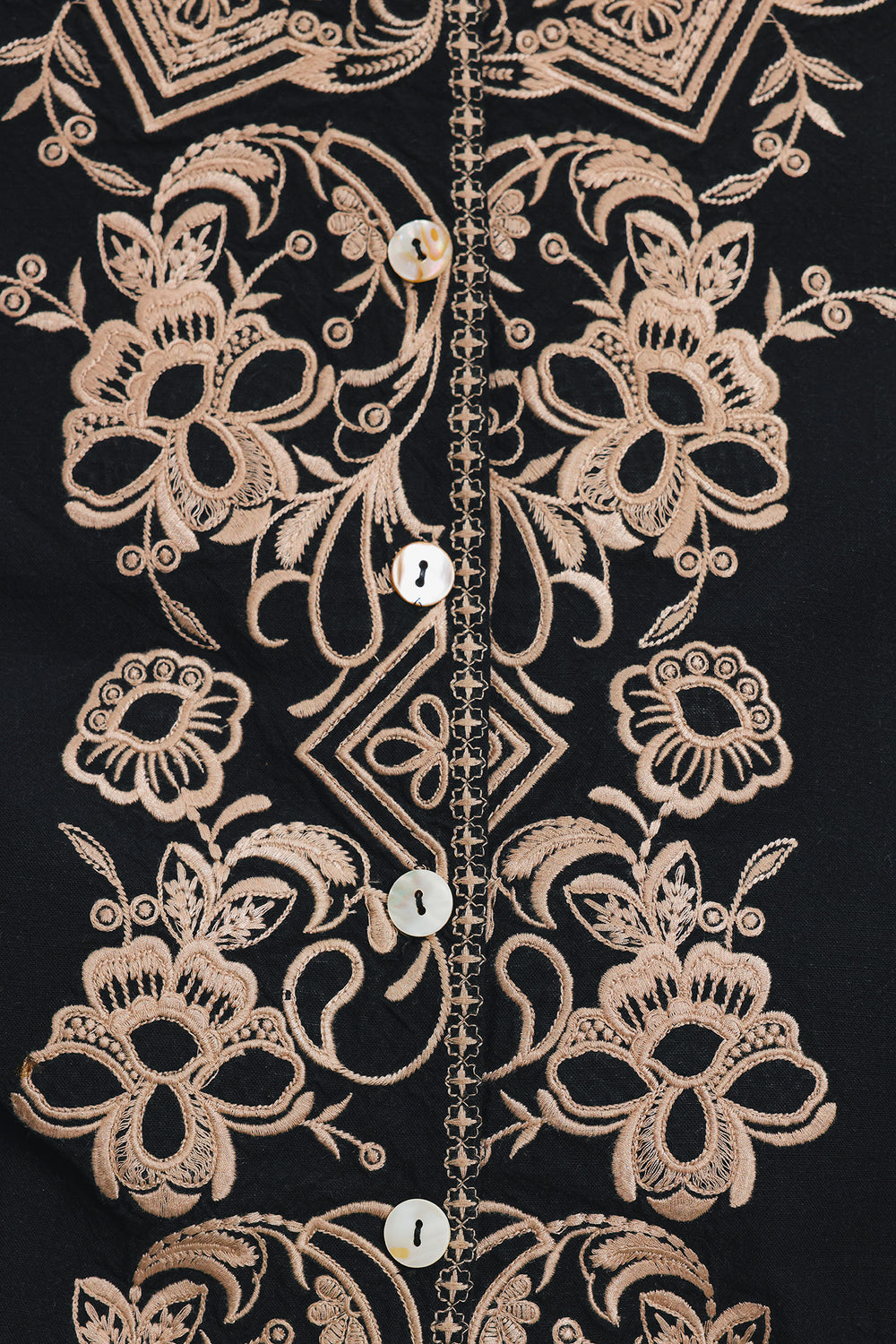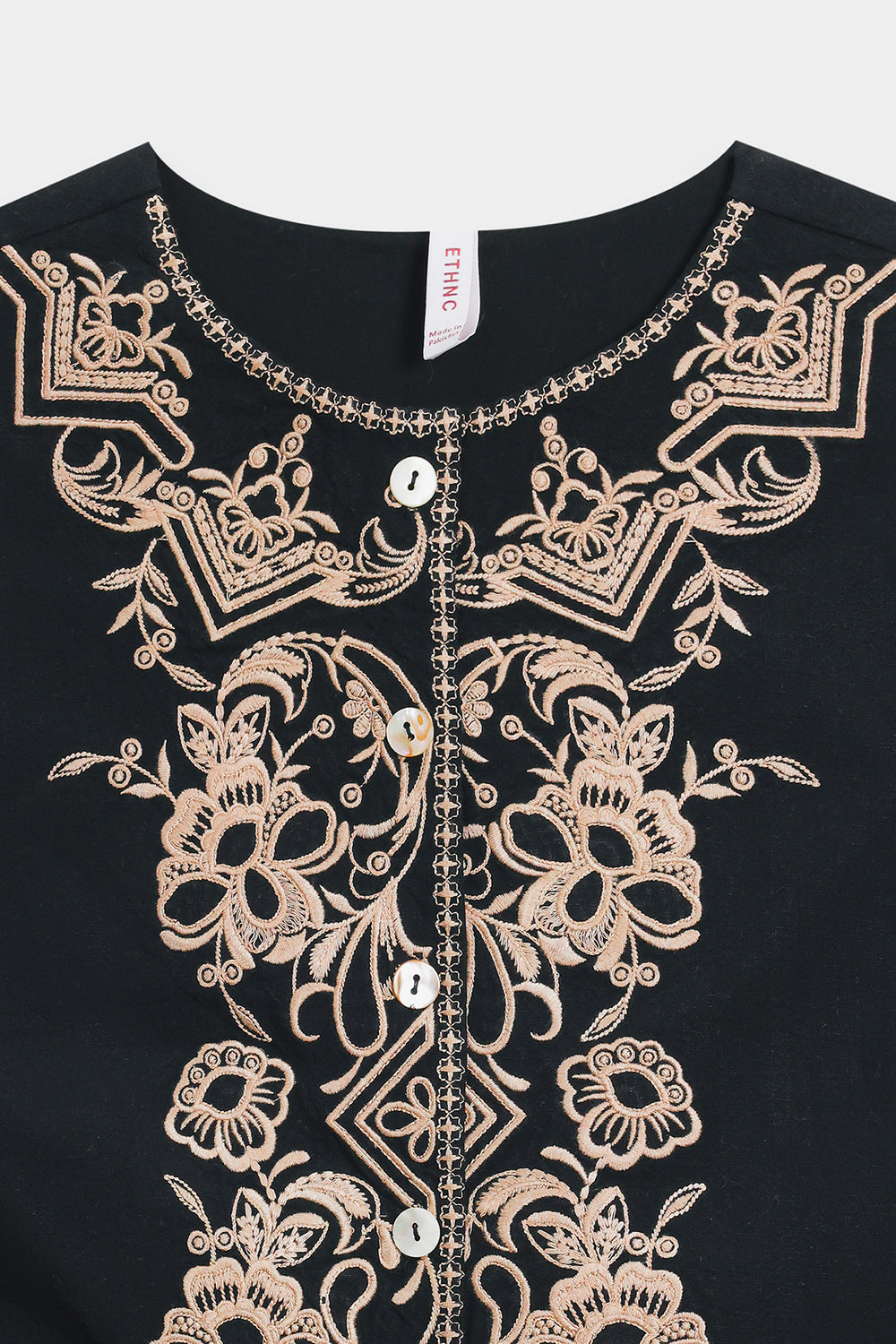 Channel bold, traditional glamour with this stunning embroidered top. This top features a sleeveless, structured waistcoat-style silhouette, crafted from a rich, solid black fabric. The top is richly adorned with intricate gold and off-white embroidery forming symmetrical floral and ornamental motifs across the chest and along the bottom edges. The waistcoat is elegantly fastened with small buttons and features a flattering, slightly pointed hemline, completing a powerful, contemporary look that is both dramatic and comfortable.