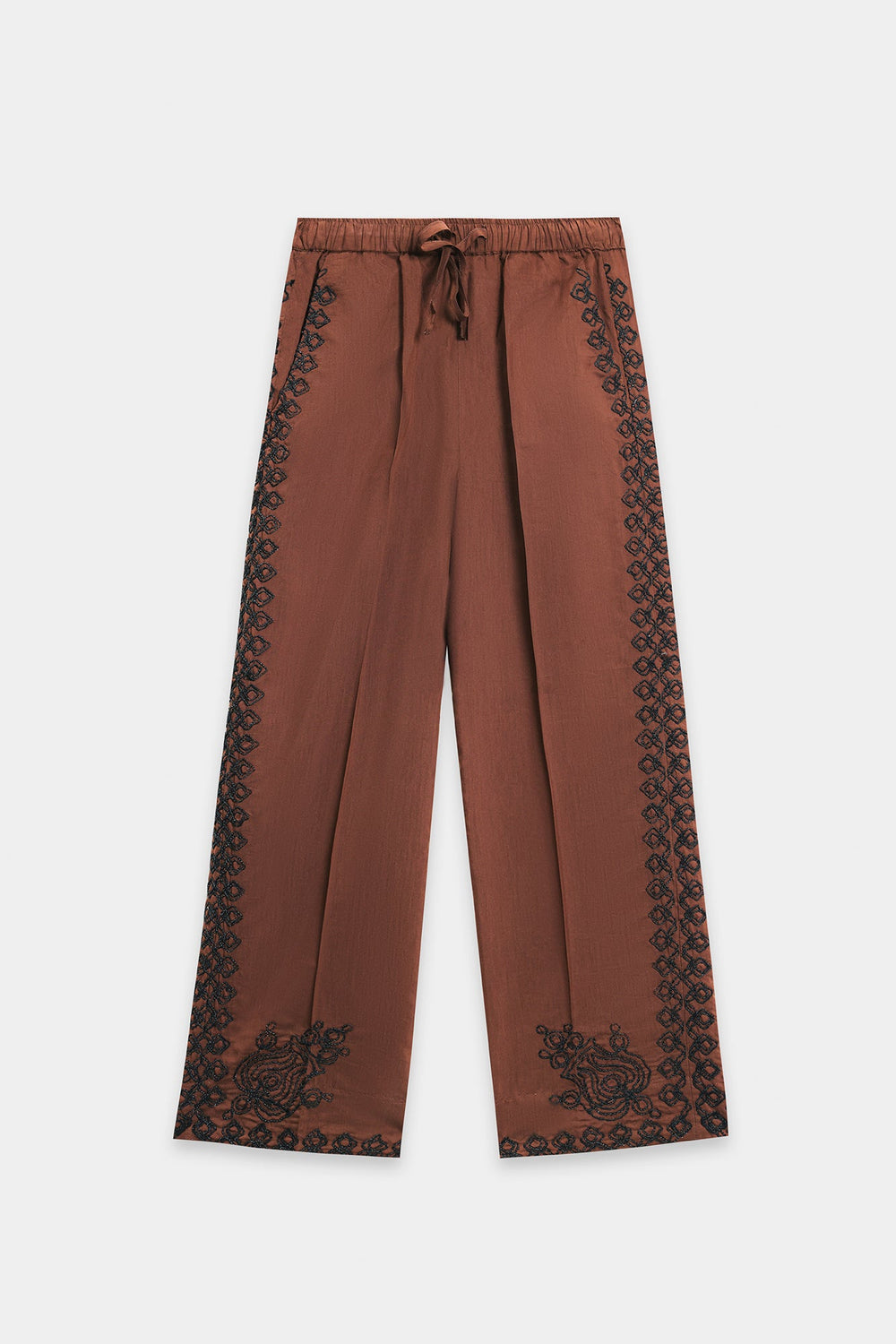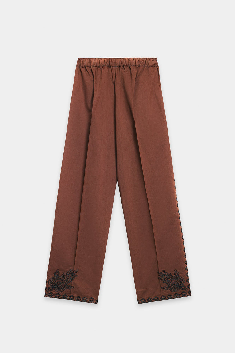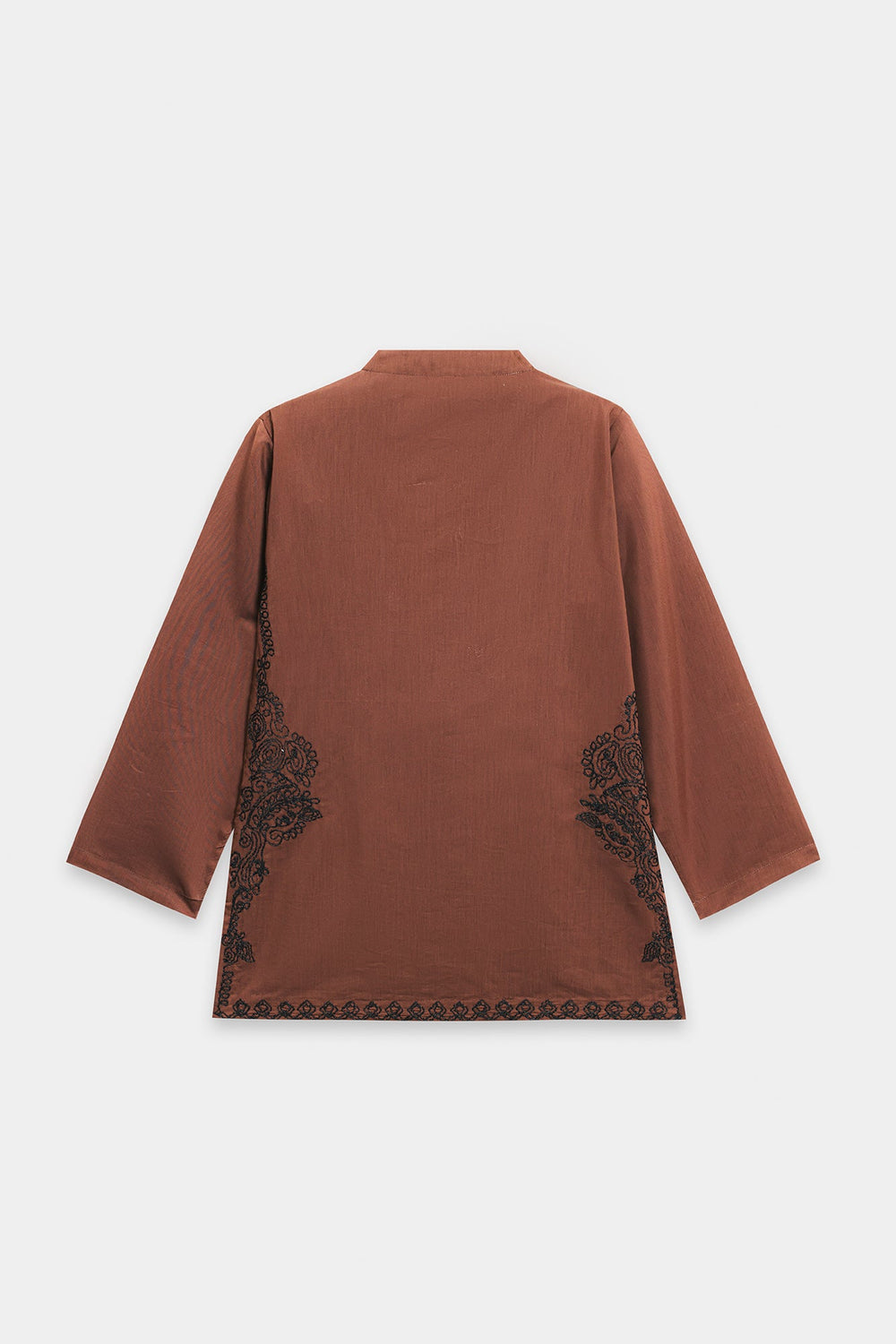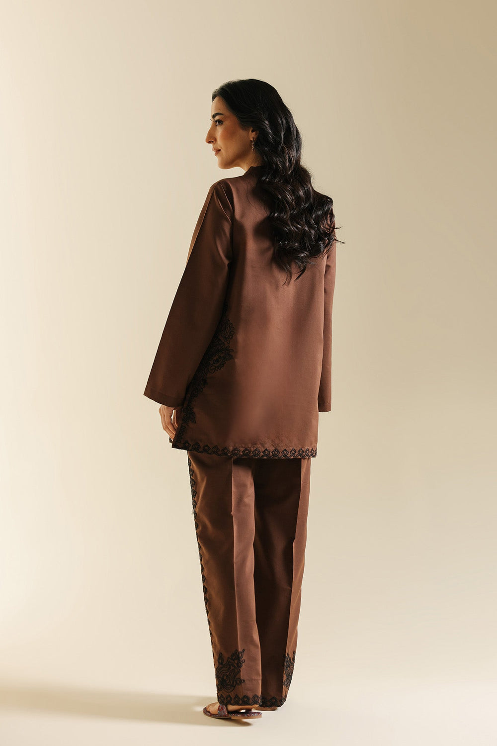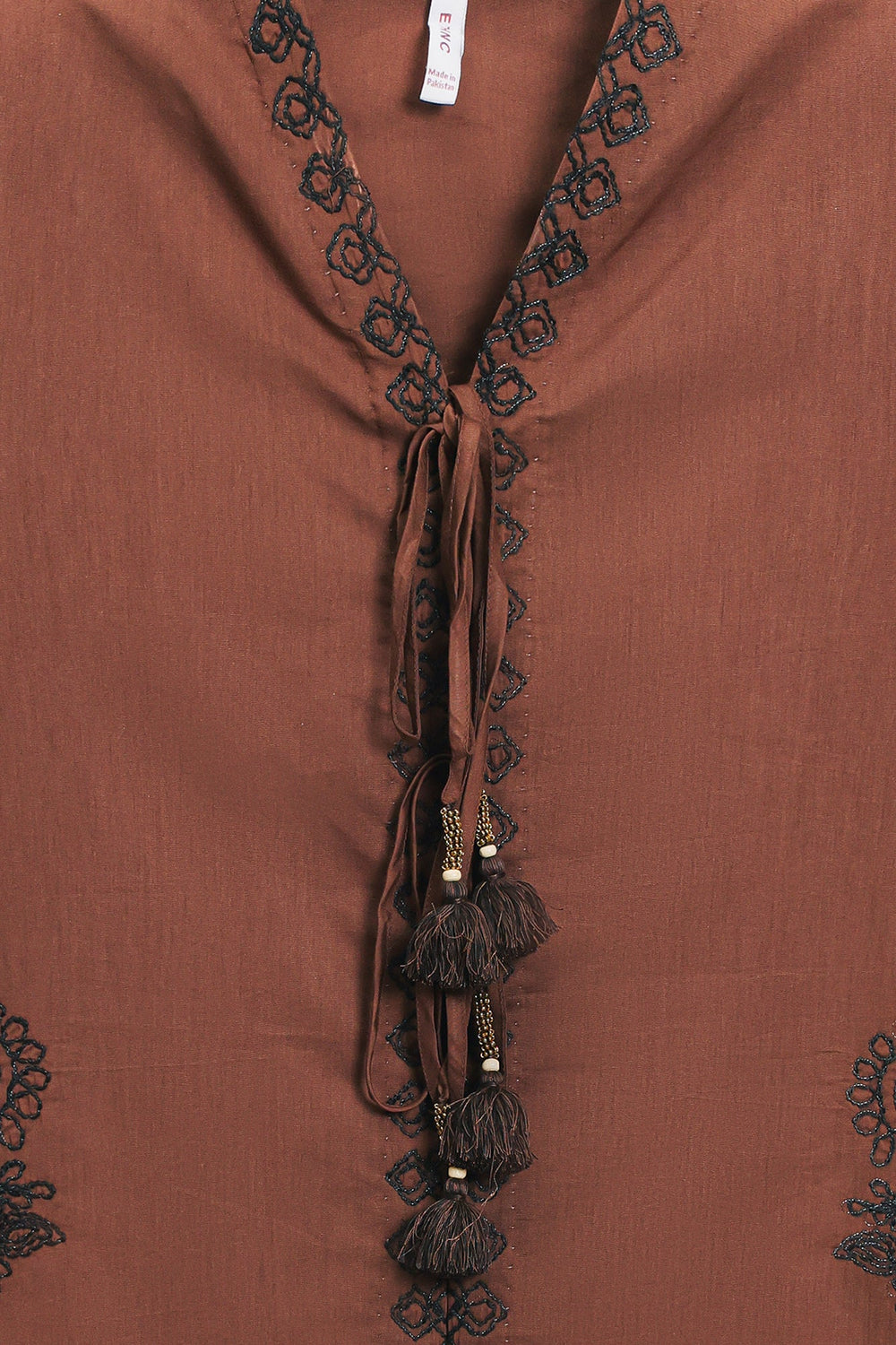 Elevate your wardrobe with this sophisticated suit, expertly crafted in deep brown with striking dark embroidery detailing. The long-sleeved tunic features a relaxed fit and distinctive tie-up neckline adorned with tassels and beads, complemented by intricate side embroidery. Paired with straight-cut or wide-leg trousers showcasing elaborate embroidery along the hem and cuffs, this ensemble delivers refined elegance. Perfect for semi-formal gatherings and smart casual occasions, the cohesive design and traditional aesthetic make this a versatile addition to your collection. Timeless sophistication meets contemporary comfort in every stitch.