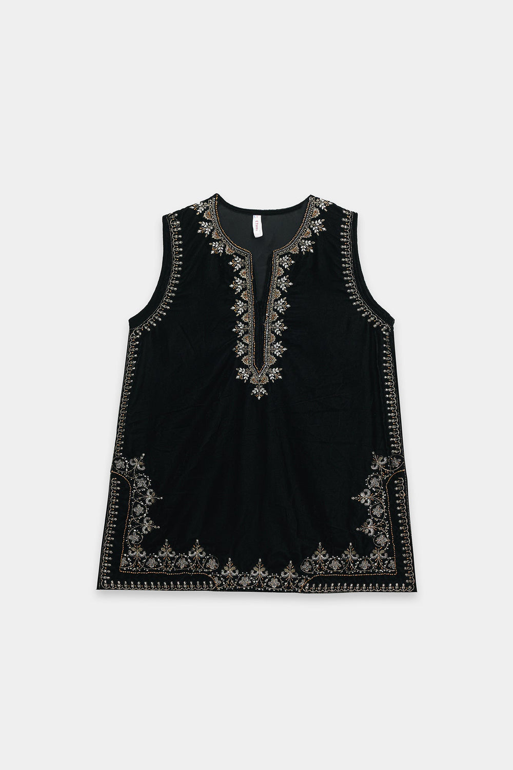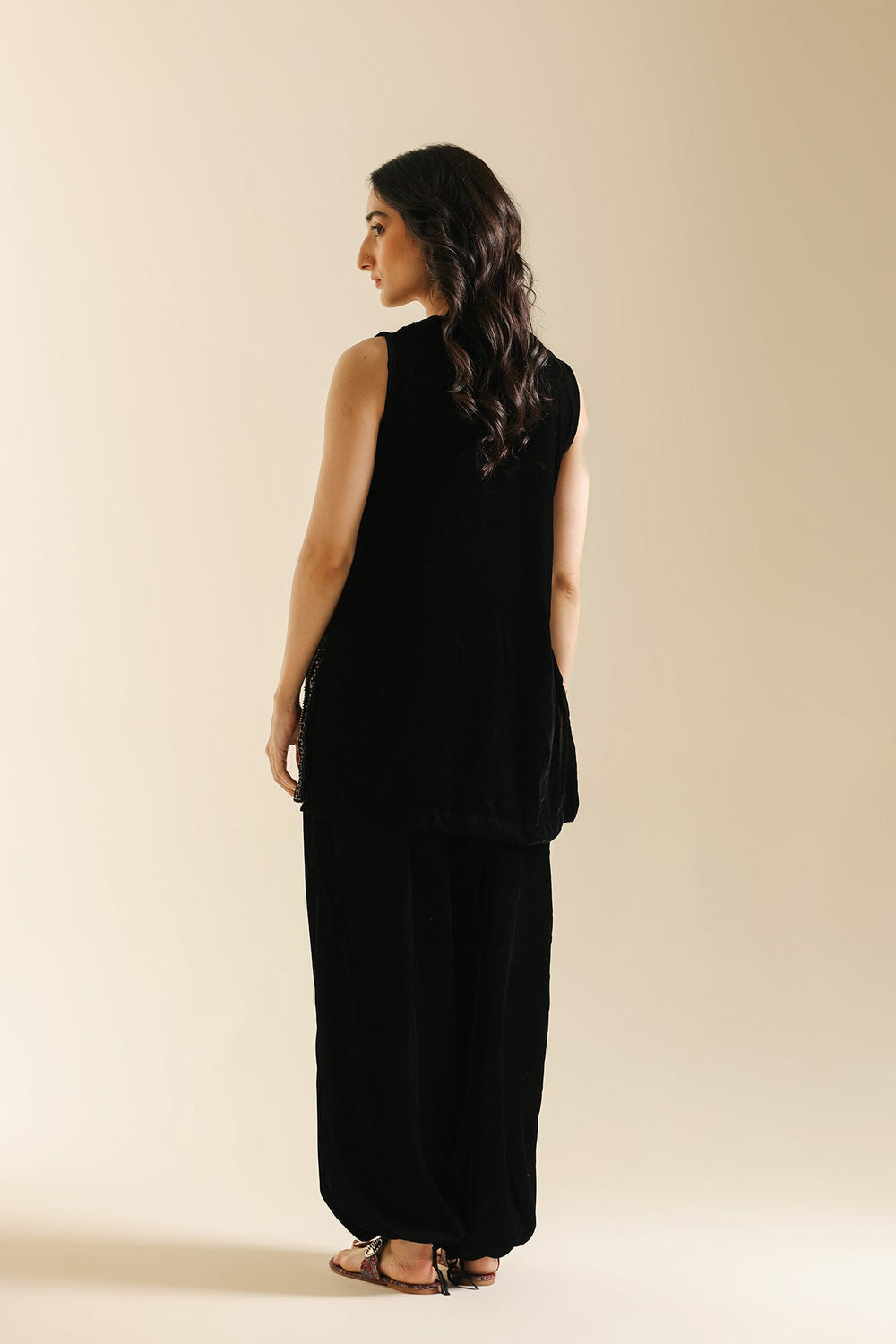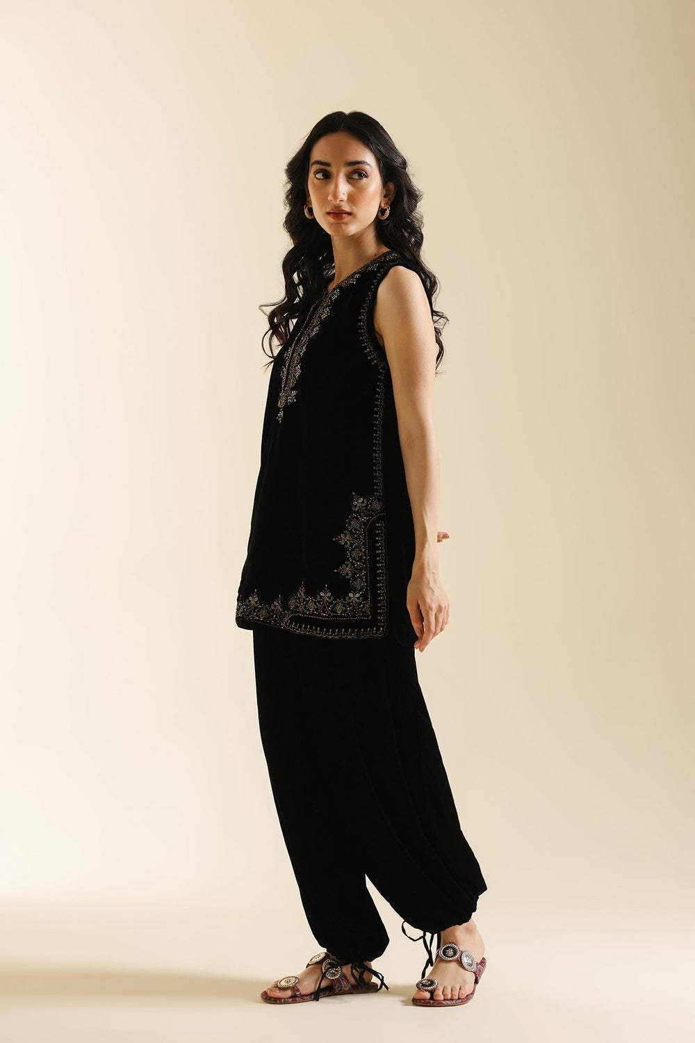 Experience refined elegance with this luxurious black velvet suit, The sleeveless tunic showcases a V-neckline and hemline adorned with intricate zari and dori embroidery in luminous gold, silver, and bronze tones, with additional metallic detailing cascading down the side seams. The sumptuous velvet fabric creates a rich foundation that beautifully complements the embroidery's radiance. Paired with voluminous black velvet shalwar trousers that gather elegantly at the ankles, this ensemble celebrates heritage silhouettes while maintaining modern appeal. This suit is an ideal choice for festive occasions.
