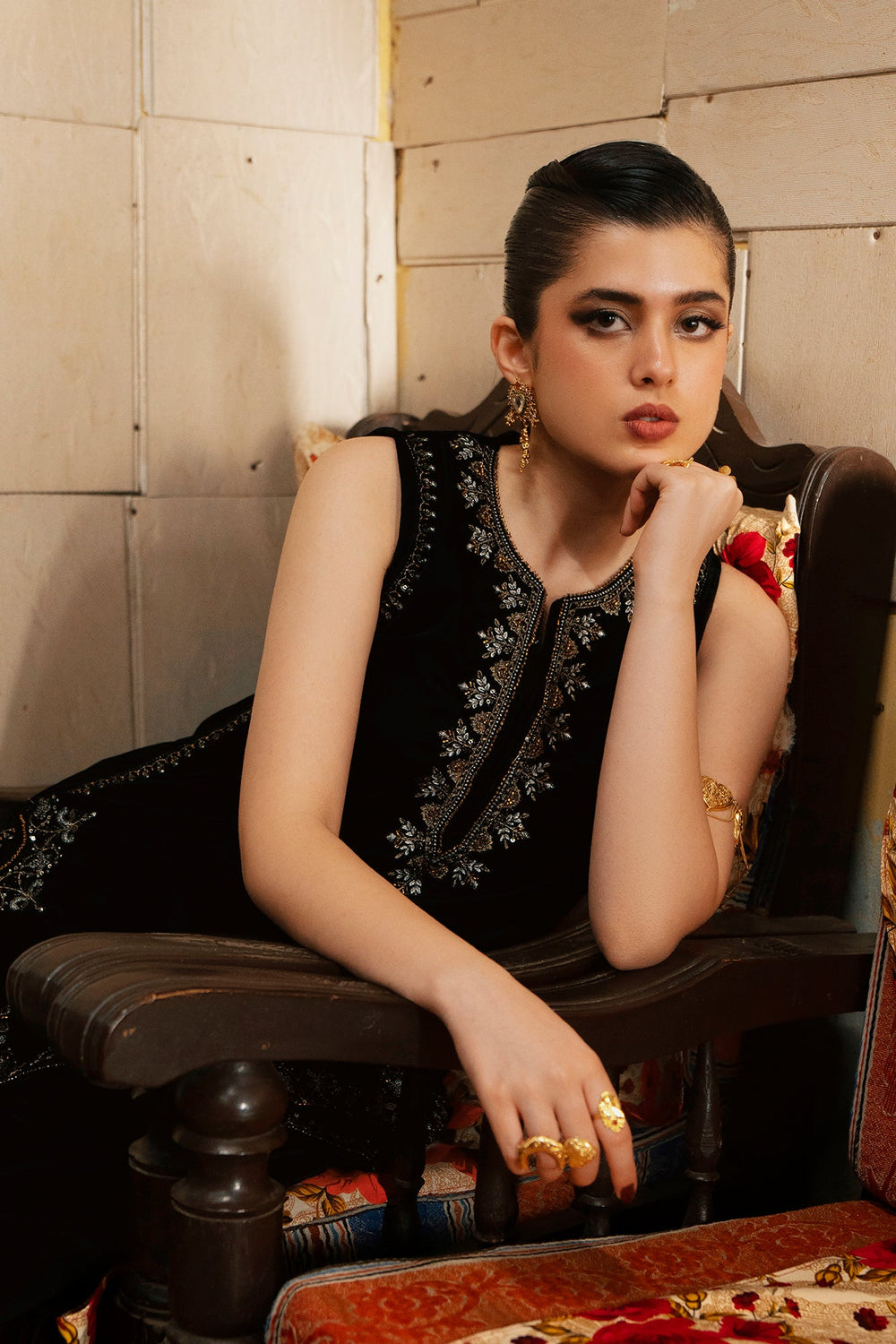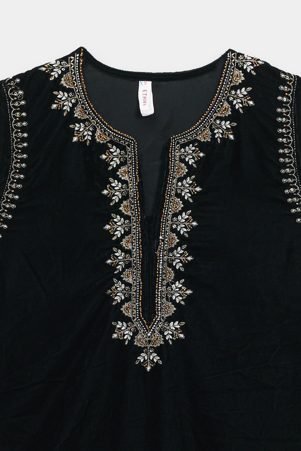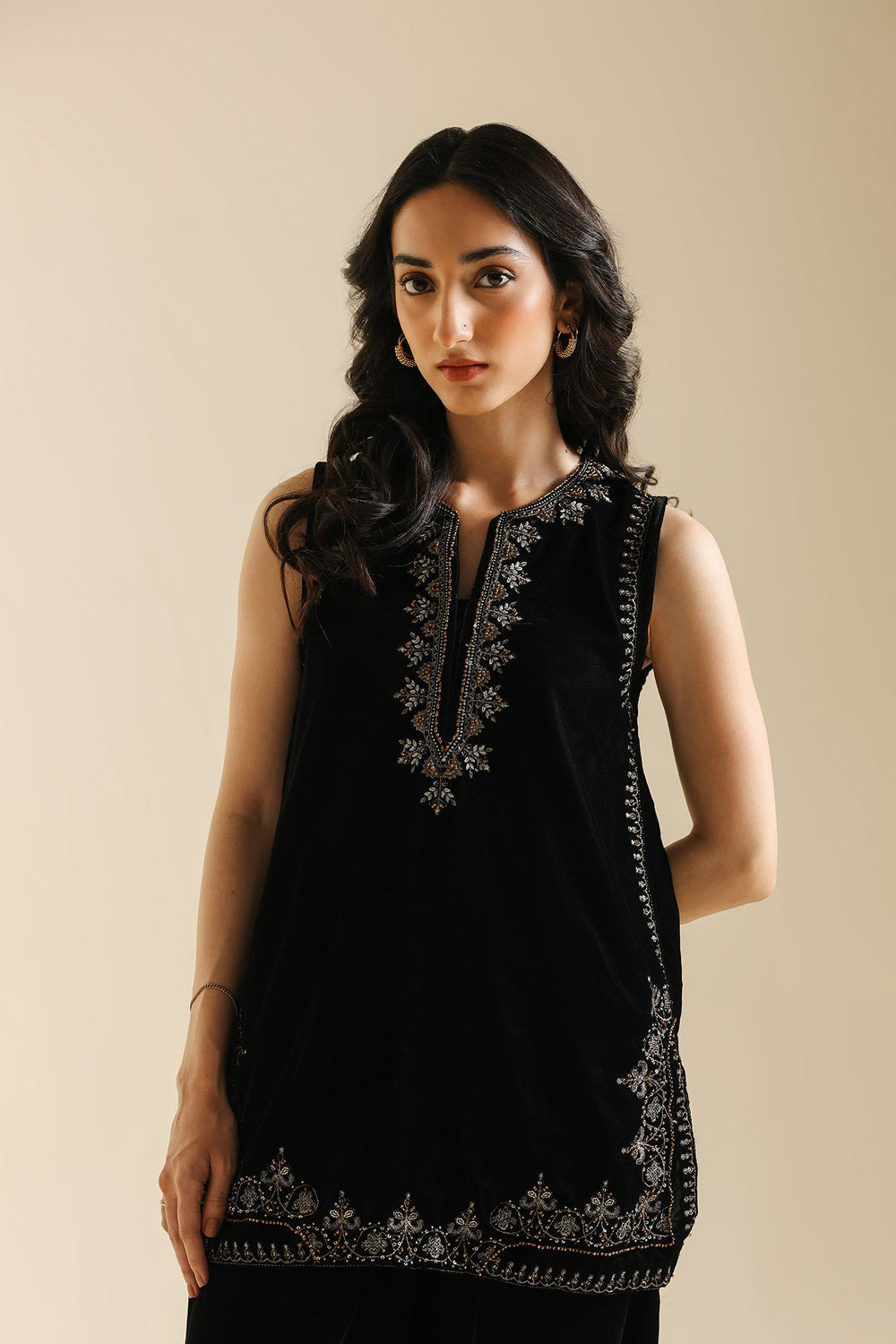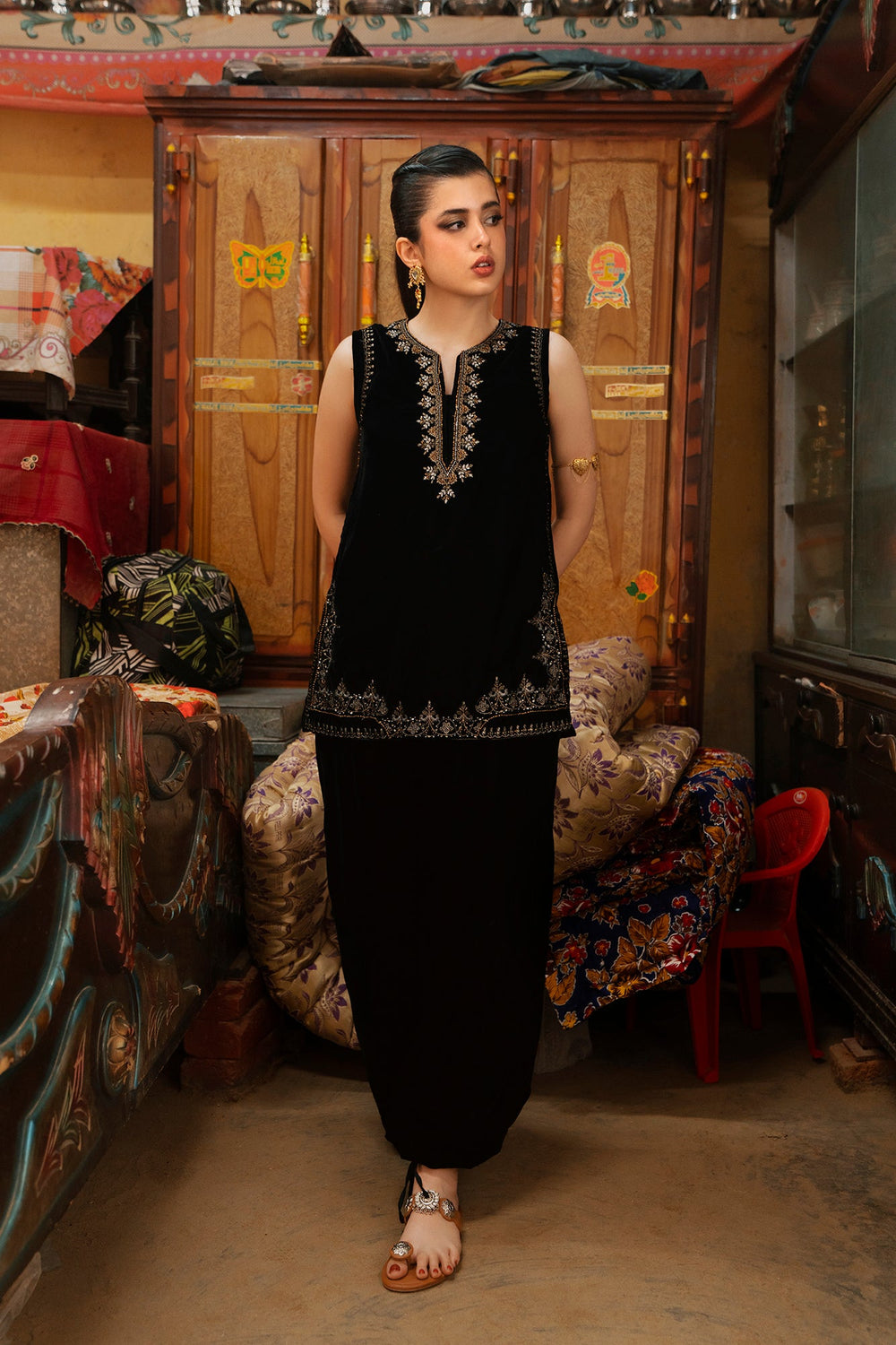 Experience refined elegance with this luxurious black velvet suit, The sleeveless tunic showcases a V-neckline and hemline adorned with intricate zari and dori embroidery in luminous gold, silver, and bronze tones, with additional metallic detailing cascading down the side seams. The sumptuous velvet fabric creates a rich foundation that beautifully complements the embroidery's radiance. Paired with voluminous black velvet shalwar trousers that gather elegantly at the ankles, this ensemble celebrates heritage silhouettes while maintaining modern appeal. This suit is an ideal choice for festive occasions.