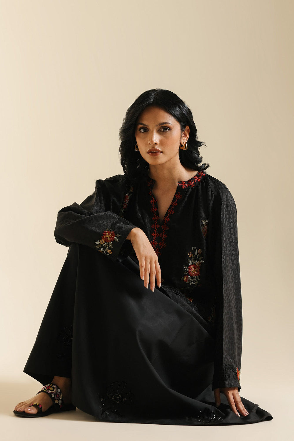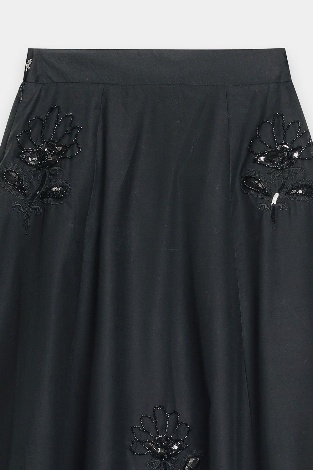 Elevate your silhouette with this sophisticated black A-line skirt, expertly designed with graceful gore panels that create fluid movement. The midi-to-maxi length offers elegant coverage while the gently flared cut ensures comfortable, flattering wear. Subtle yet striking tone-on-tone embellishment—featuring sequins, beads, and appliqué work—adorns the hem and cascades up the panels in organic floral motifs, adding refined texture and visual intrigue. This piece is versatile enough for both formal occasions and elevated casual settings.