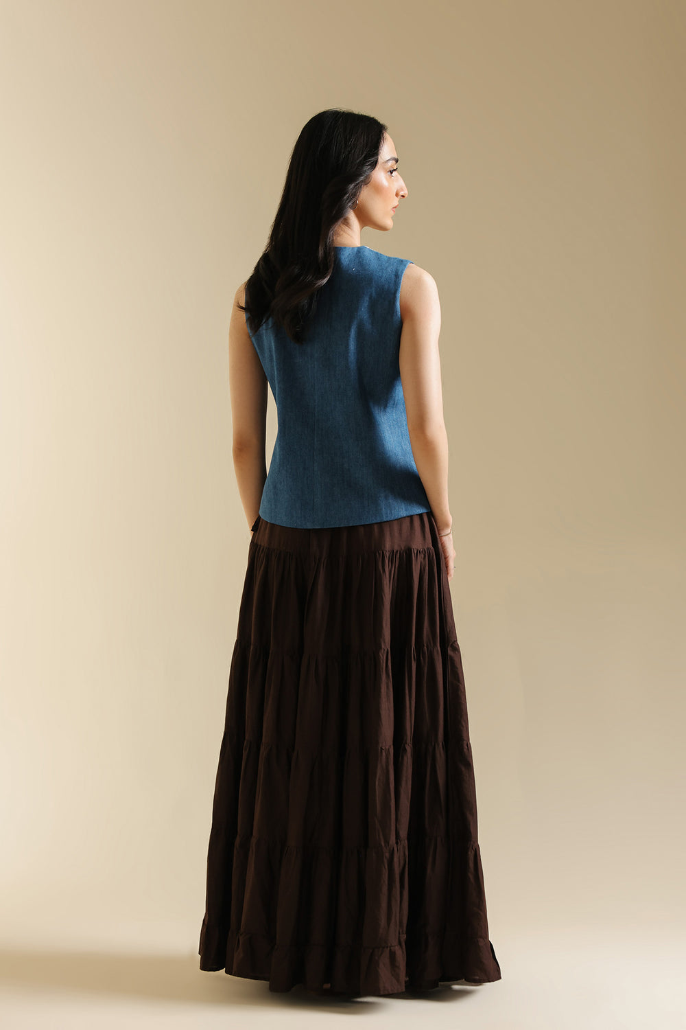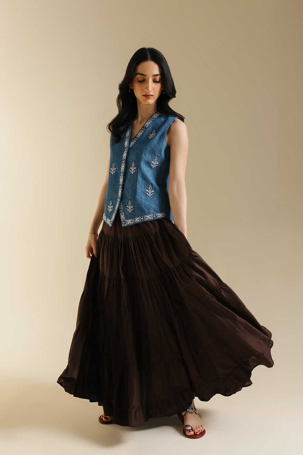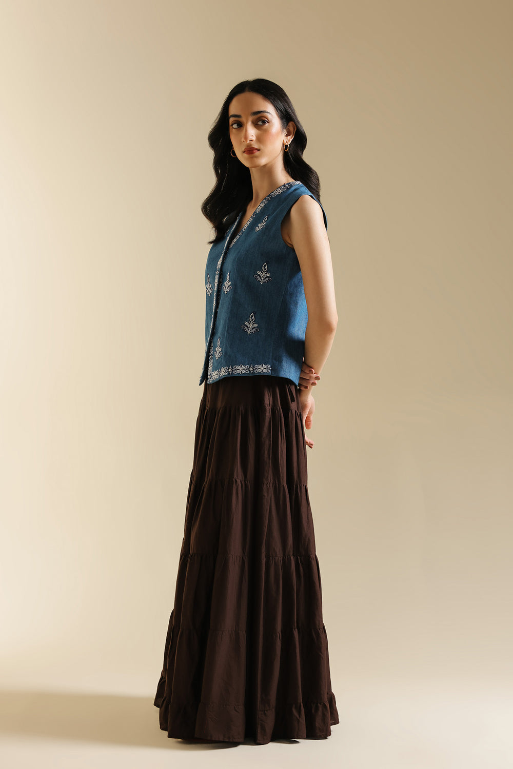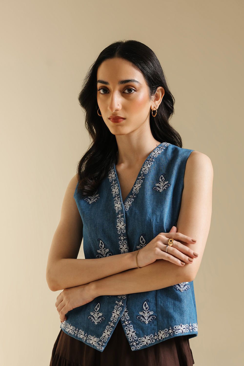 Embrace a unique and stylish look with this beautiful denim waistcoat. This sleeveless vest features intricate white embroidery in a classic geometric and floral pattern, creating a striking contrast against the blue fabric. Perfect for layering over a simple top or dress, this waistcoat is a versatile piece that adds a touch of bohemian flair to any outfit.