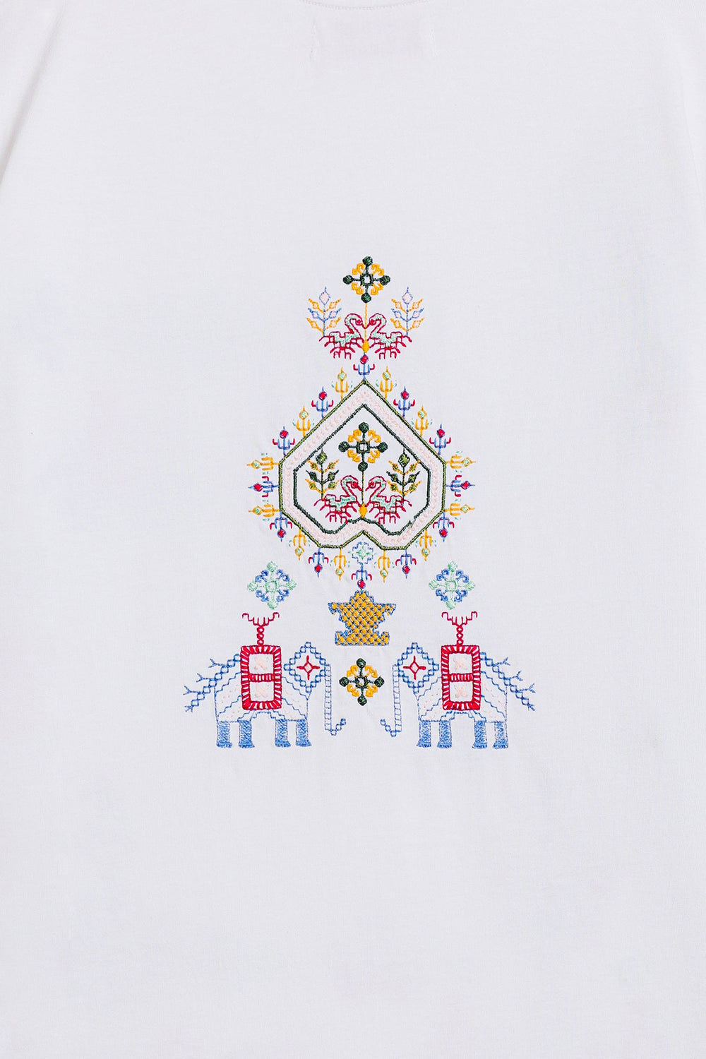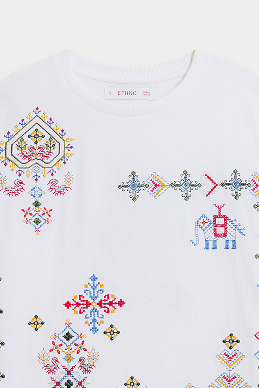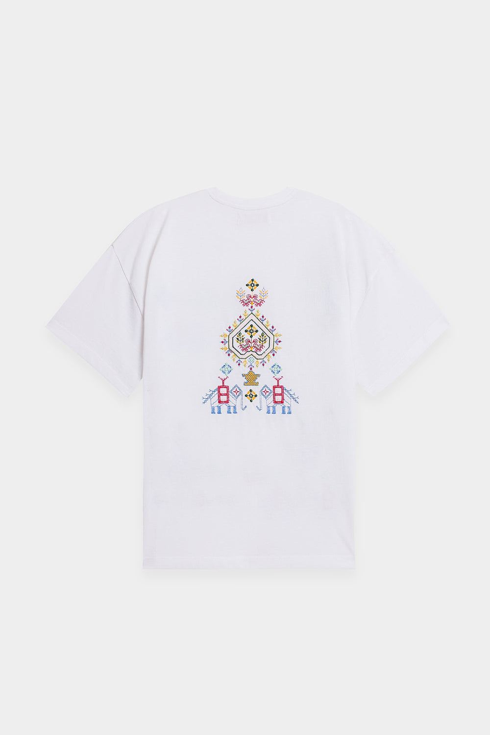 Make a statement with this effortlessly chic white t-shirt, where classic comfort meets intricate global-inspired artistry. The relaxed-fit tee features a captivating medley of multi-colored embroidery, showcasing diverse geometric and abstract patterns across the front. The vibrant hues and unique motifs create a contemporary yet culturally rich design, making it a true standout piece. Perfect for adding an artistic edge to your casual wear, or dressing up for a distinctive and inspired look.