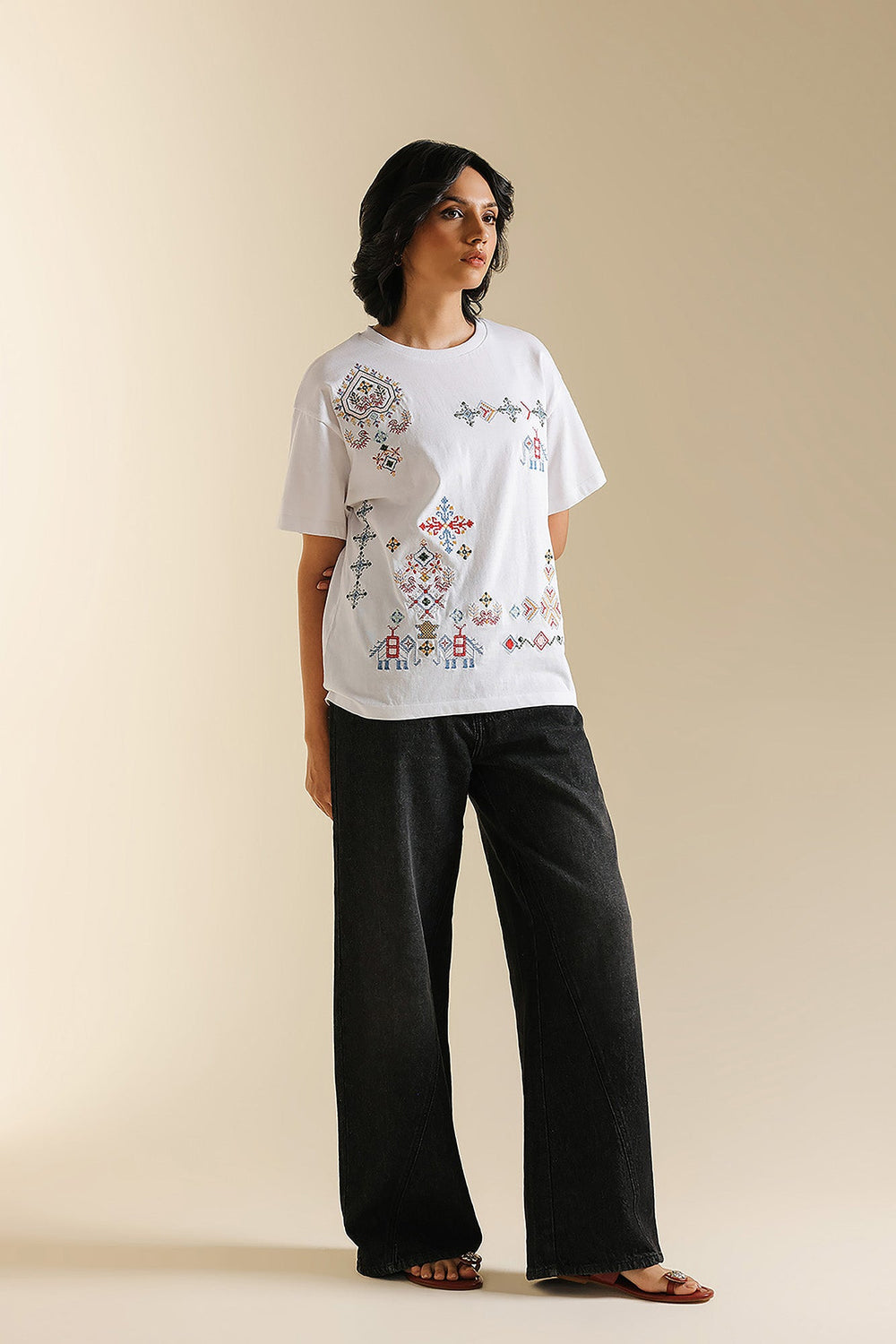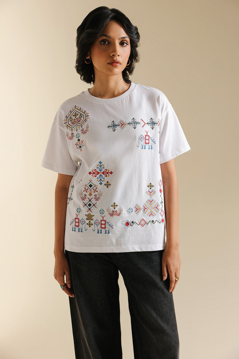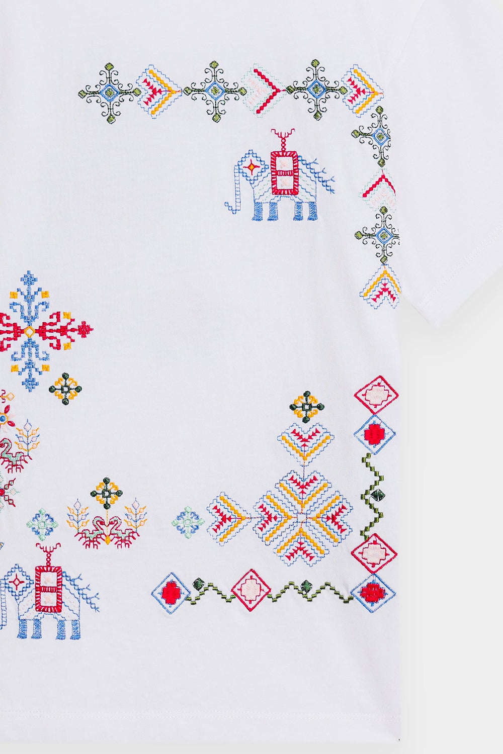 Make a statement with this effortlessly chic white t-shirt, where classic comfort meets intricate global-inspired artistry. The relaxed-fit tee features a captivating medley of multi-colored embroidery, showcasing diverse geometric and abstract patterns across the front. The vibrant hues and unique motifs create a contemporary yet culturally rich design, making it a true standout piece. Perfect for adding an artistic edge to your casual wear, or dressing up for a distinctive and inspired look.
