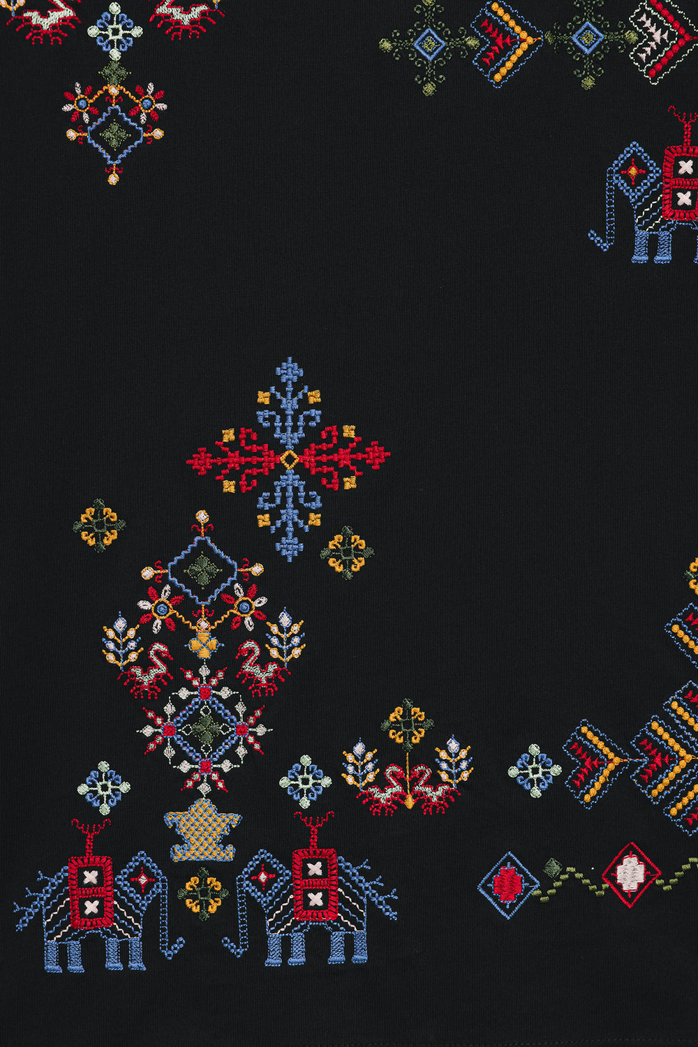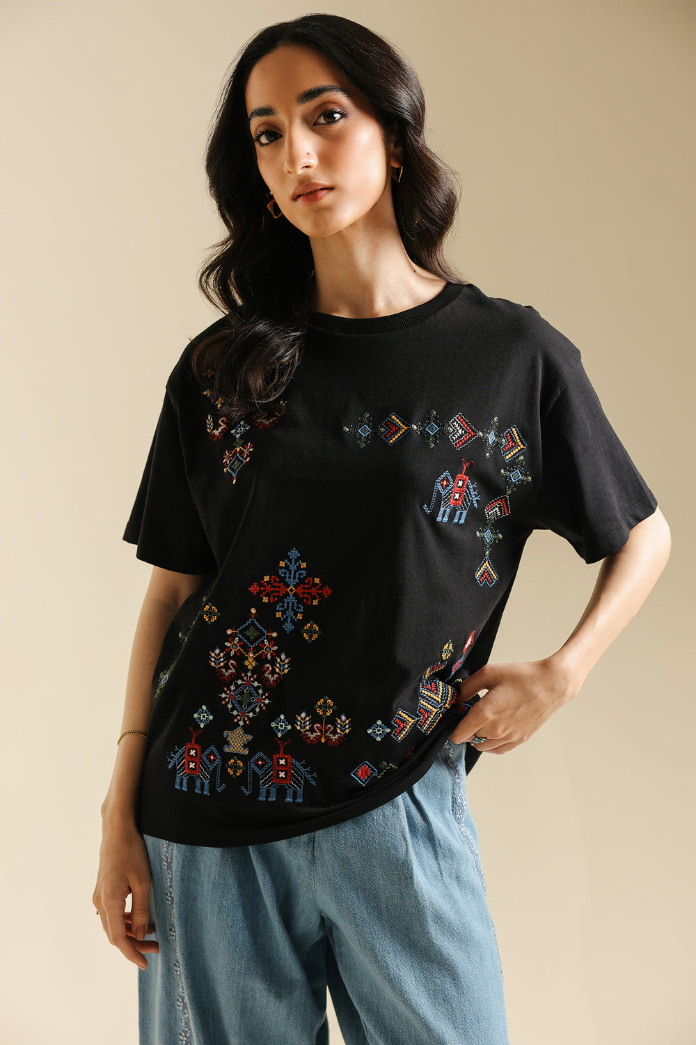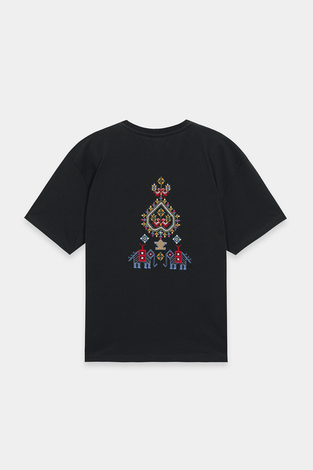 Make a statement with this effortlessly chic black t-shirt, where classic comfort meets intricate global-inspired artistry. The relaxed-fit tee features a captivating medley of multi-colored embroidery, showcasing diverse geometric and abstract patterns across the front. The vibrant hues and unique motifs create a contemporary yet culturally rich design, making it a true standout piece. Perfect for adding an artistic edge to your casual wear, or dressing up for a distinctive and inspired look.