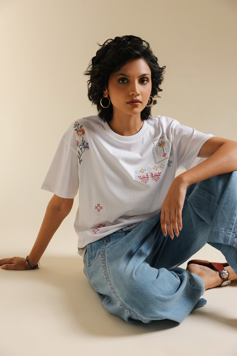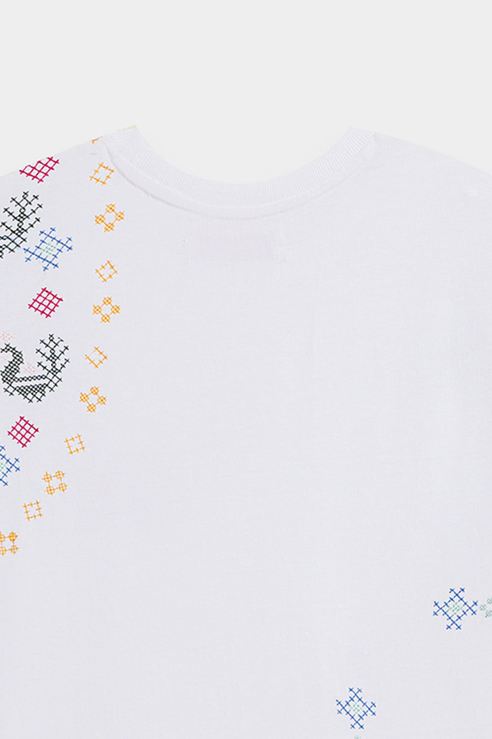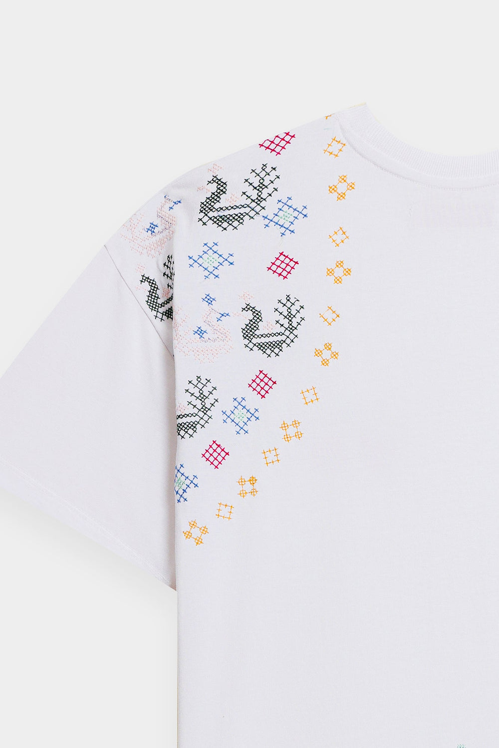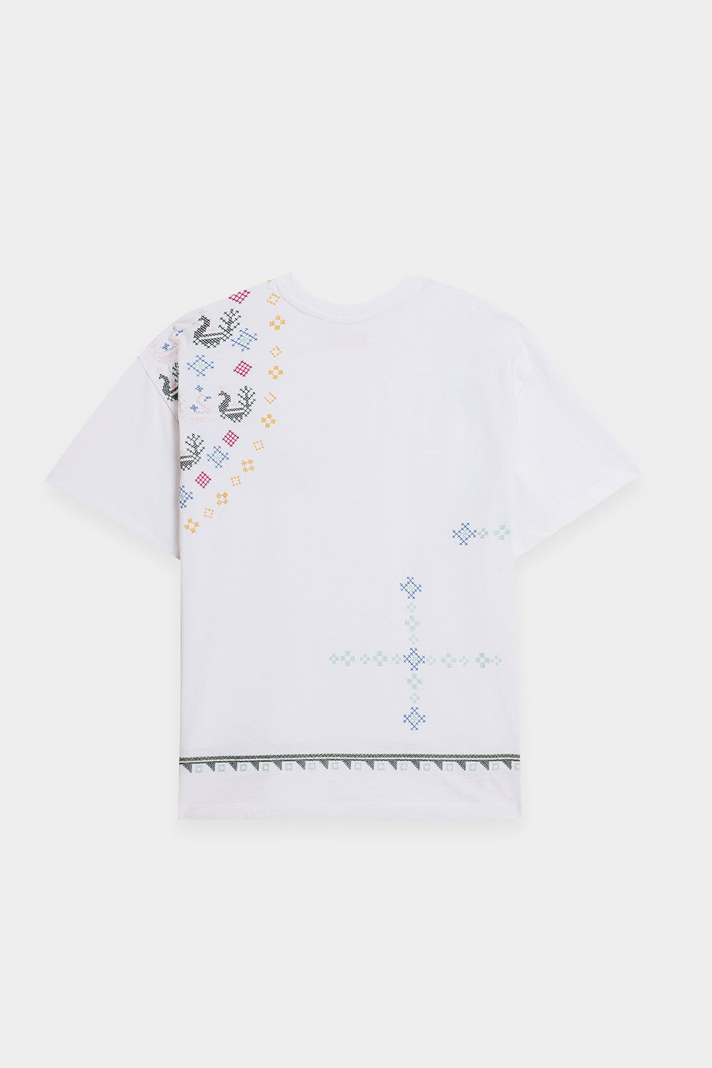Make a statement with this effortlessly chic white t-shirt, where classic comfort meets intricate global-inspired artistry. The relaxed-fit tee features a captivating medley of multi-colored embroidery, showcasing diverse geometric and abstract patterns across the front. The vibrant hues and unique motifs create a contemporary yet culturally rich design, making it a true standout piece. Perfect for adding an artistic edge to your casual wear, or dressing up for a distinctive and inspired look.