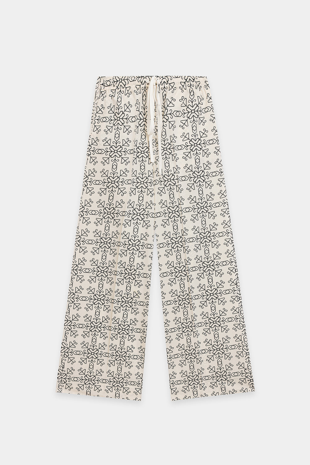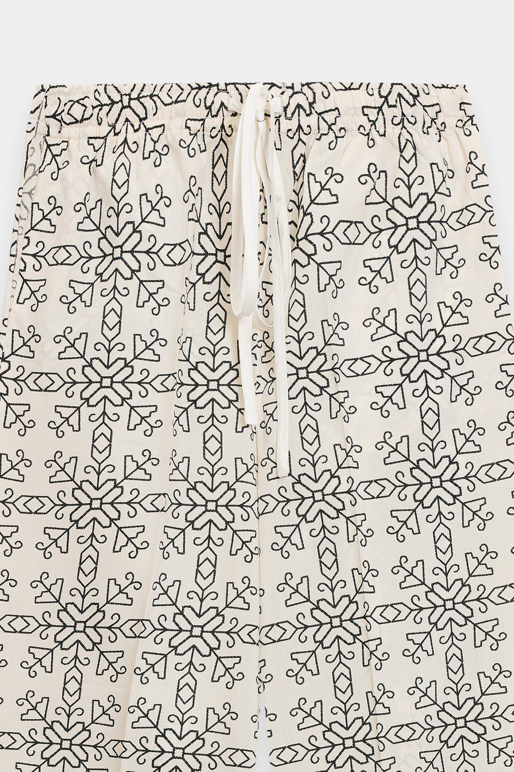 Make a statement in monochrome elegance with this sophisticated black and white embroidered suit. This striking two-piece ensemble features a beautifully coordinated top and trouser. The tunic is a pristine white, sleeveless design, adorned with intricate black thread embroidery forming geometric and floral motifs across the yoke and neckline. The suit is completed with matching wide-leg trouser that feature a bold, black and white print of large stylized floral patterns, offering exceptional drape and a contemporary flair for a bold yet timeless look.