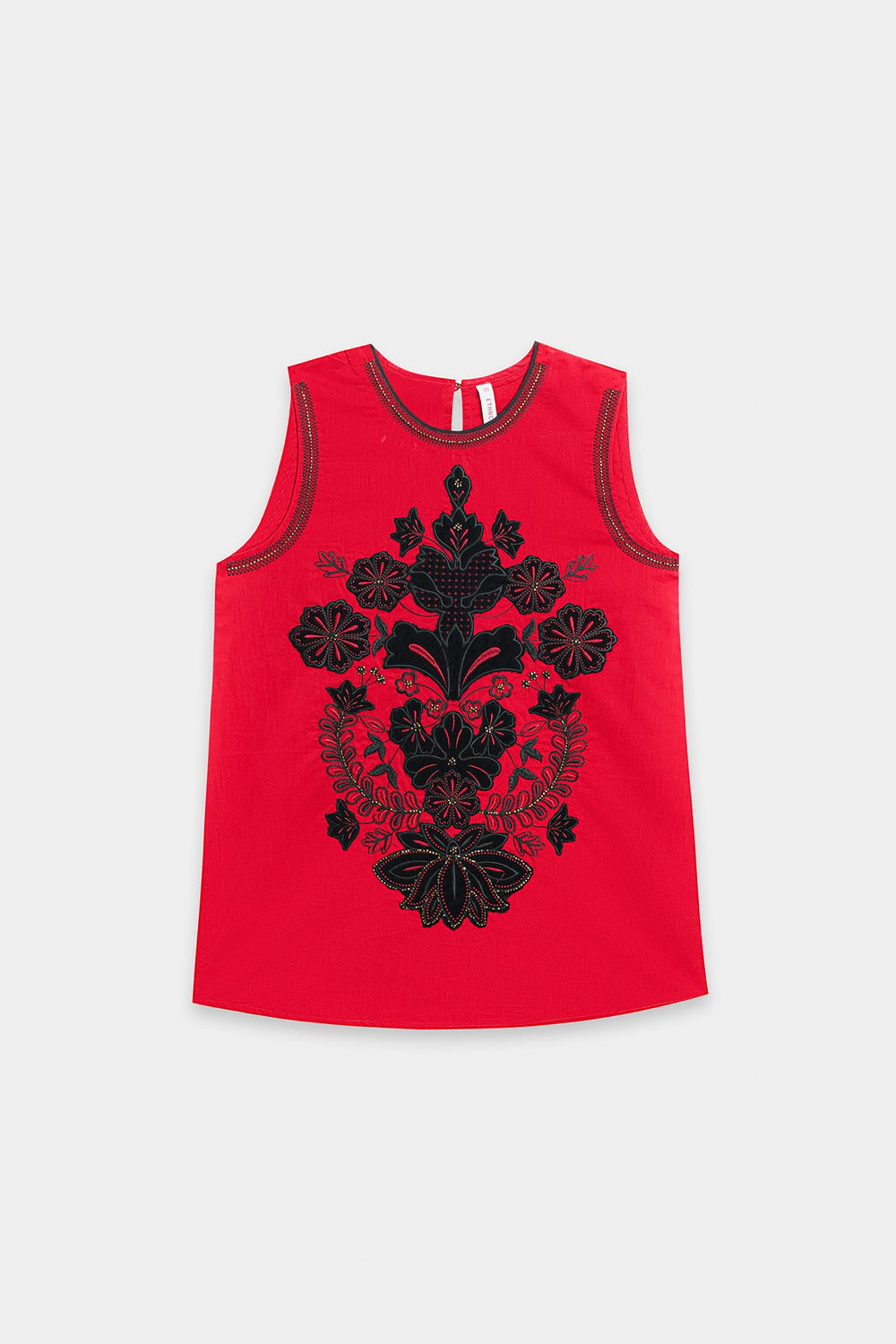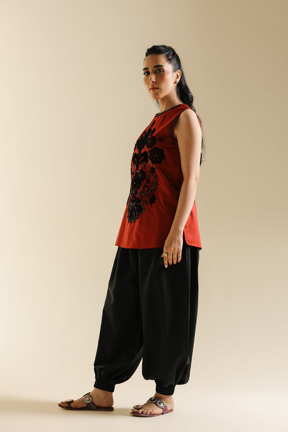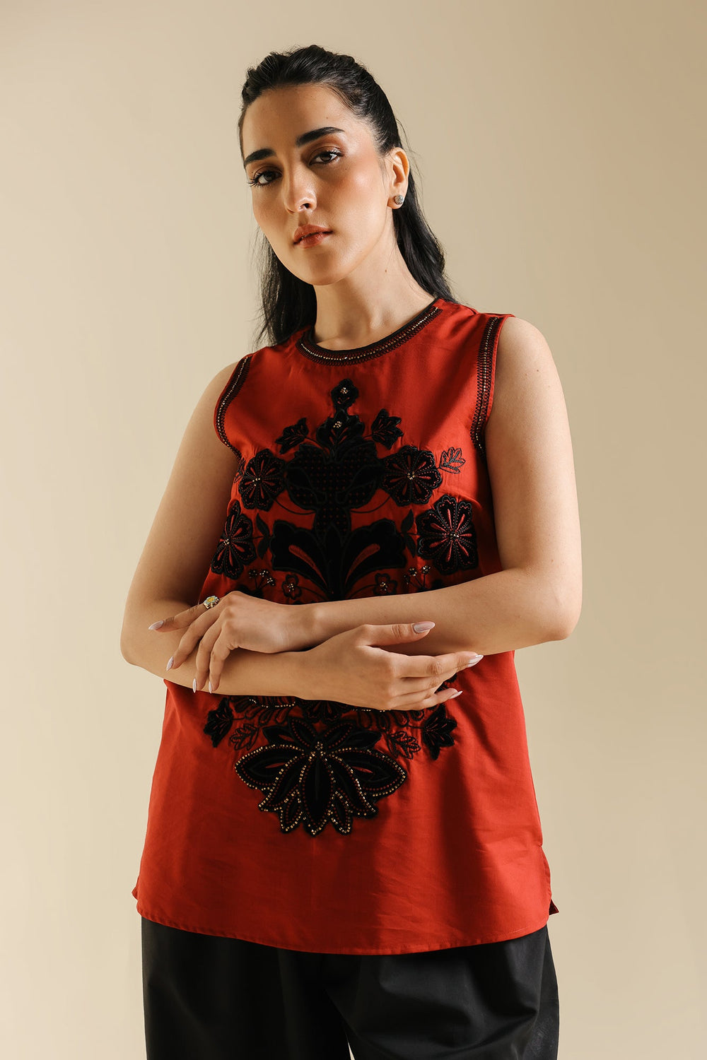 Exude confident style in this striking, sleeveless top. The shirt is crafted in a bold, vibrant coral-red fabric that acts as the perfect canvas for the dramatic black embellishment. The intricate black detailing forms a stylized floral and ornamental motif that commands attention on the front. Featuring a clean, rounded neckline, this top is effortlessly chic, especially when paired with the contrasting black relaxed-fit trouser, which complete this sophisticated, high-contrast look.