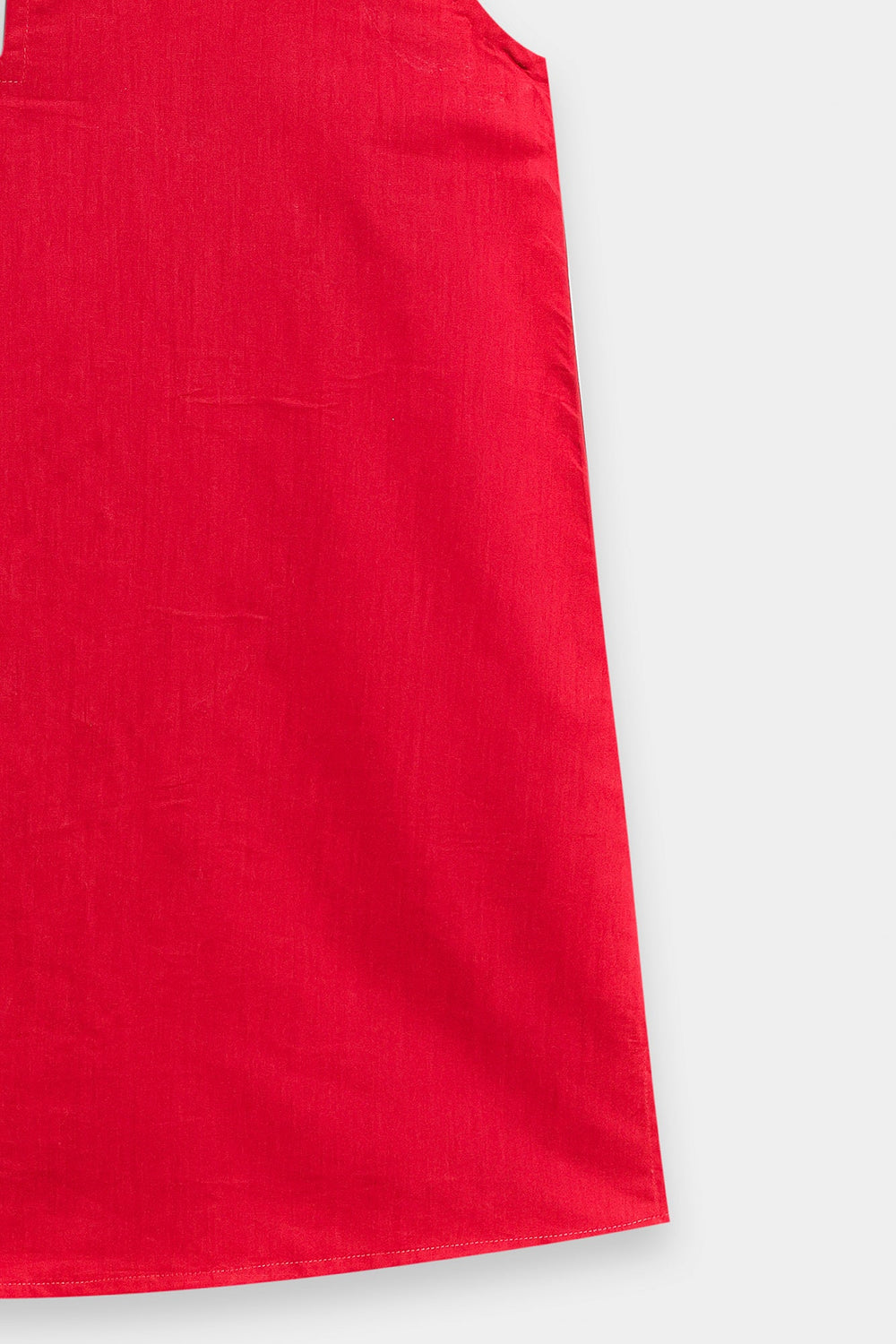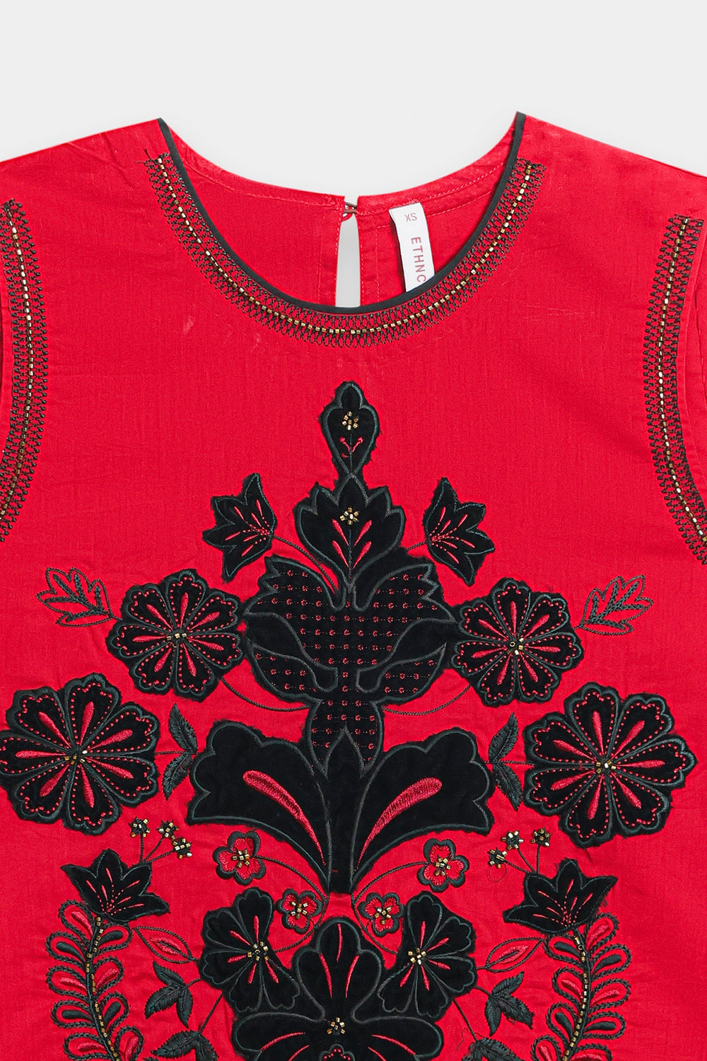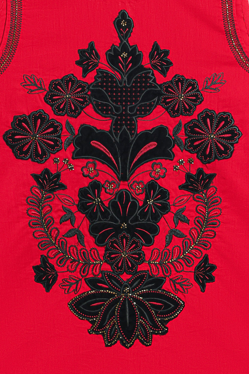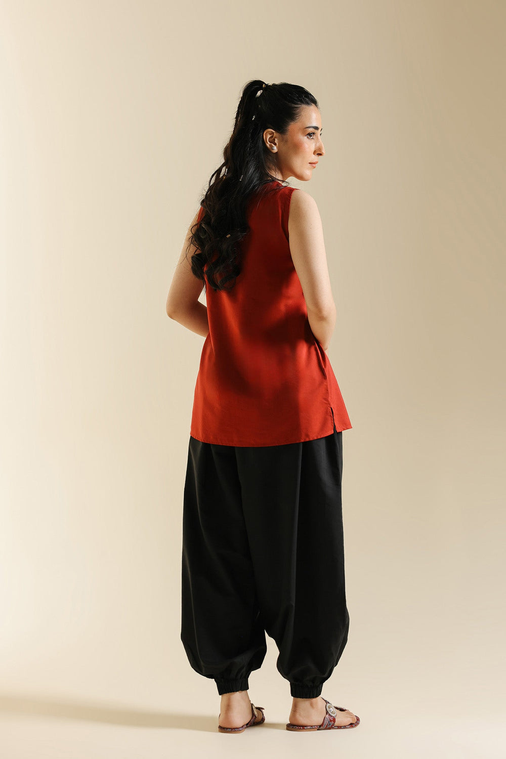 Exude confident style in this striking, sleeveless top. The shirt is crafted in a bold, vibrant coral-red fabric that acts as the perfect canvas for the dramatic black embellishment. The intricate black detailing forms a stylized floral and ornamental motif that commands attention on the front. Featuring a clean, rounded neckline, this top is effortlessly chic, especially when paired with the contrasting black relaxed-fit trouser, which complete this sophisticated, high-contrast look.