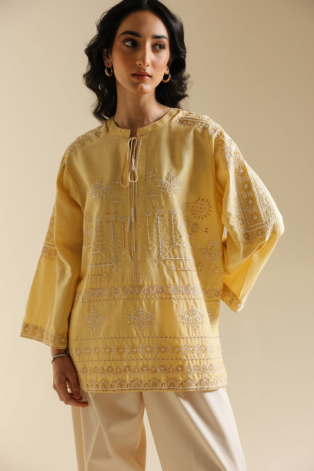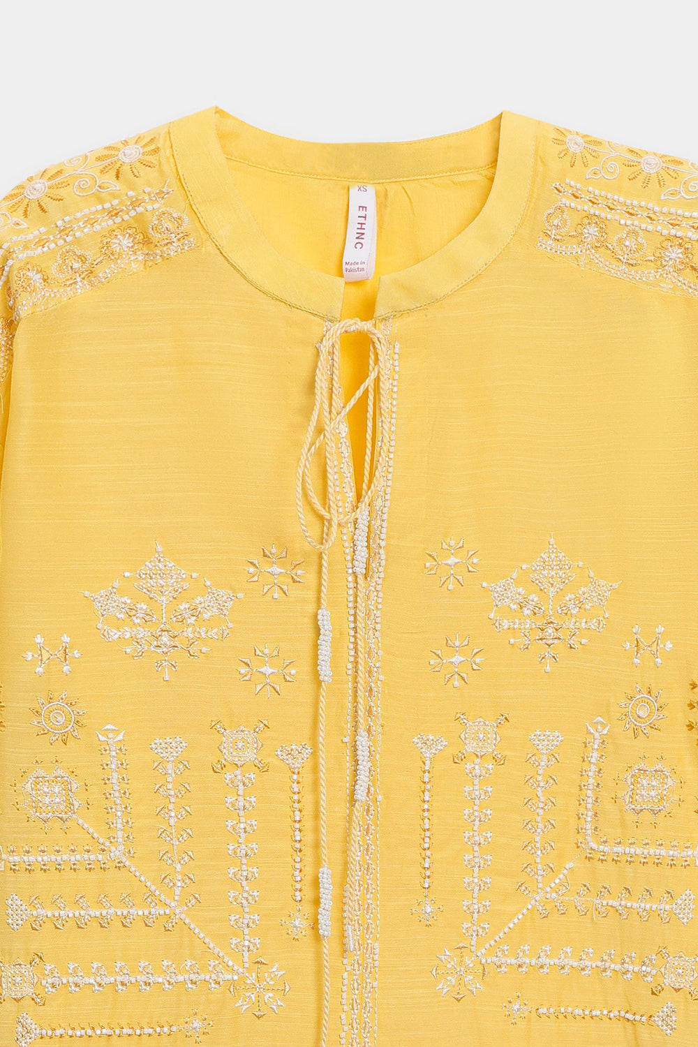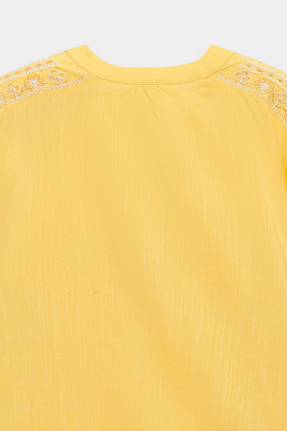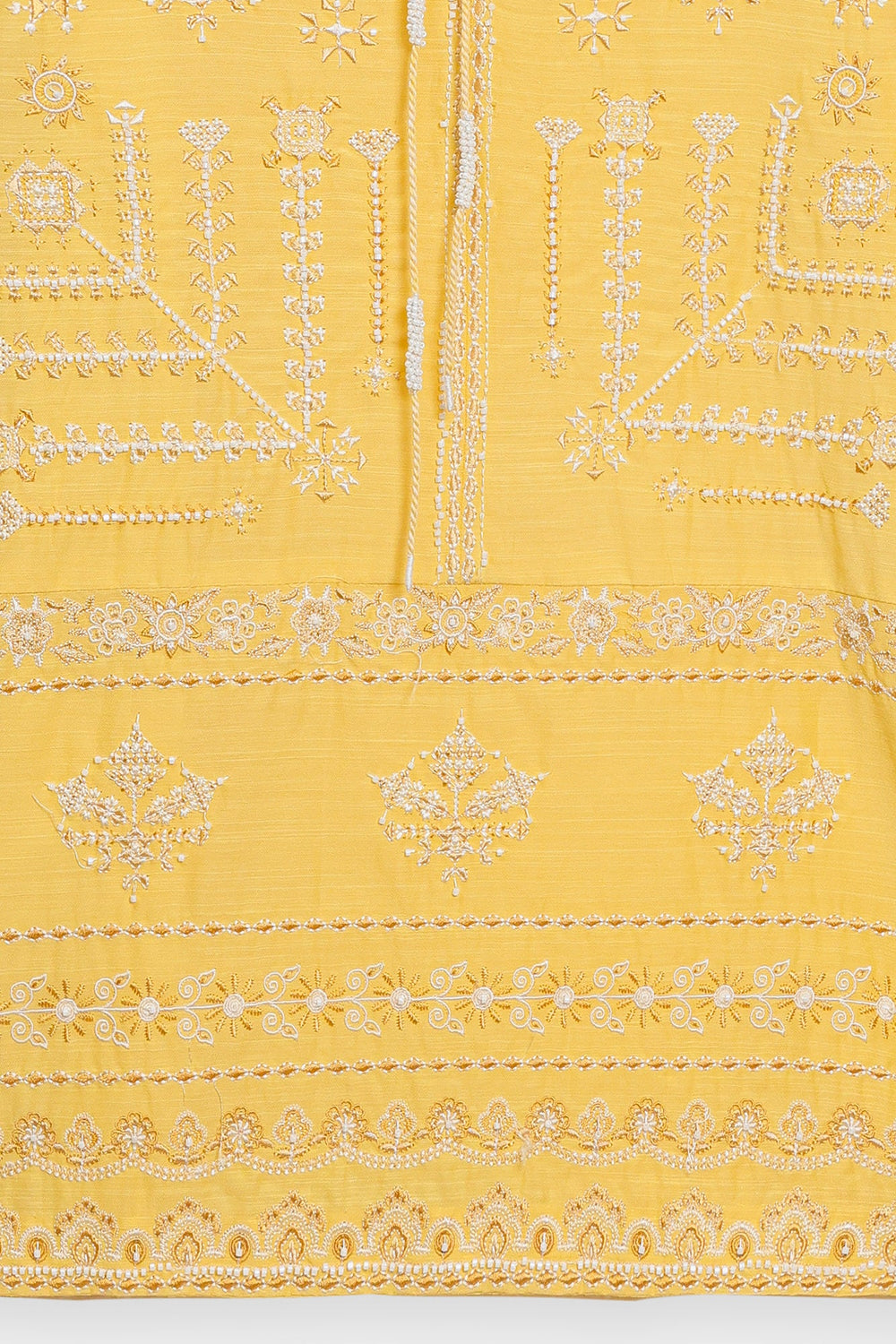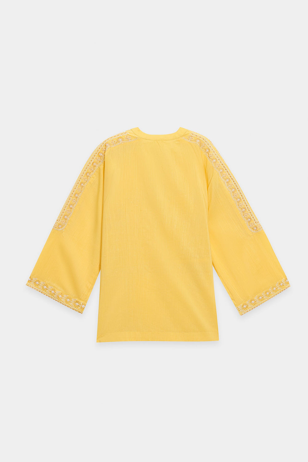 Bask in the cheerful glow of this sunny top. This short-length top is crafted from a vibrant solid yellow fabric and is richly detailed with beautiful white tone-on-tone embroidery across the yoke and body. The delicate white thread work forms elaborate vertical and horizontal patterns, creating a beautiful contrast and textural interest against the cheerful yellow base. It features a classic ban neckline with a subtle split and is accented with an ornamental tie. Paired with clean, white wide-leg trouser, this top embodies a perfect blend of lively color and refined traditional embroidery.