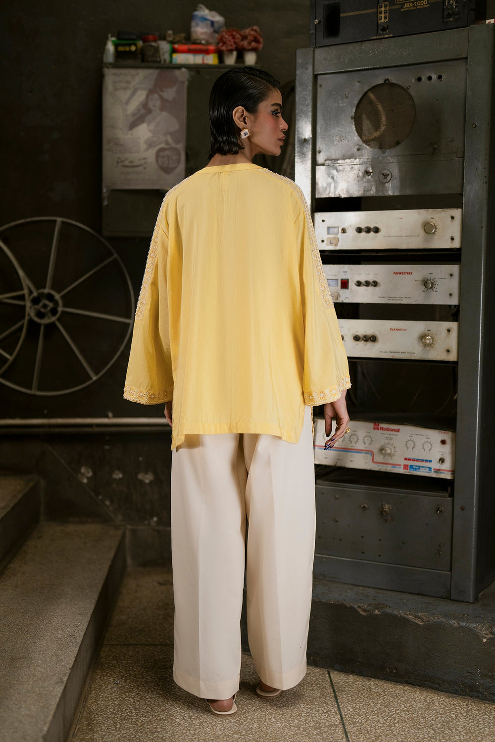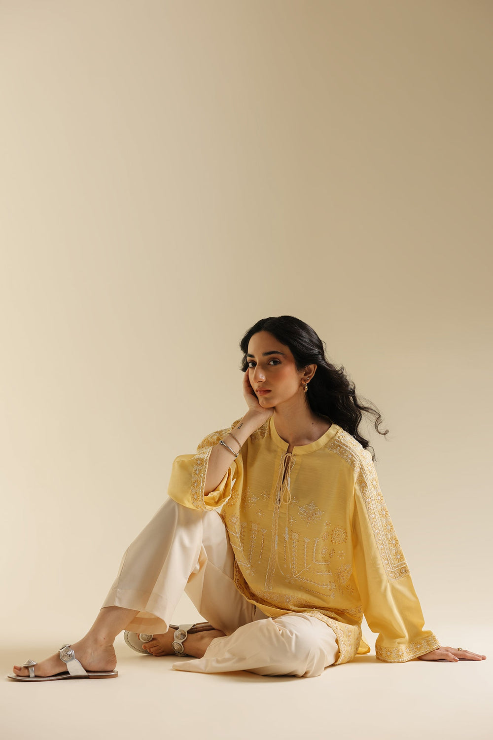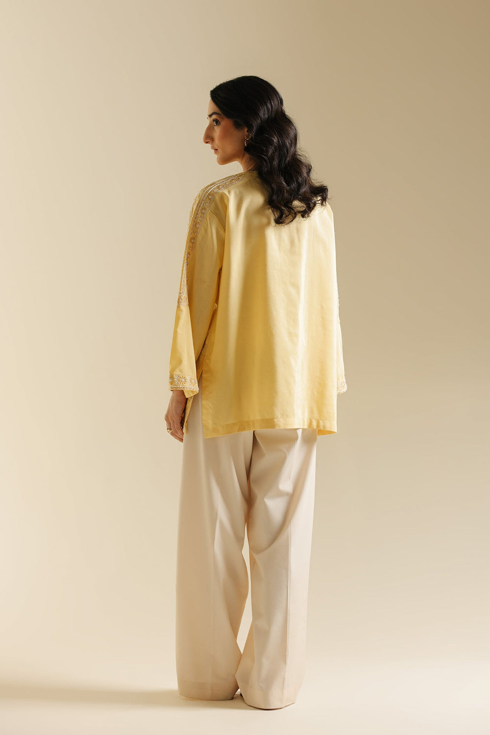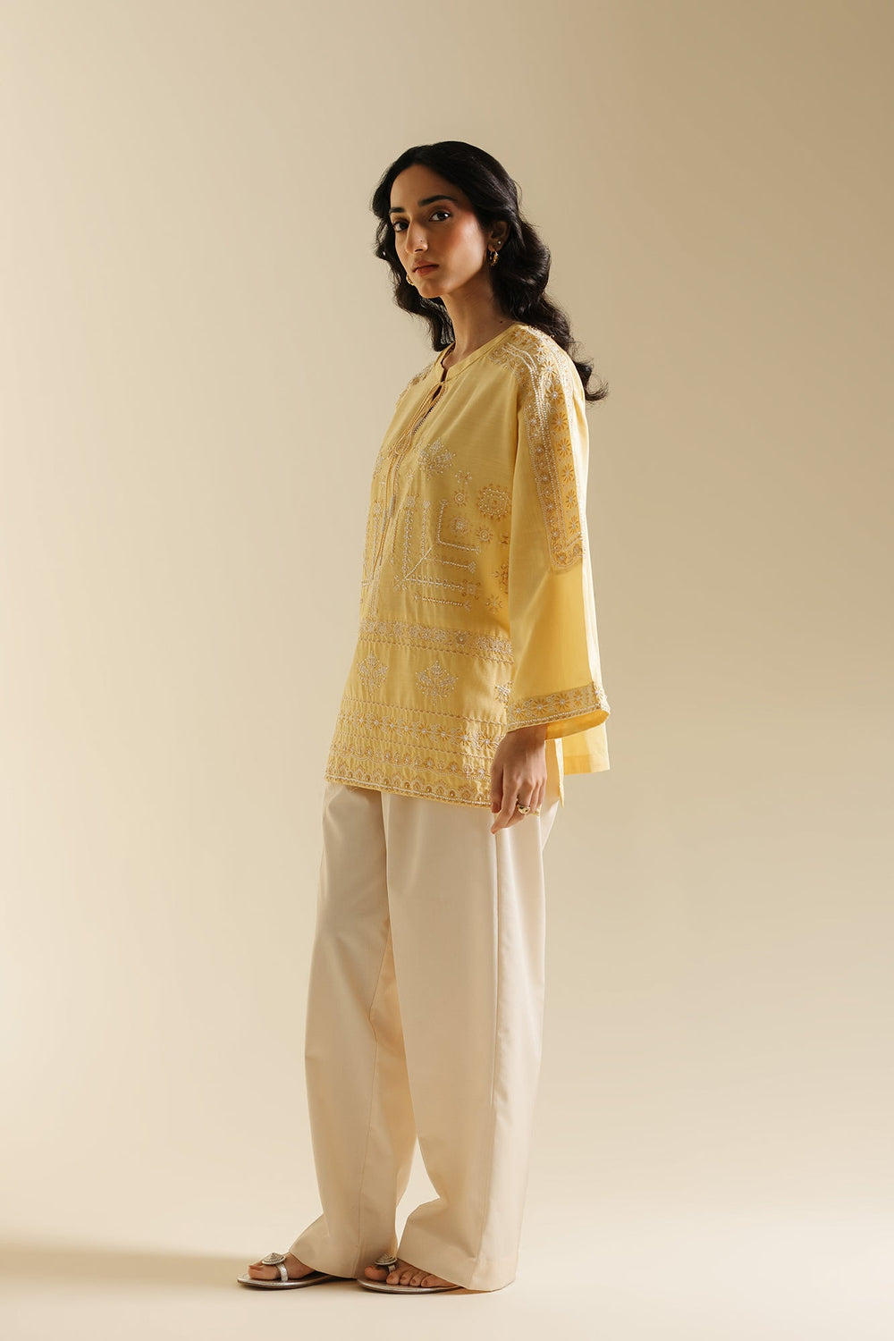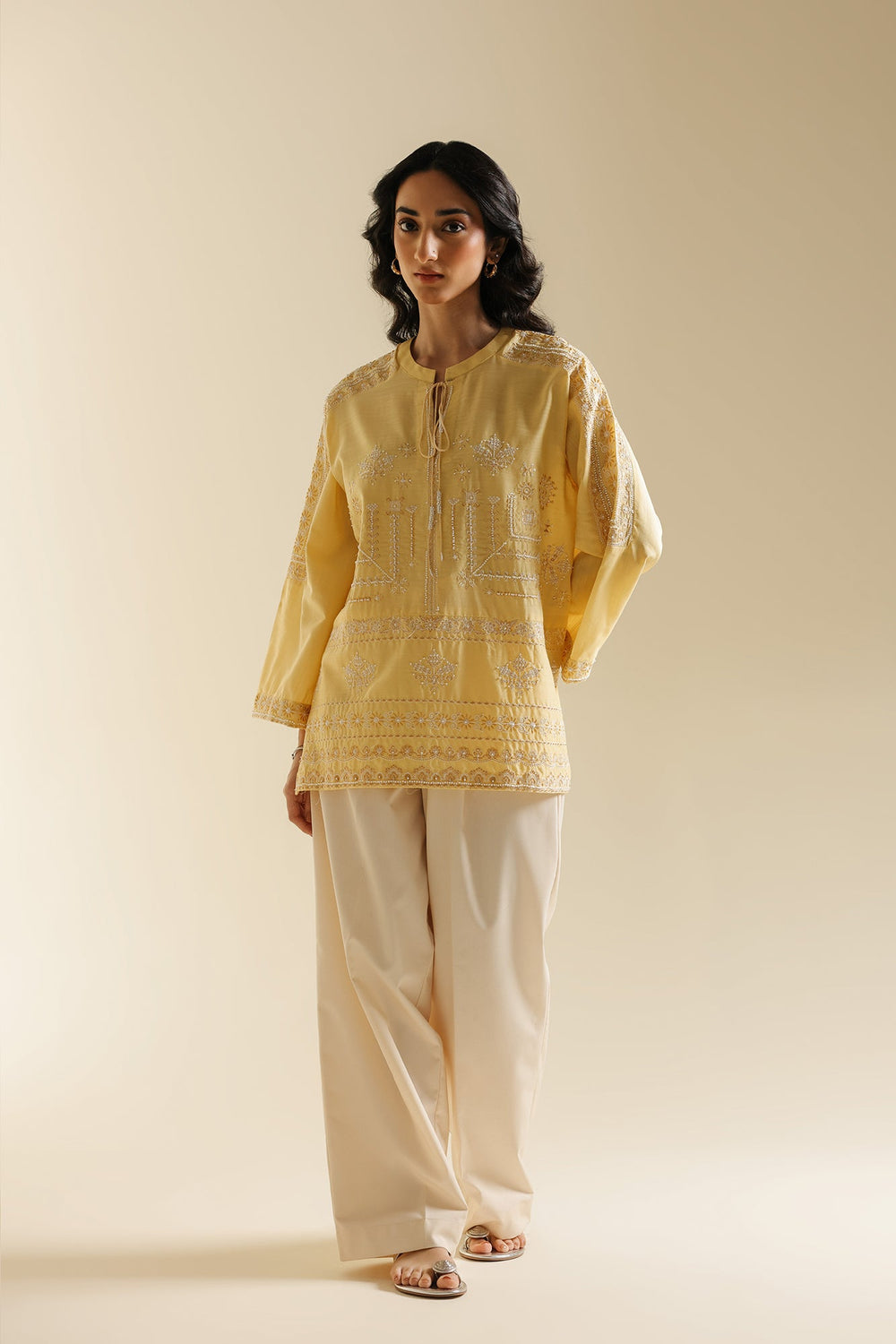 Bask in the cheerful glow of this sunny top. This short-length top is crafted from a vibrant solid yellow fabric and is richly detailed with beautiful white tone-on-tone embroidery across the yoke and body. The delicate white thread work forms elaborate vertical and horizontal patterns, creating a beautiful contrast and textural interest against the cheerful yellow base. It features a classic ban neckline with a subtle split and is accented with an ornamental tie. Paired with clean, white wide-leg trouser, this top embodies a perfect blend of lively color and refined traditional embroidery.