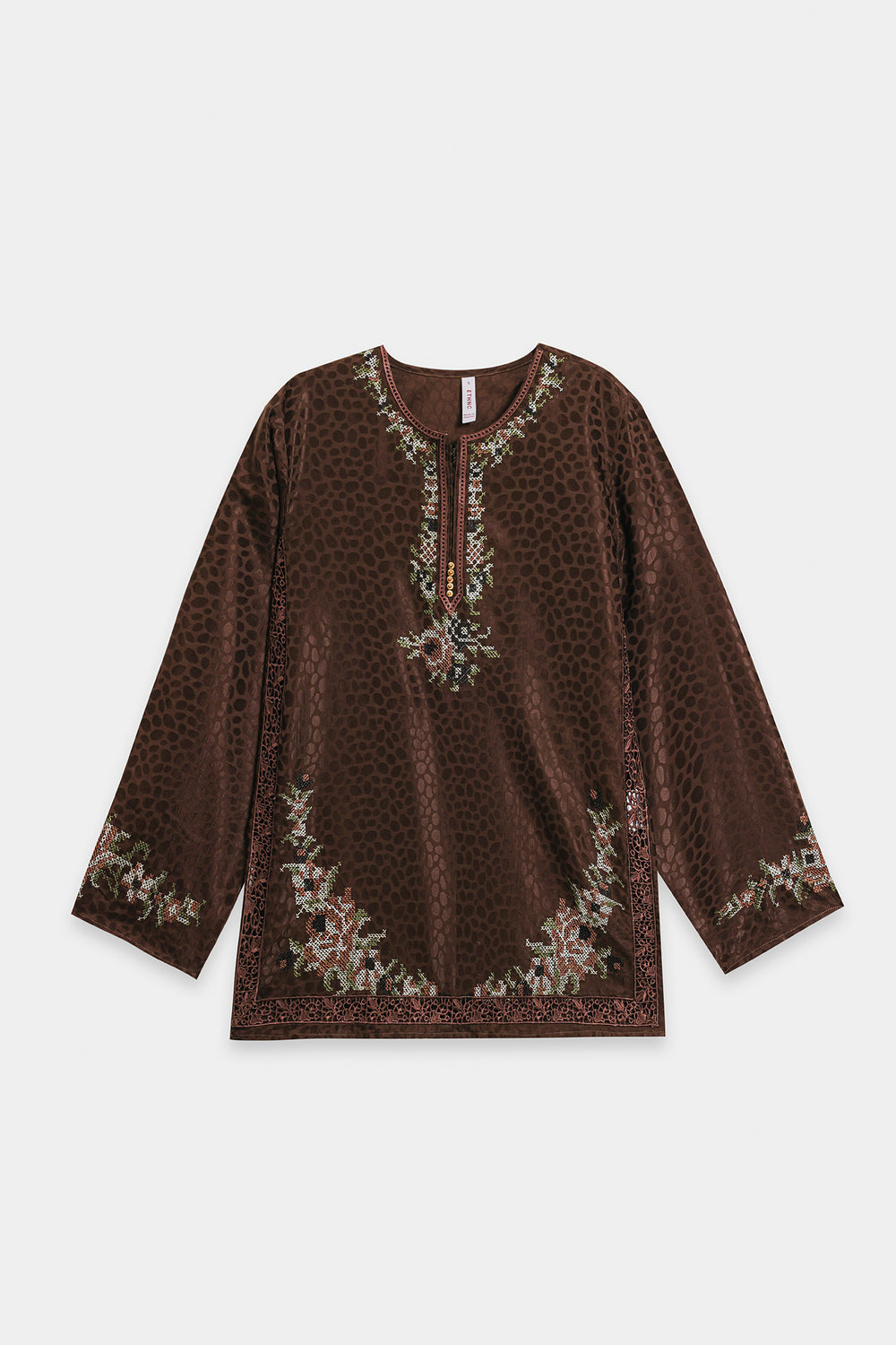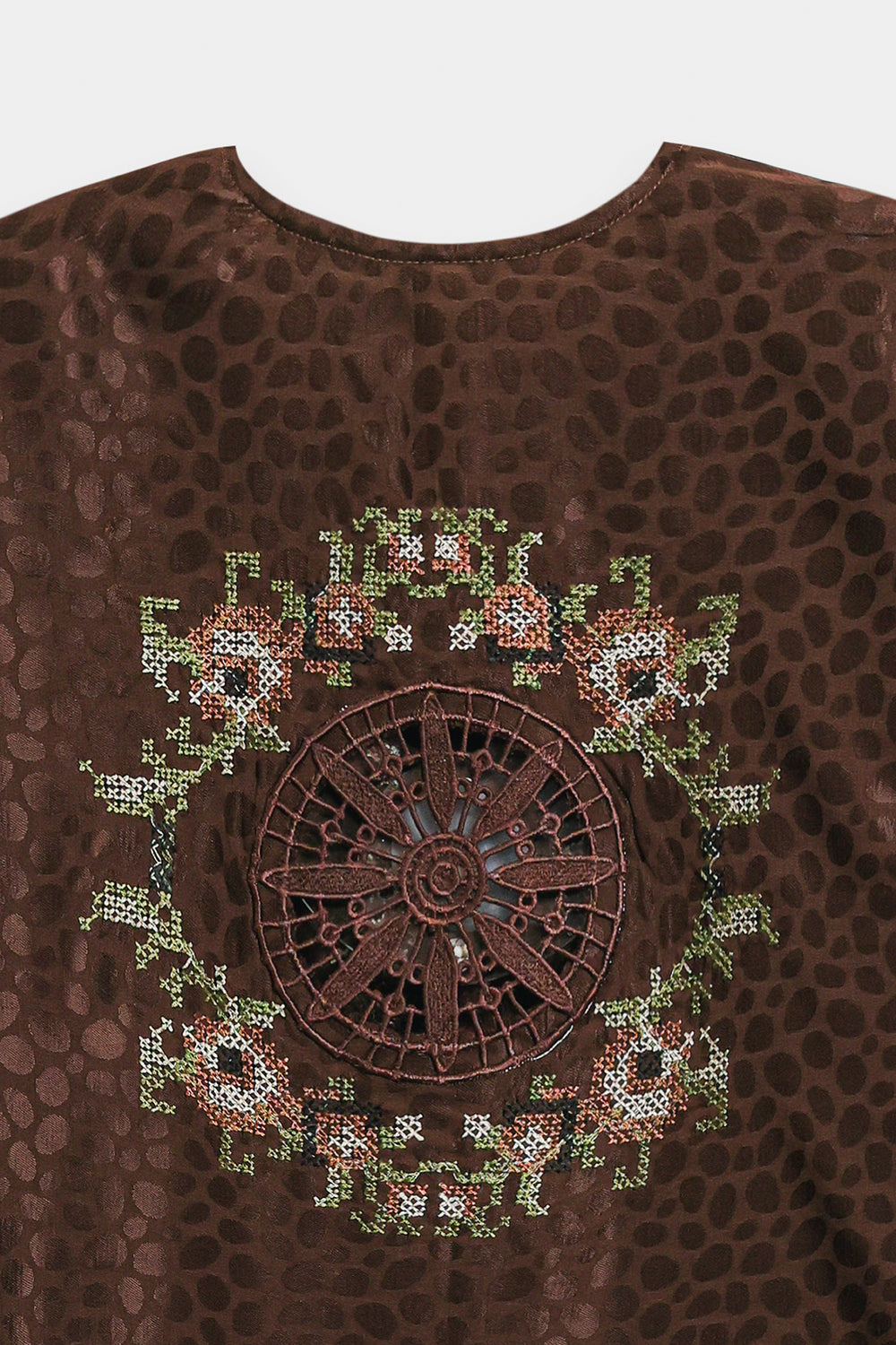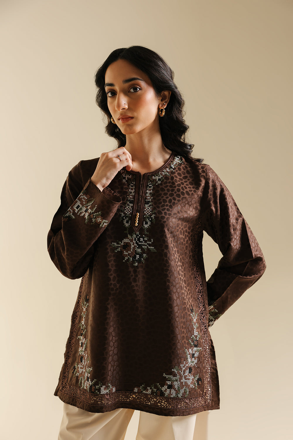 Infuse your wardrobe with subtle texture and artisanal detail with this captivating top. This medium-length kurti-style shirt is crafted in a rich chocolate brown fabric with a subtle, all-over jacquard print, leopard spot pattern. The garment is further embellished with fine bead and thread embroidery in soft white, blue, and brown tones, elegantly decorating the round-neckline and hem. Paired perfectly with wide cream trouser, this top is a sophisticated blend of contemporary print and delicate traditional craft.