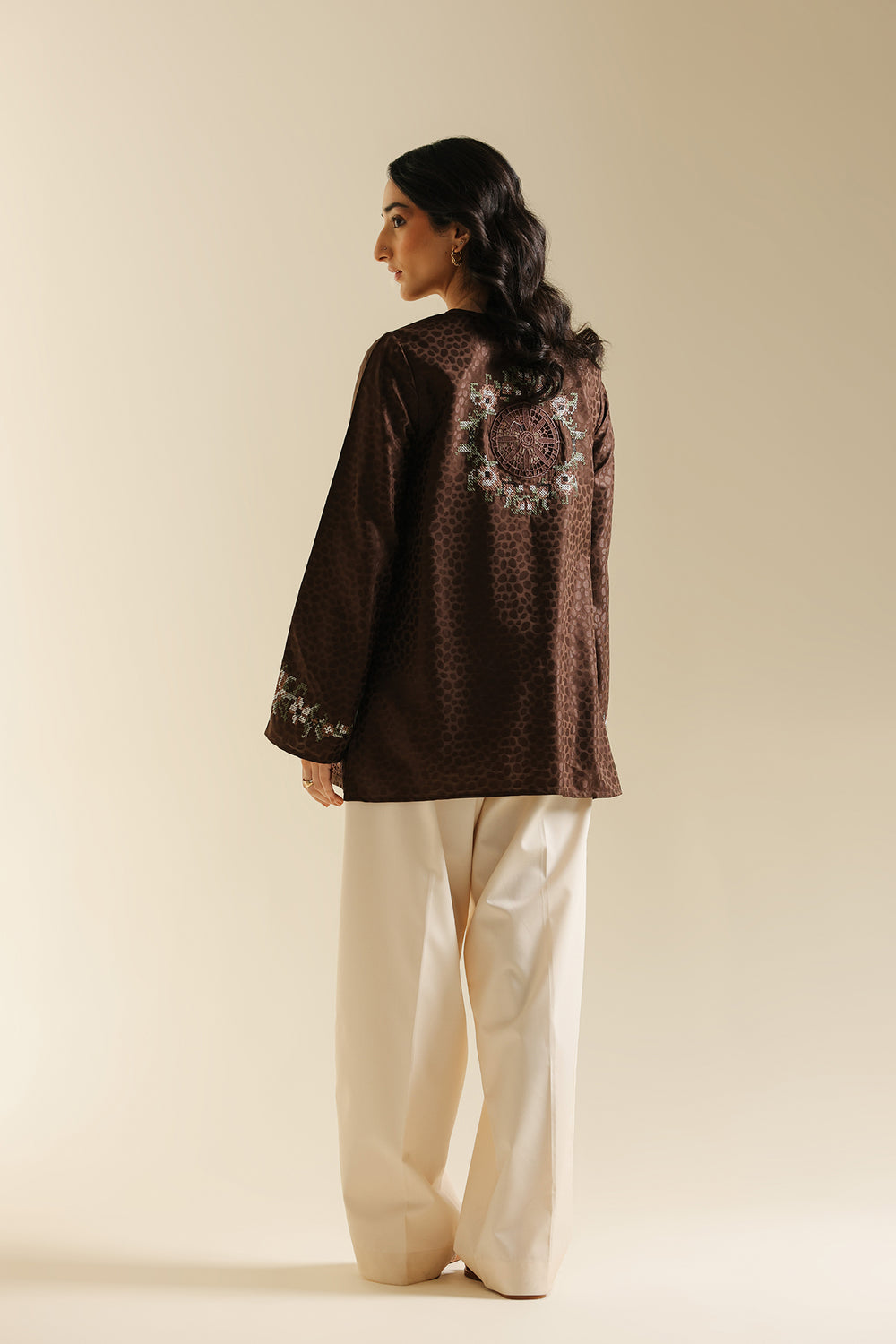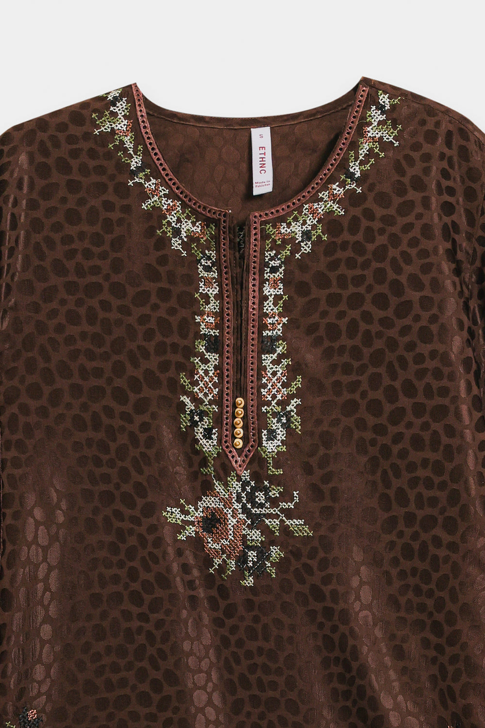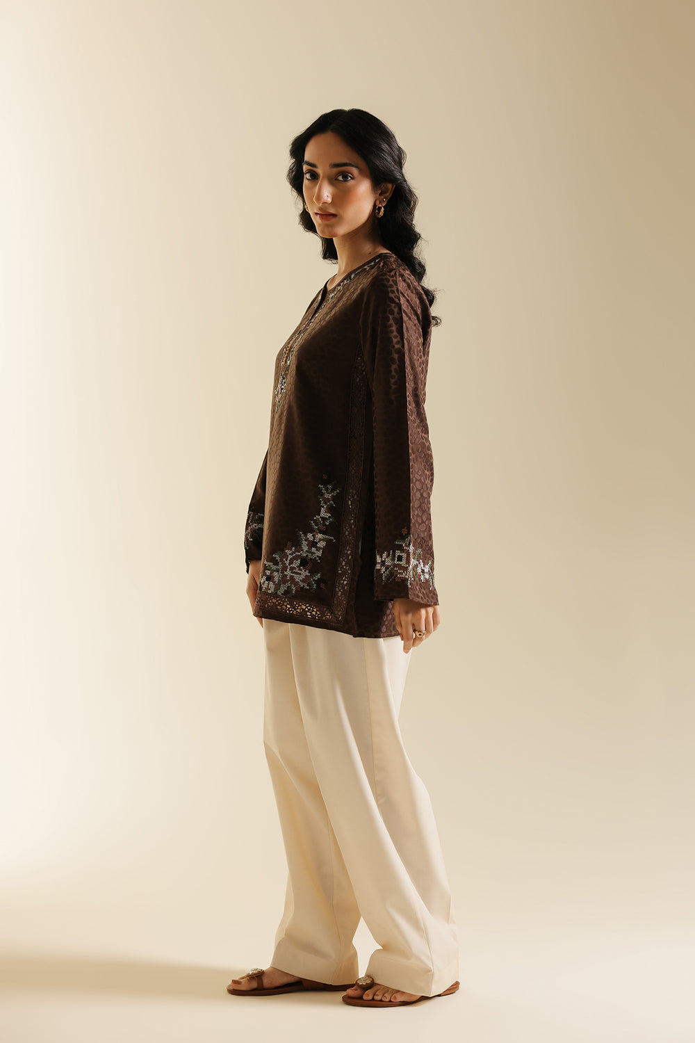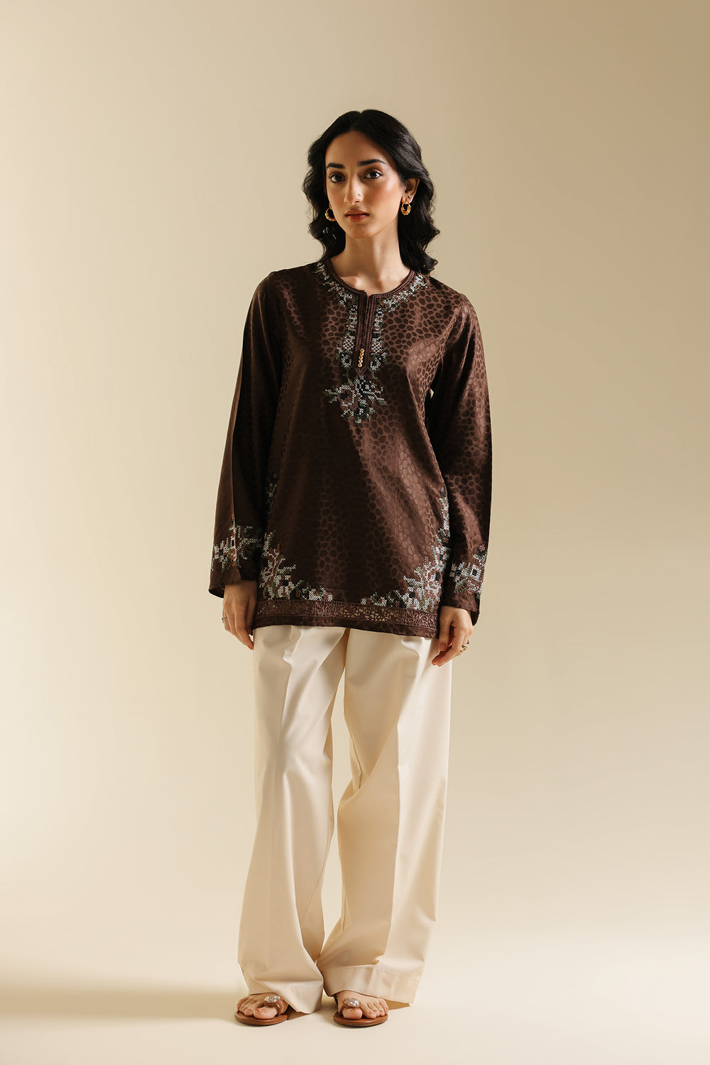 Infuse your wardrobe with subtle texture and artisanal detail with this captivating top. This medium-length kurti-style shirt is crafted in a rich chocolate brown fabric with a subtle, all-over jacquard print, leopard spot pattern. The garment is further embellished with fine bead and thread embroidery in soft white, blue, and brown tones, elegantly decorating the round-neckline and hem. Paired perfectly with wide cream trouser, this top is a sophisticated blend of contemporary print and delicate traditional craft.
