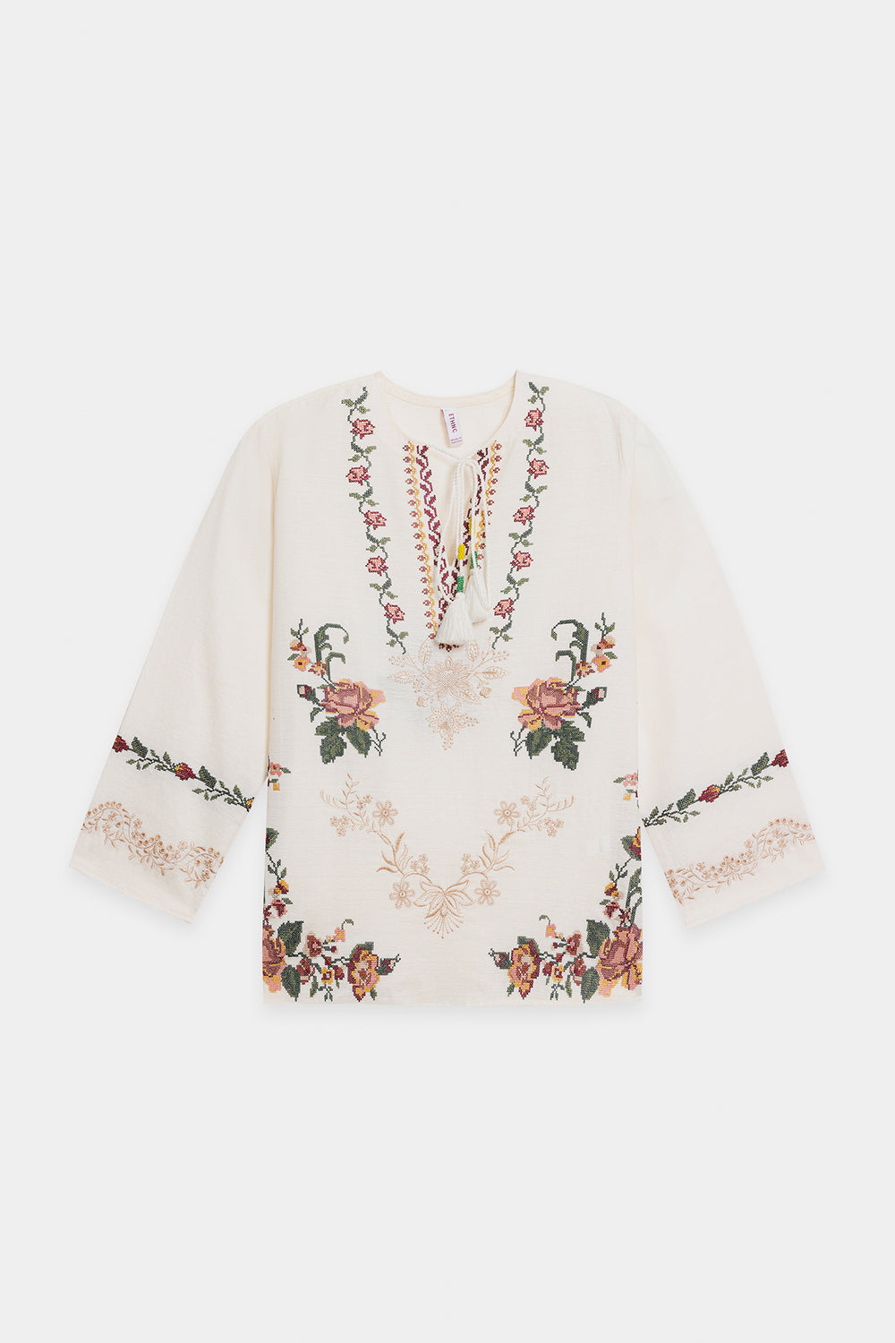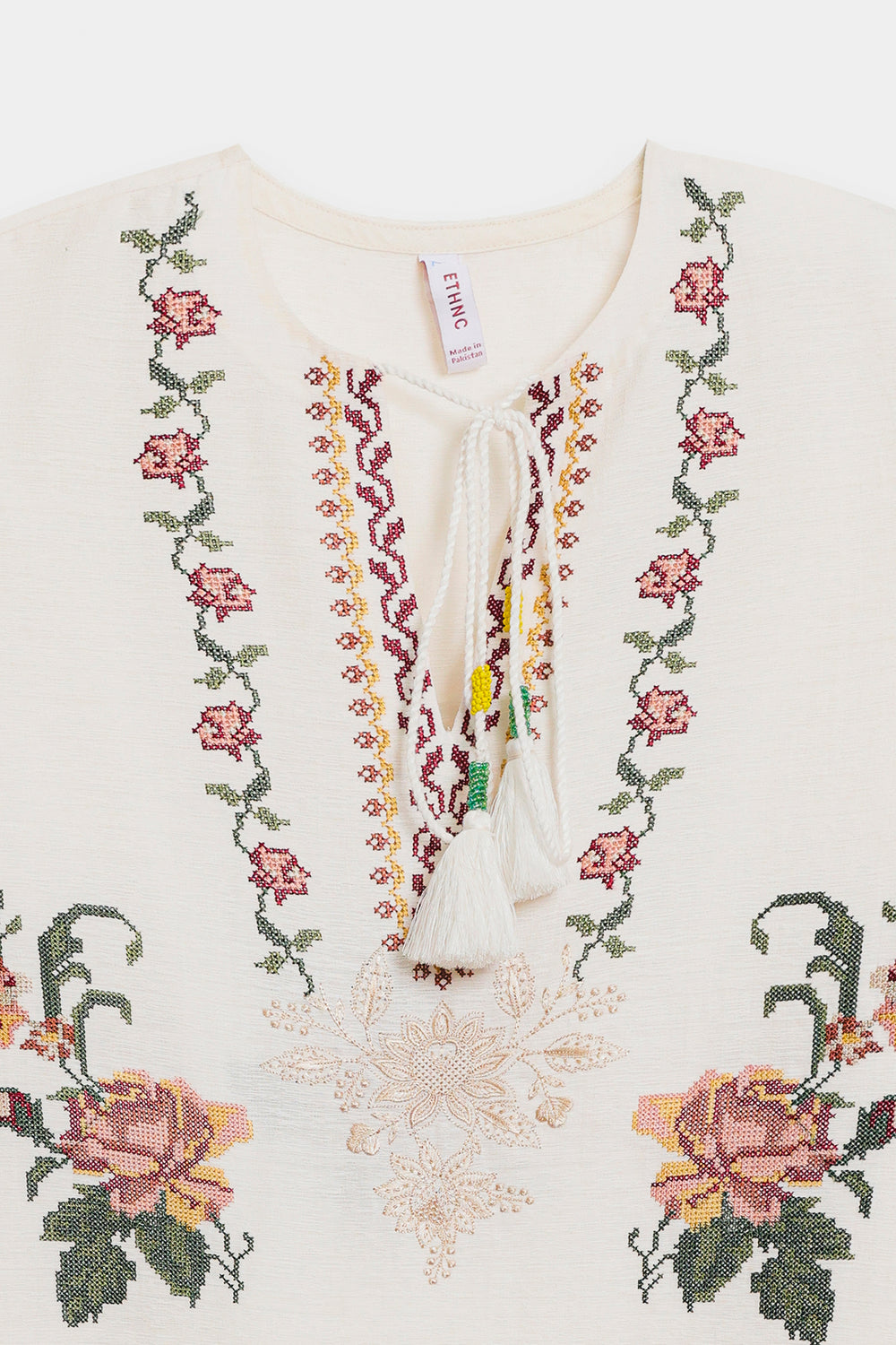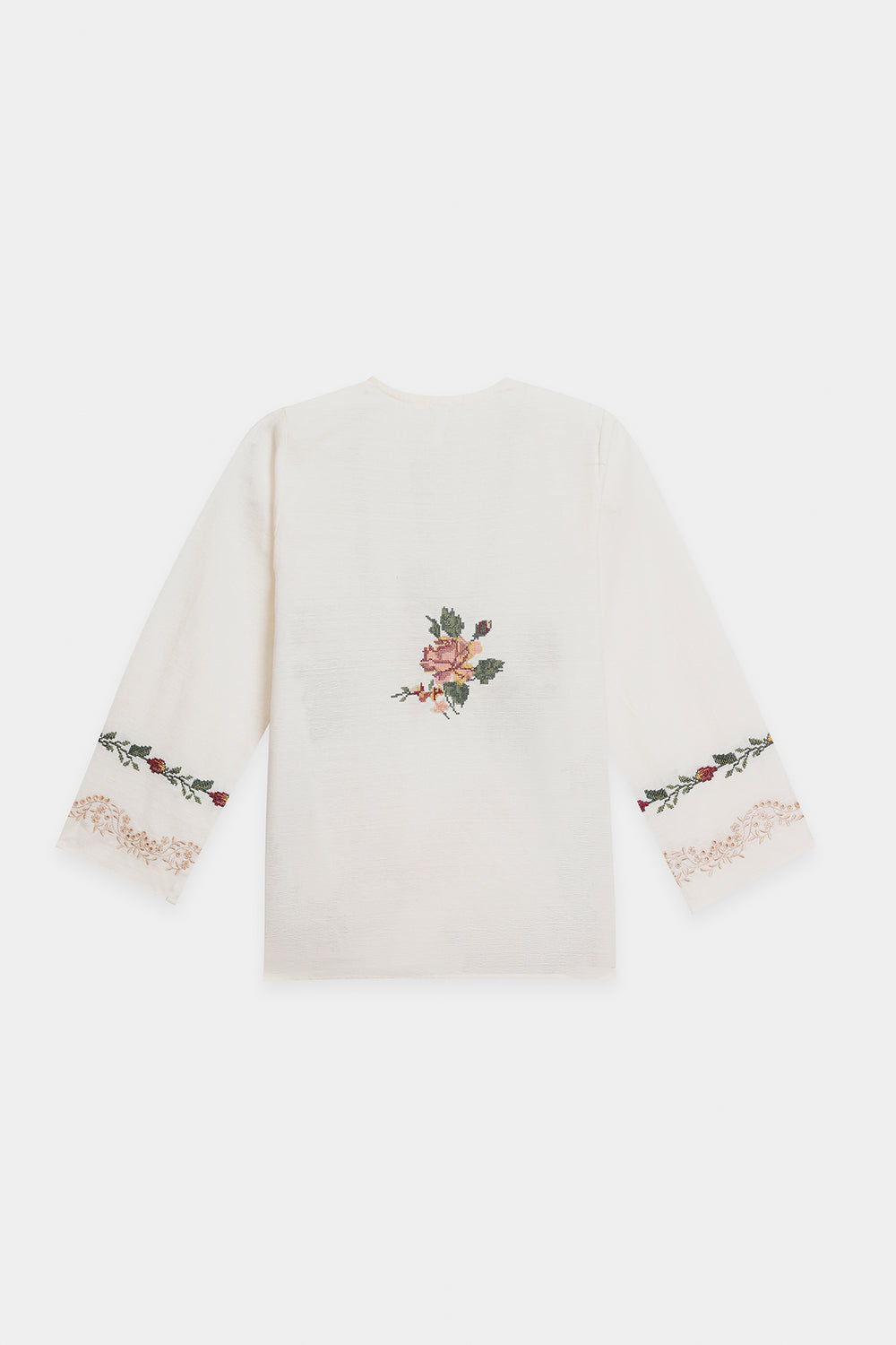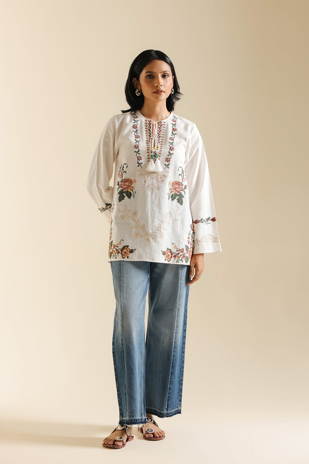 Capture an airy, artisanal look with this beautiful top. This short-length kurti-style shirt is made from a crisp solid white fabric and is beautifully adorned with rich multicolored floral embroidery. The embroidery, featuring shades of red, green, and mustard yellow, is concentrated on the chest and shoulders. It is designed with a slit-neckline, and is finished with a charming decorative tasseled tie. Paired effortlessly with wide-leg denim trousers, this top is the perfect piece to blend traditional craft with a modern, casual aesthetic.
