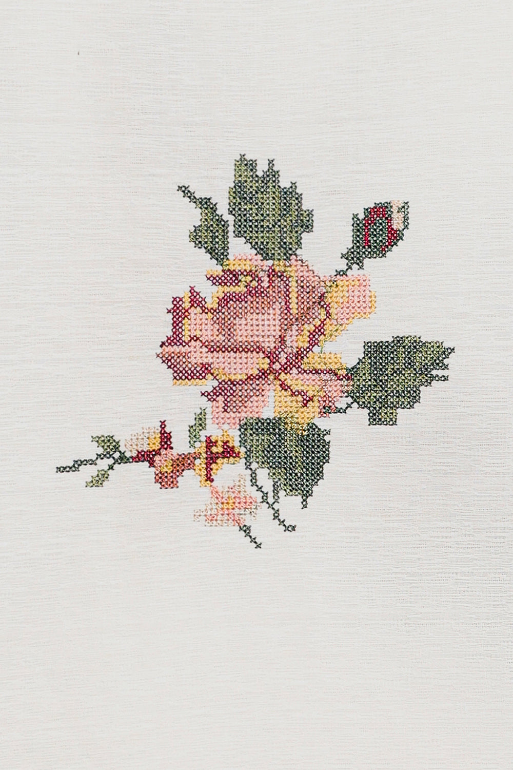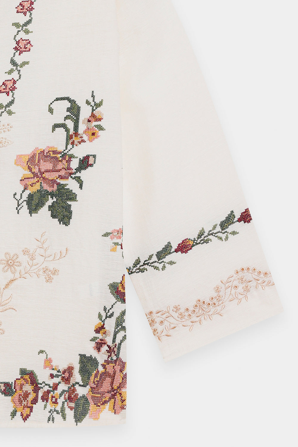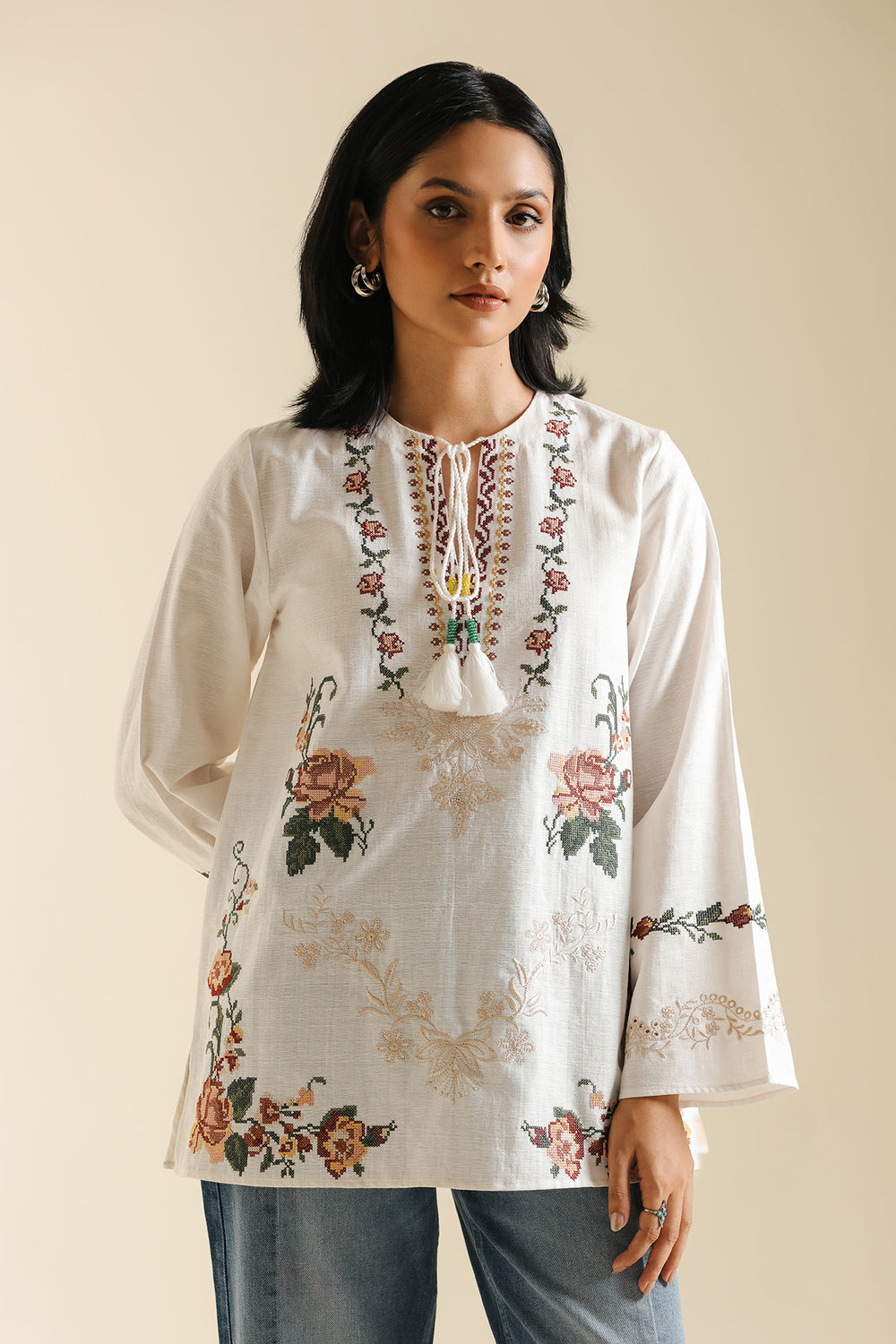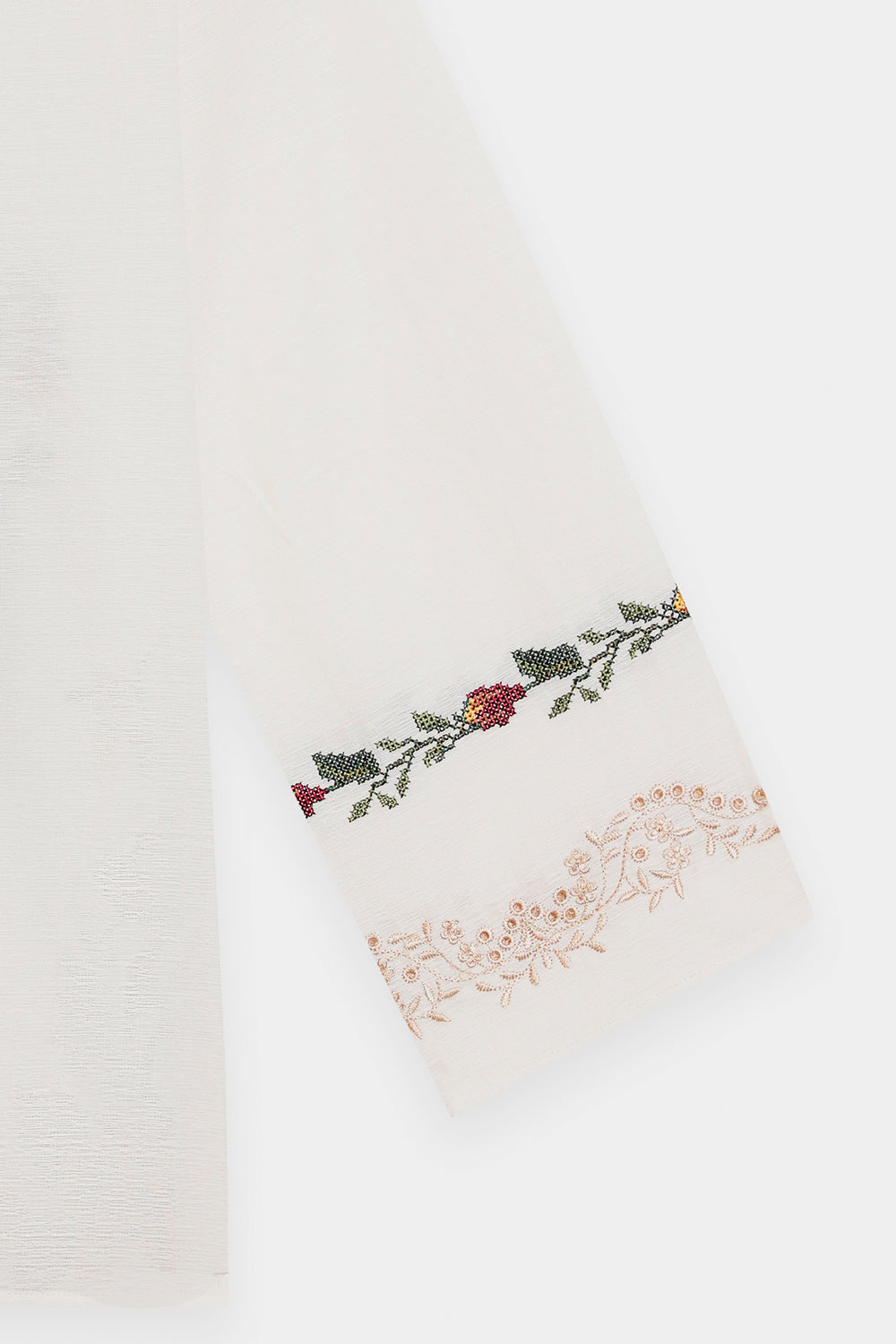 Capture an airy, artisanal look with this beautiful top. This short-length kurti-style shirt is made from a crisp solid white fabric and is beautifully adorned with rich multicolored floral embroidery. The embroidery, featuring shades of red, green, and mustard yellow, is concentrated on the chest and shoulders. It is designed with a slit-neckline, and is finished with a charming decorative tasseled tie. Paired effortlessly with wide-leg denim trousers, this top is the perfect piece to blend traditional craft with a modern, casual aesthetic.