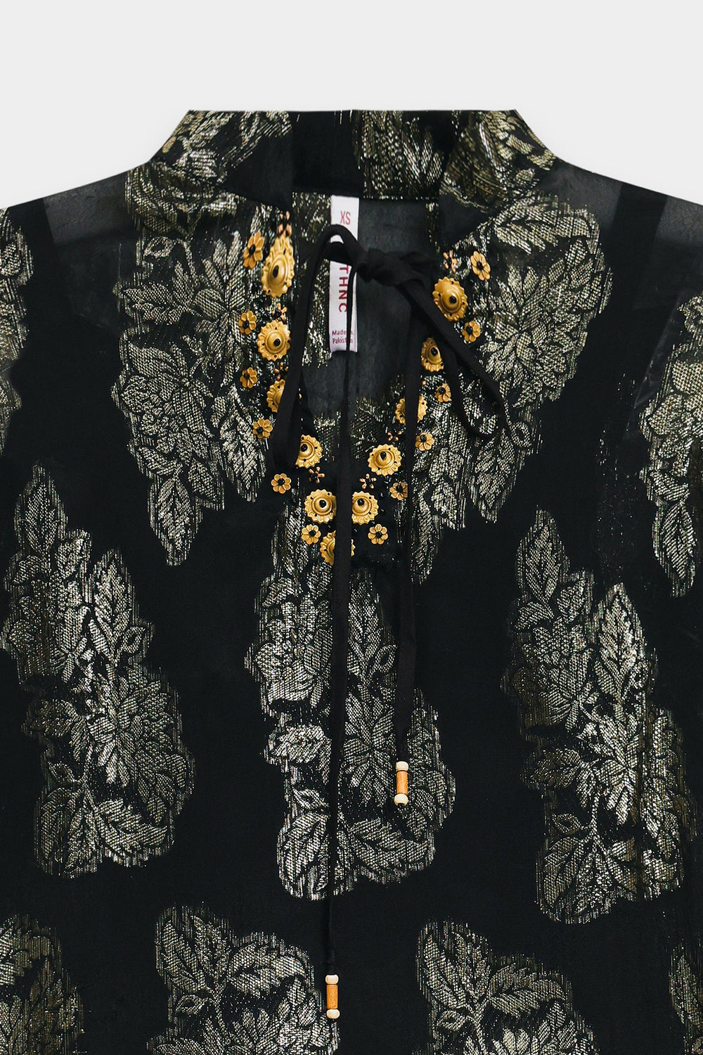 Embrace authentic cultural expression with this expertly crafted short top. Rendered in deep black color, it showcases meticulous motifs printed in embossed gold shade with traditional folk-art sensibilities. The garment features generously proportioned sleeves and an easy, unstructured fit that prioritises comfort and movement. A decorative beaded neckline detail completes the piece. This top exemplifies refined artisanal construction, delivering a sophisticated interplay of high-contrast elements and time-honored techniques that elevate any wardrobe. It comes paired with an inner slip for a complete look that defines grace and style.